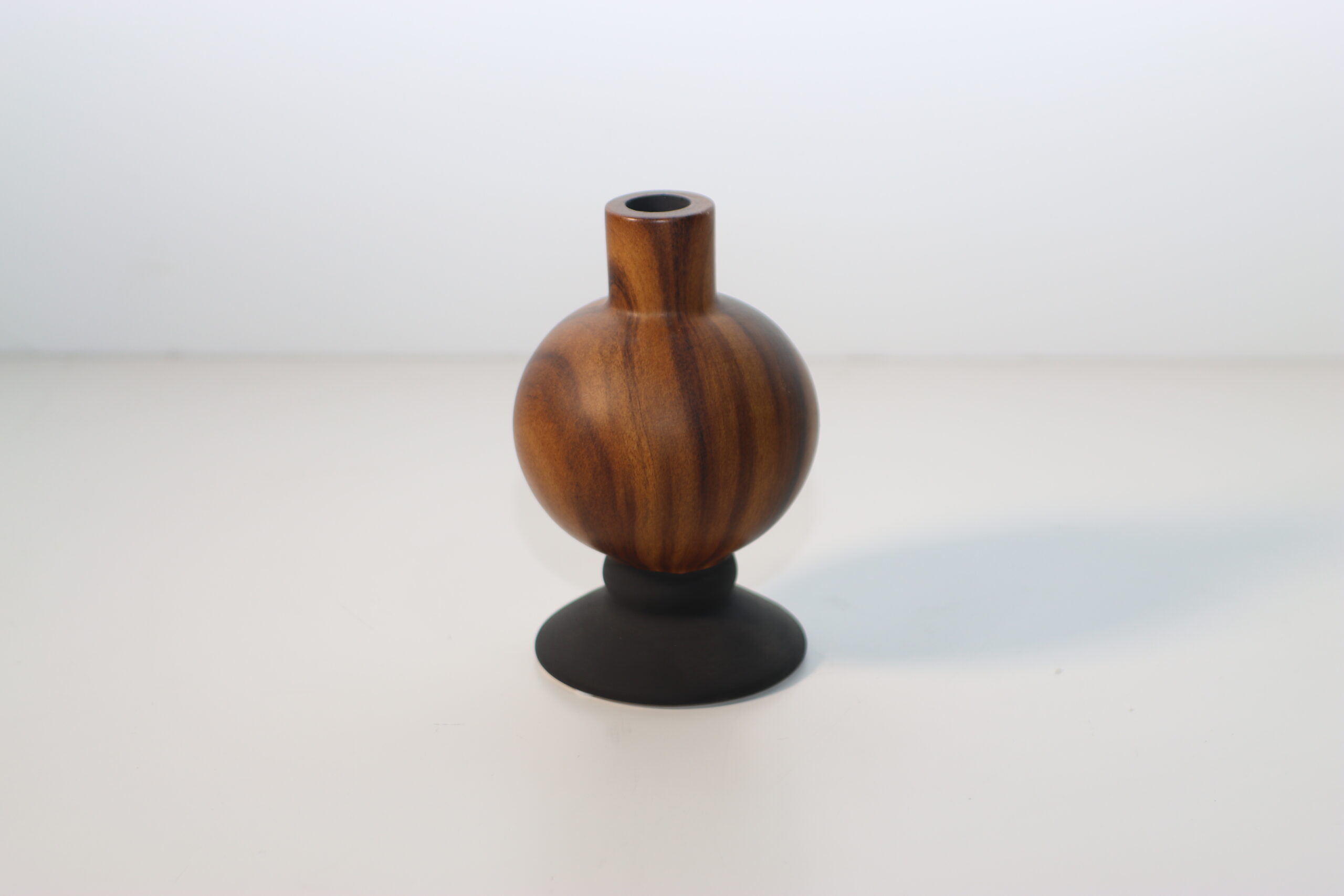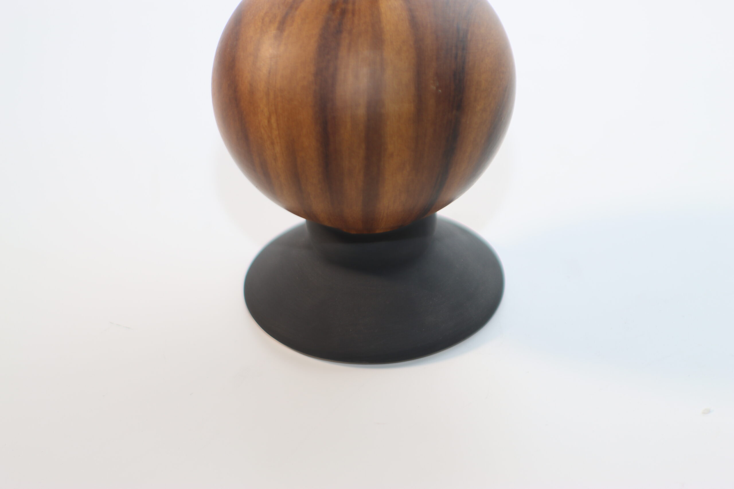 美しい木目が際立つ「球体」のウッドボディを、安定感のあるブラックセラミックの台座で支えた、彫刻的な美しさを誇るキャンドルスタンドです。