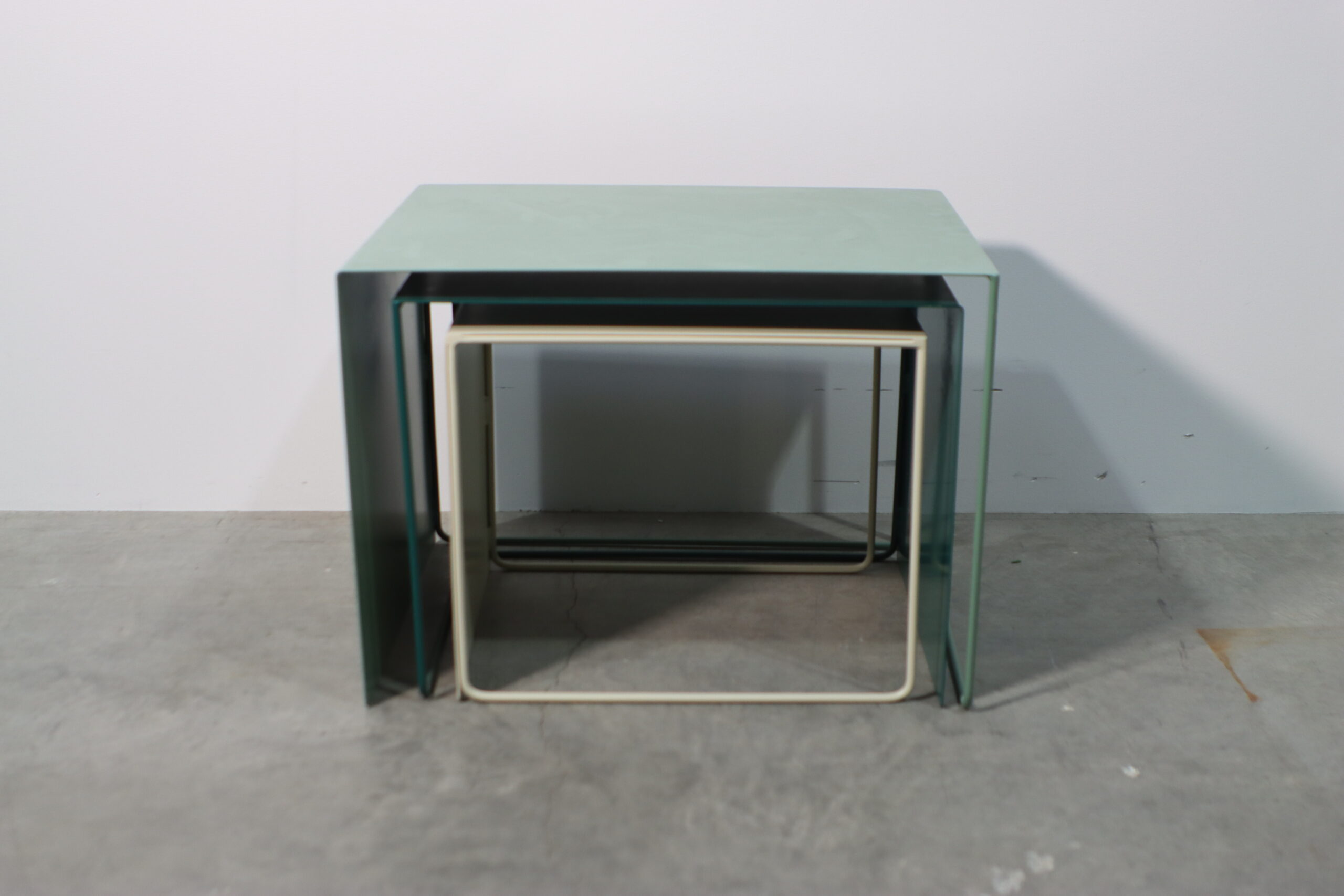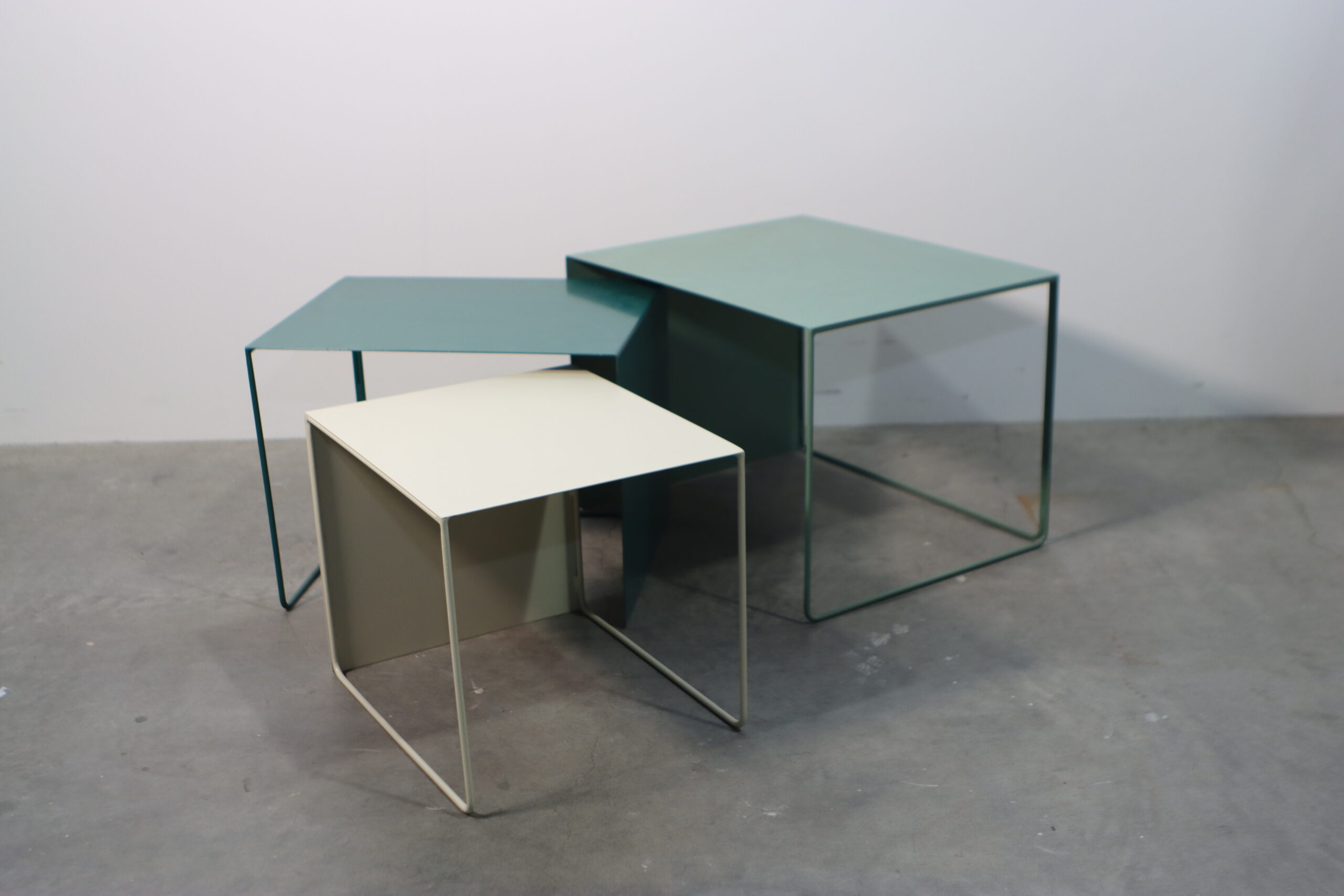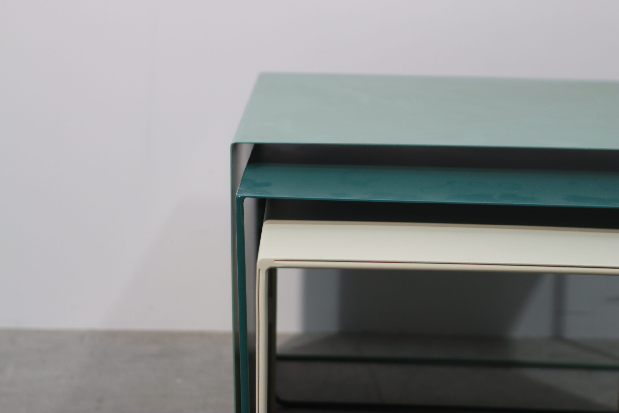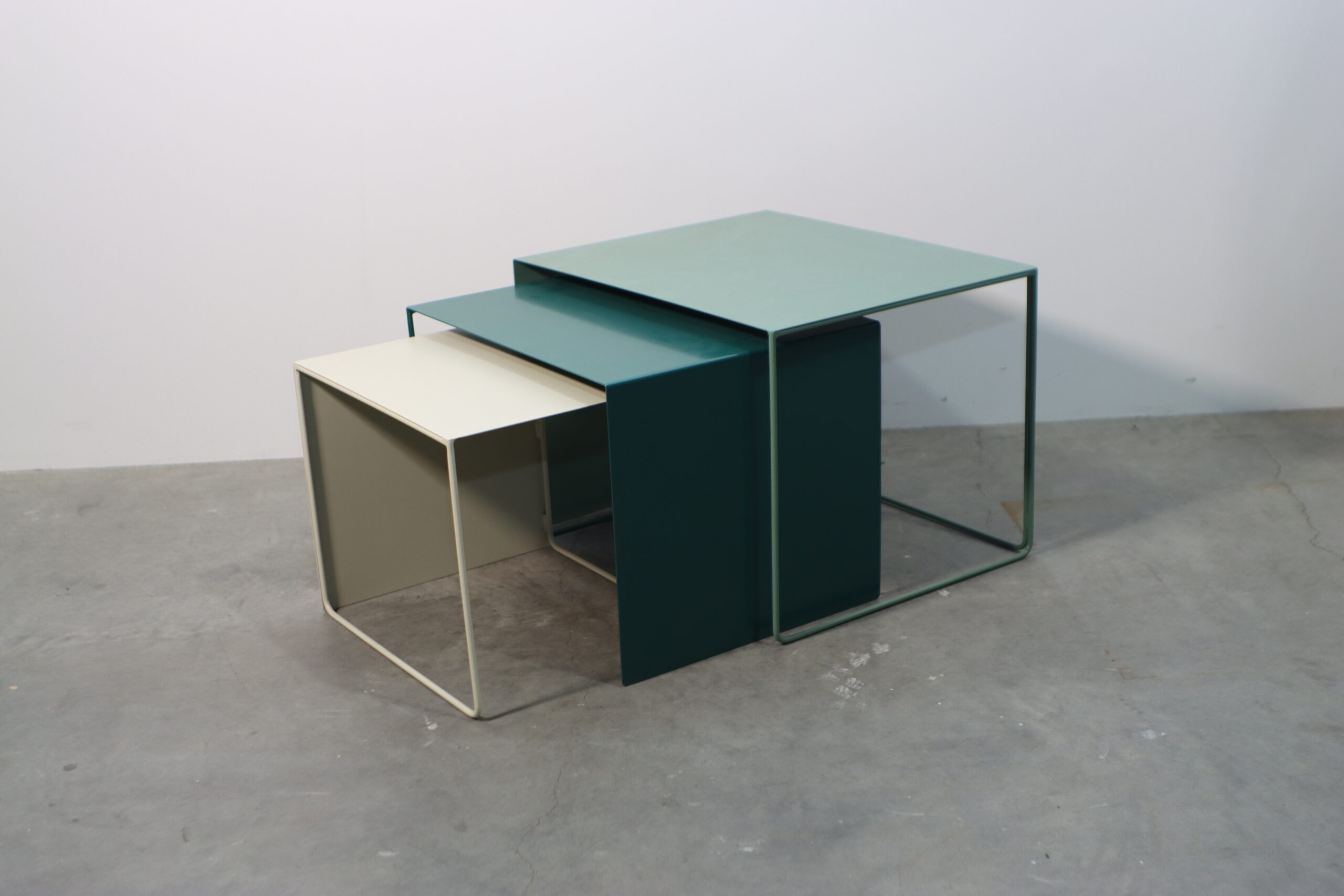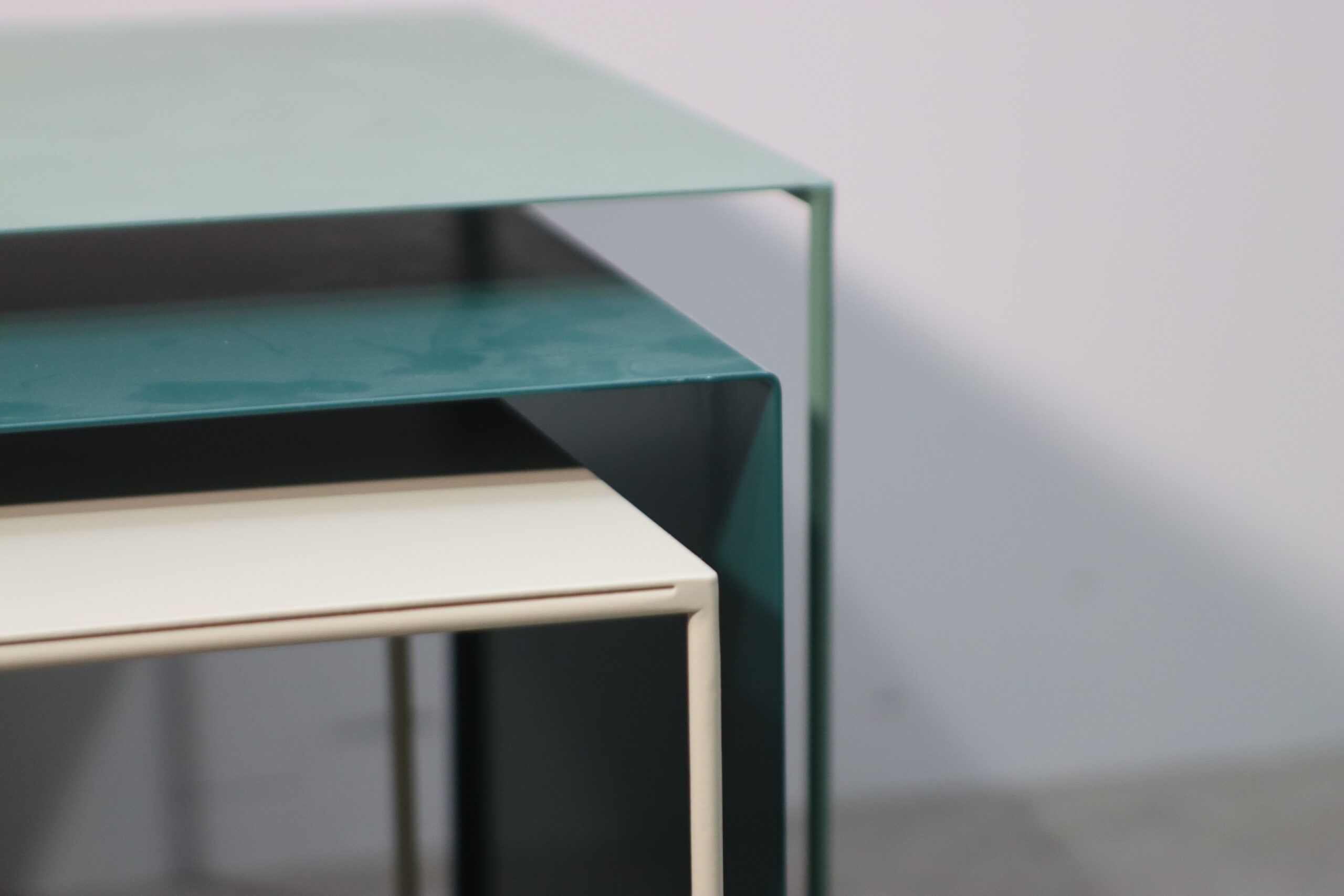 モダン・ネストテーブル・3点SETは、コの字型に曲げられた薄いスチール板によるミニマルな造形が特徴で、空間に「シャープな緊張感」と「都会的な美学」を付与します。