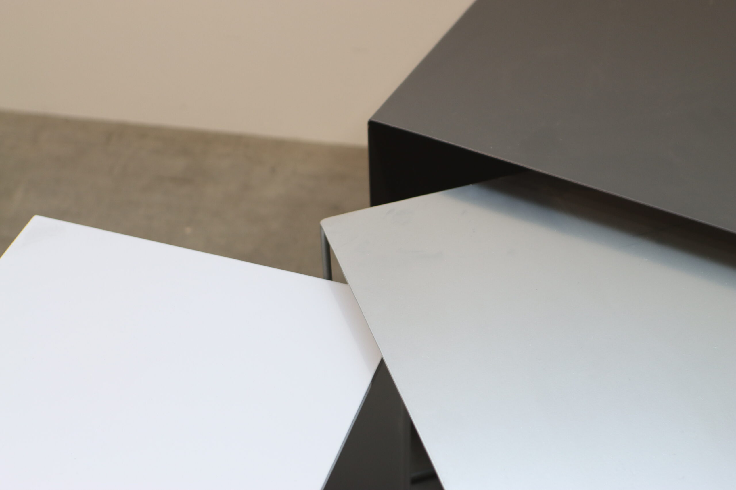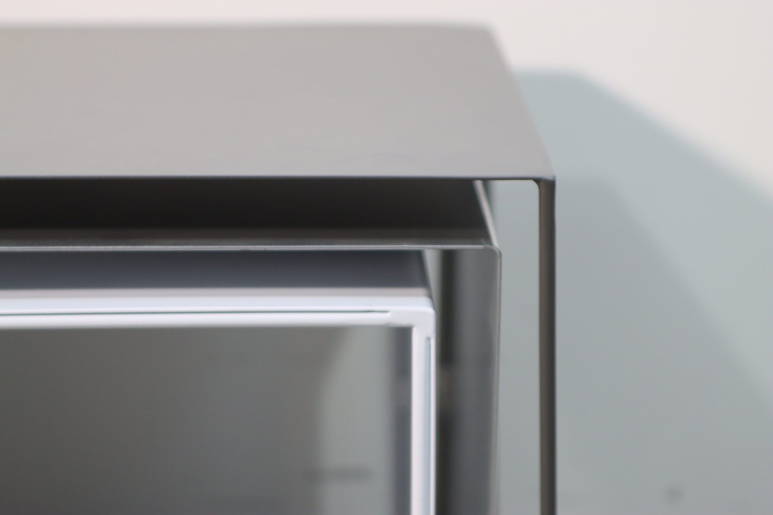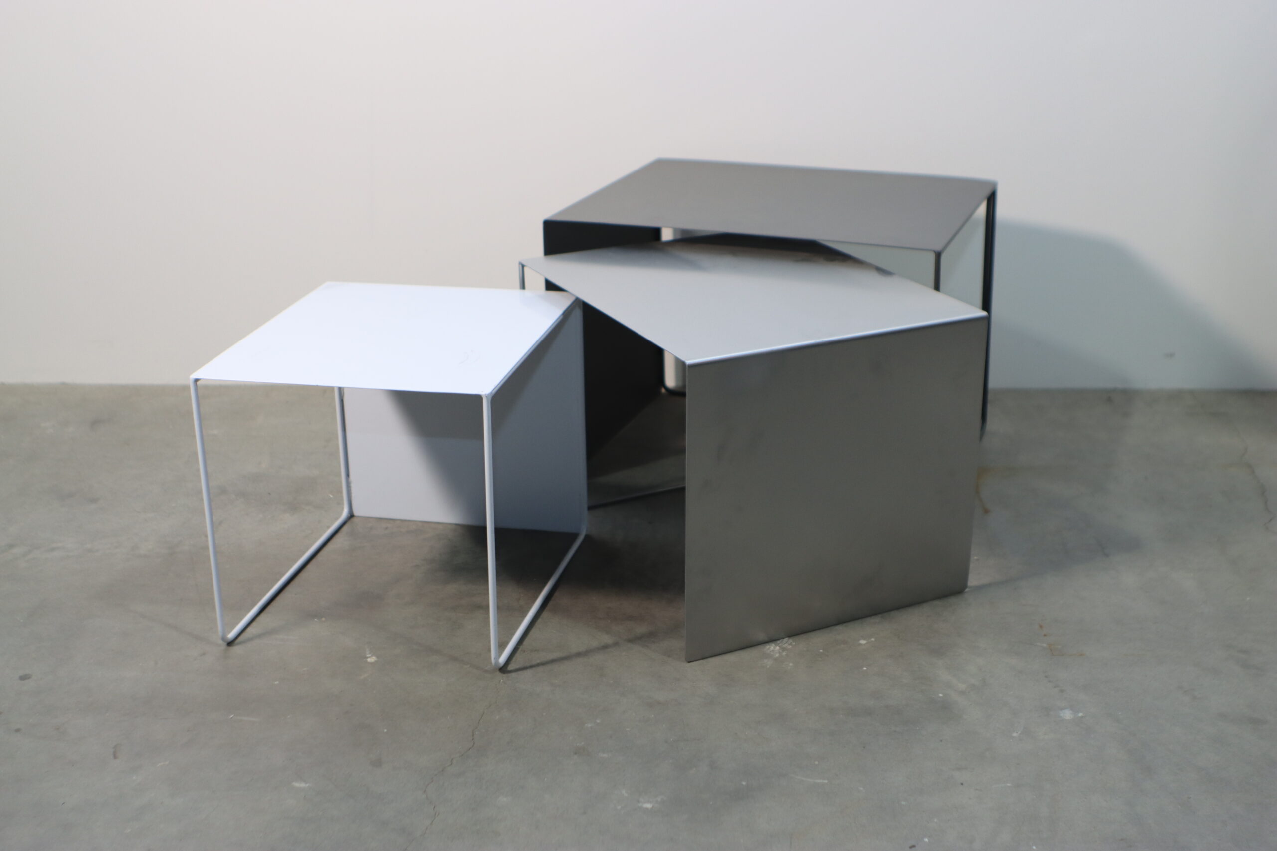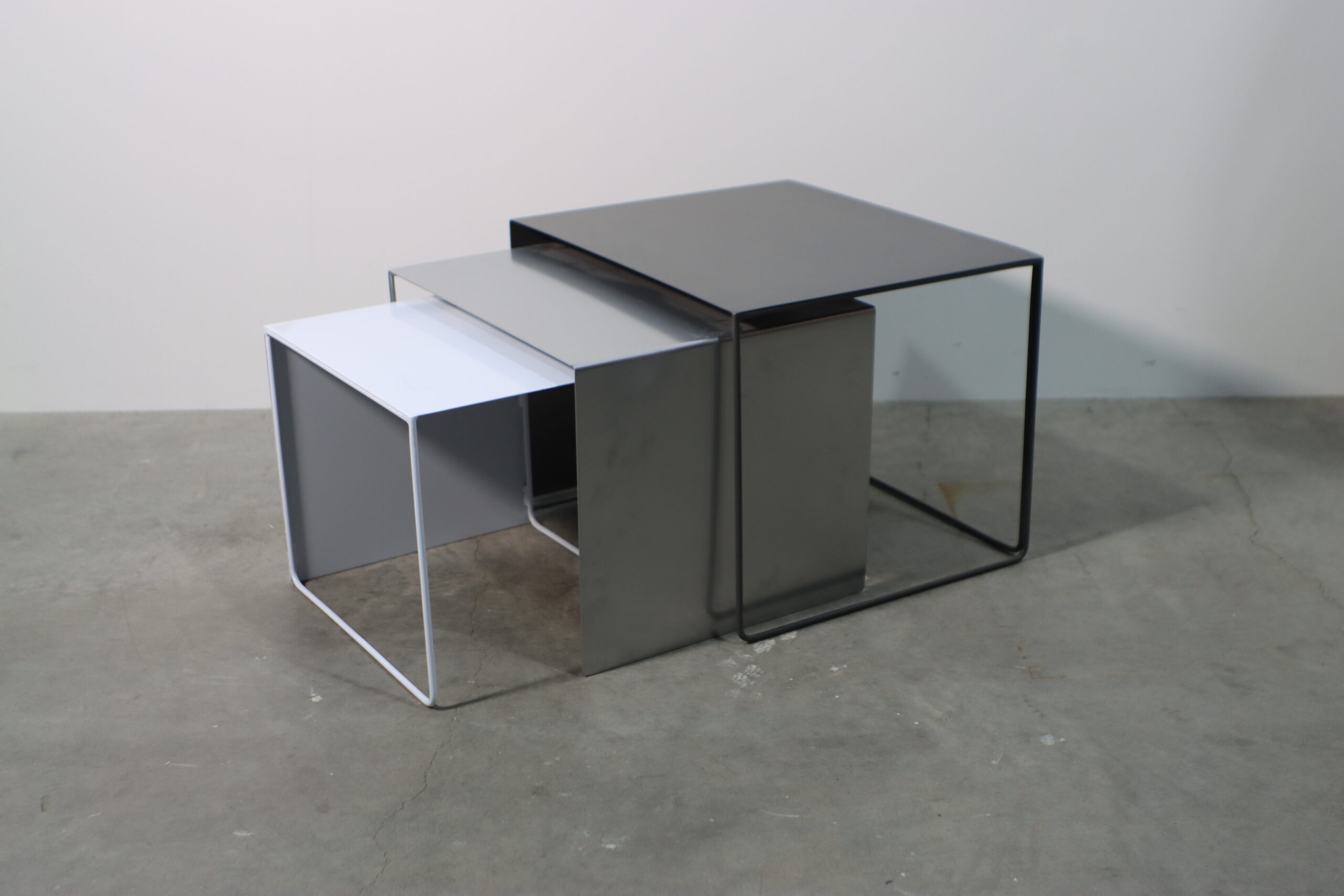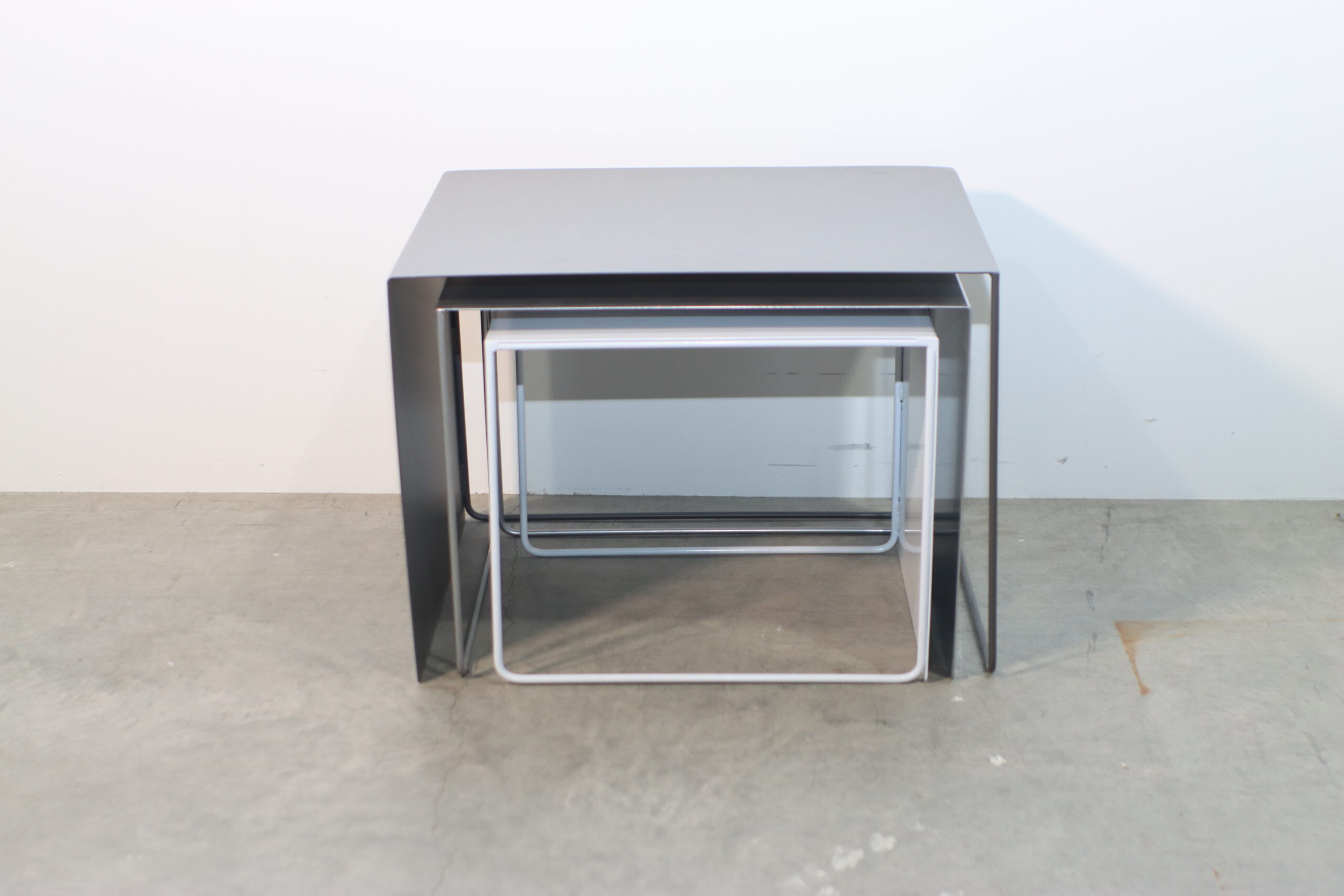 モダン・ネストテーブル・3点SETは、コの字型に曲げられた薄いスチール板によるミニマルな造形が特徴で、空間に「シャープな緊張感」と「都会的な美学」を付与します。