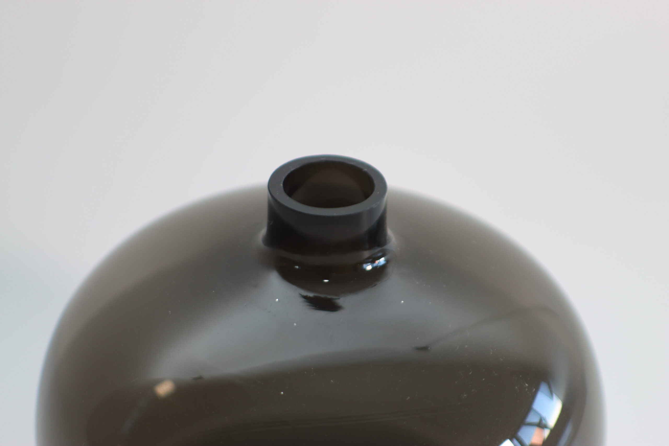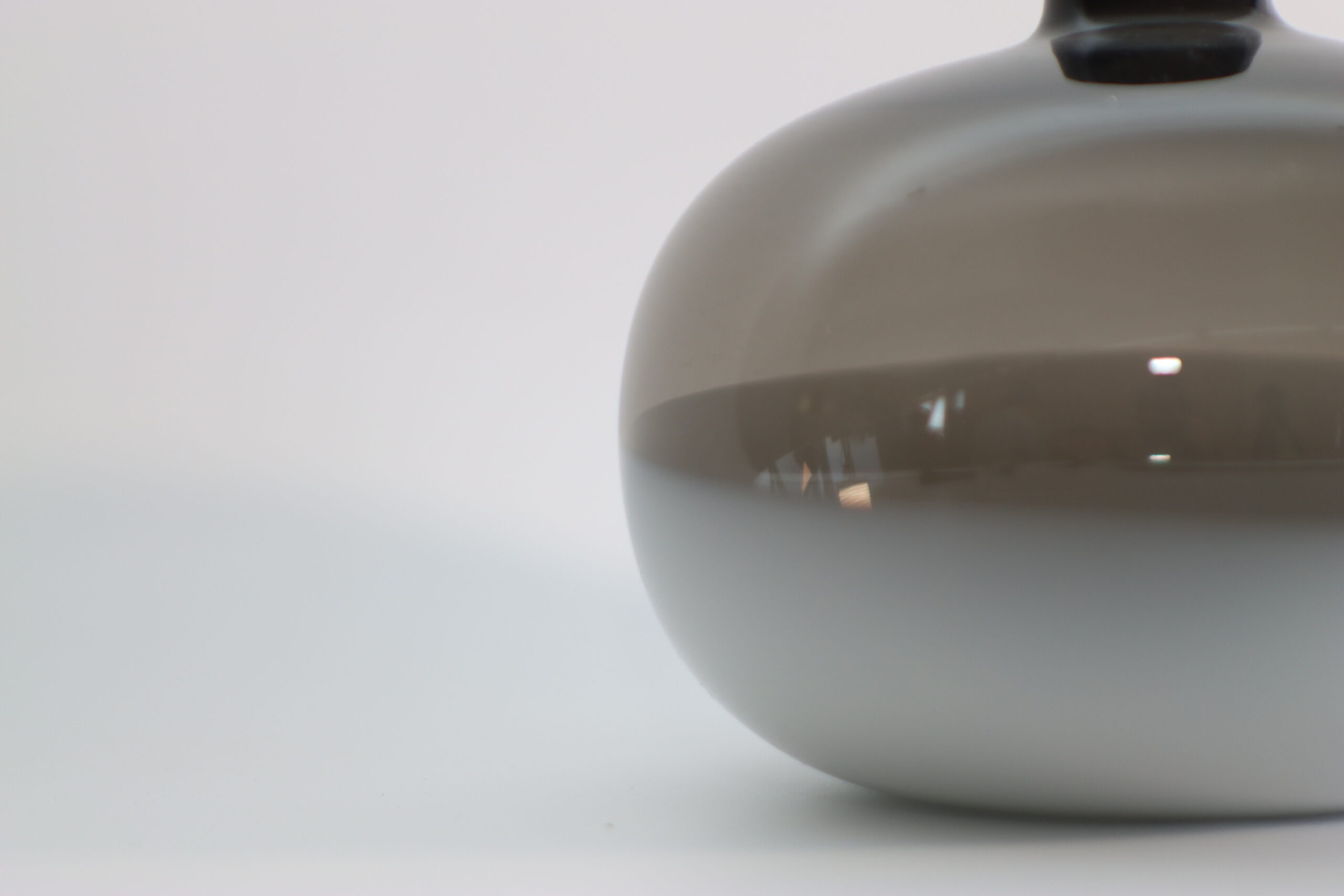 スモークガラスの落ち着いた色味が印象的な、低重心フォルムのフラワーベース。