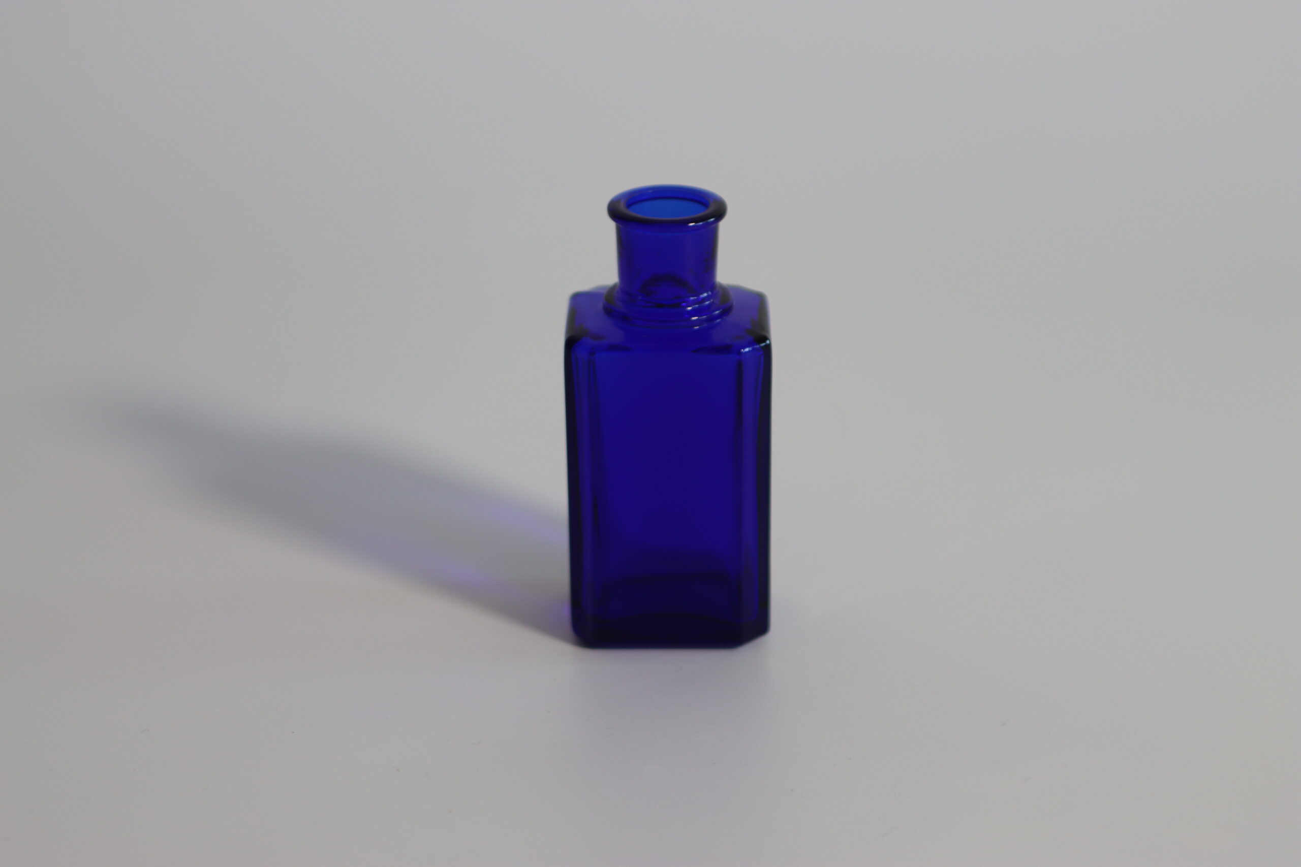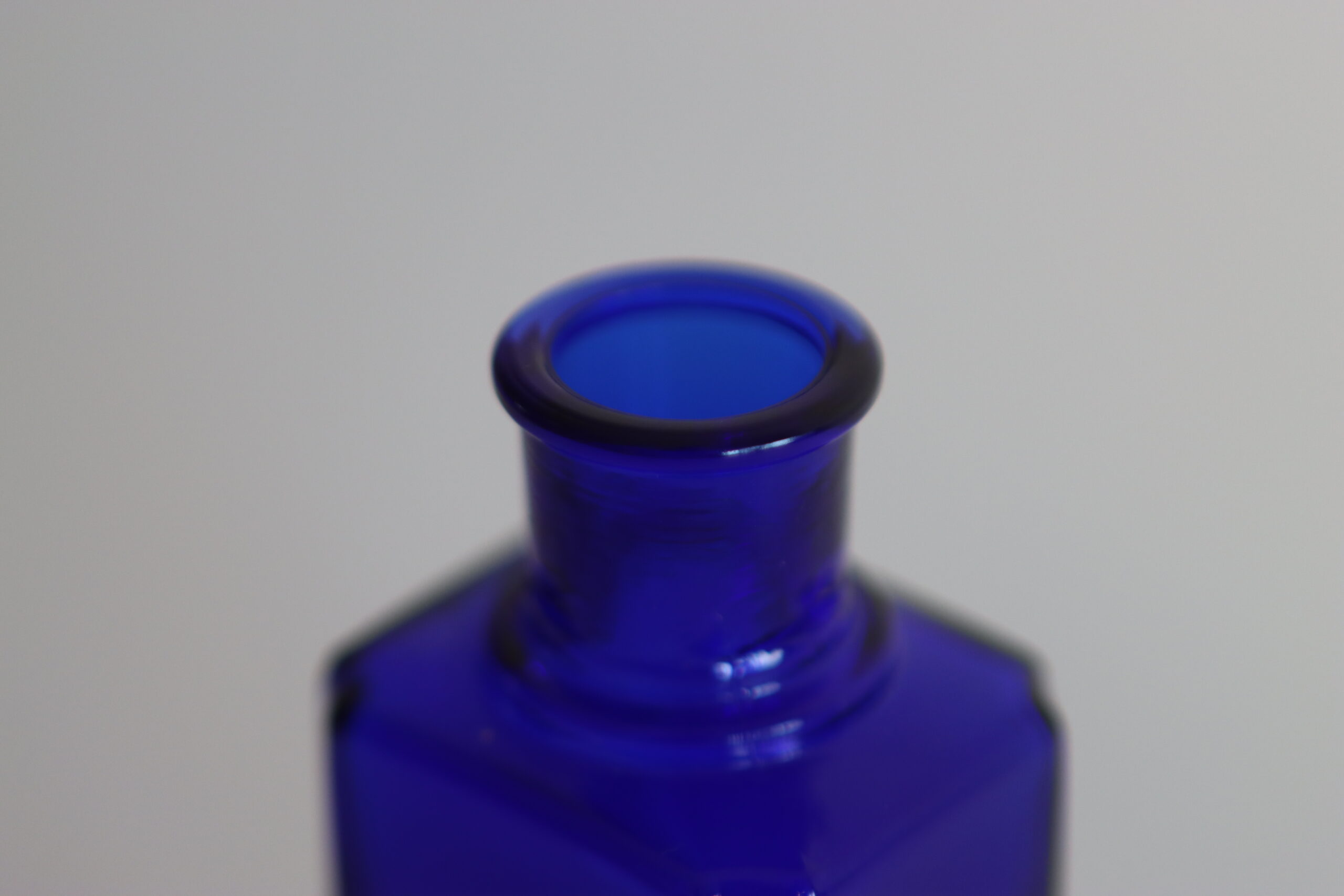 深みのあるブルーガラスが印象的な、コンパクトなフラワーベース。