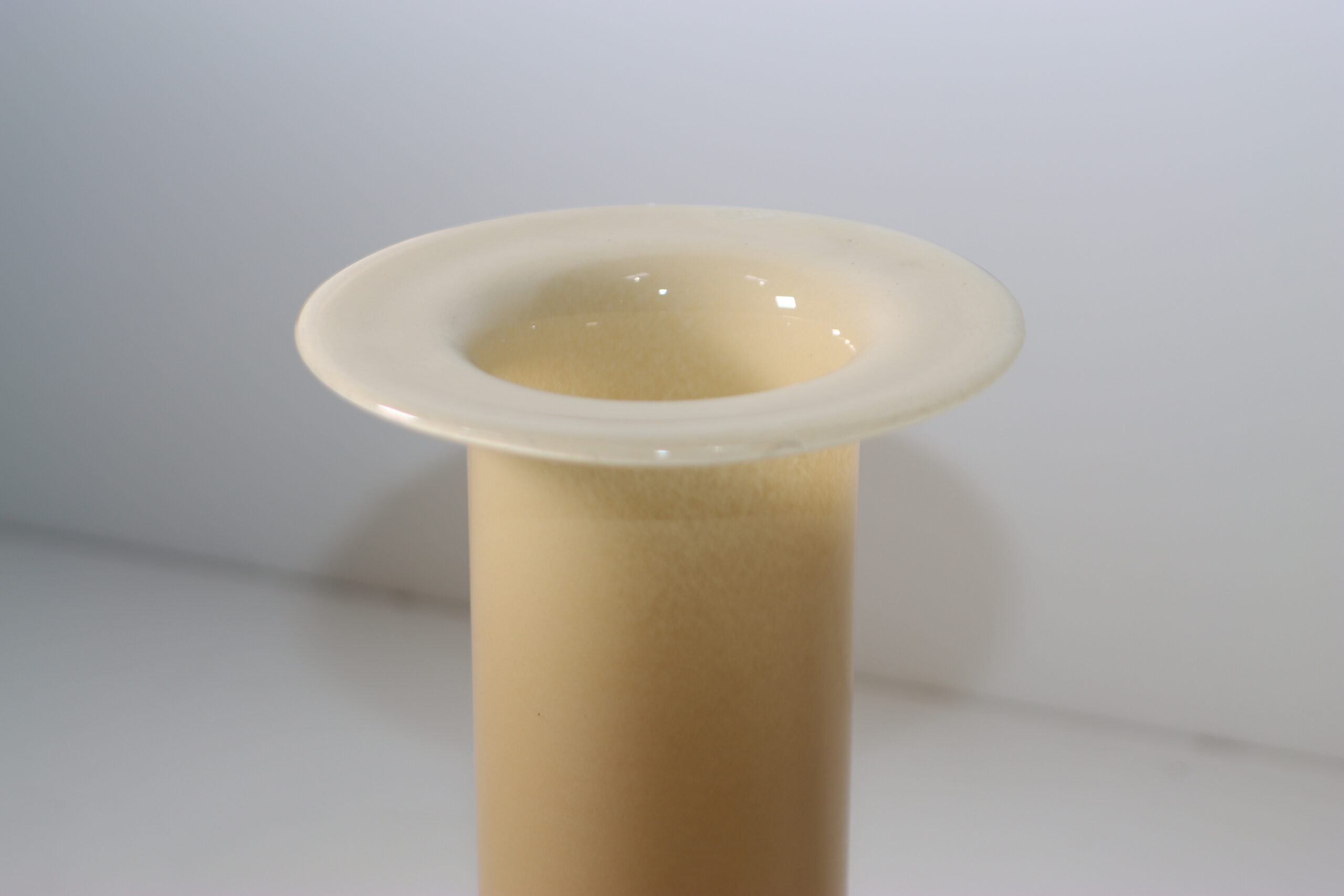 【注意事項】 本製品は繊細なガラス工芸品であり、光の透過具合によってアンバーの色の深みが繊細に変化する特性があります。表面のマットで柔らかな光沢を損なわないよう、お手入れの際は研磨剤を避け、柔らかい布で優しく埃を払うことを推奨いたします。また、特徴的な広幅のリムは、設置場所によっては視覚的な張り出しが大きくなるため、安定した広い平面への設置が不可欠です。