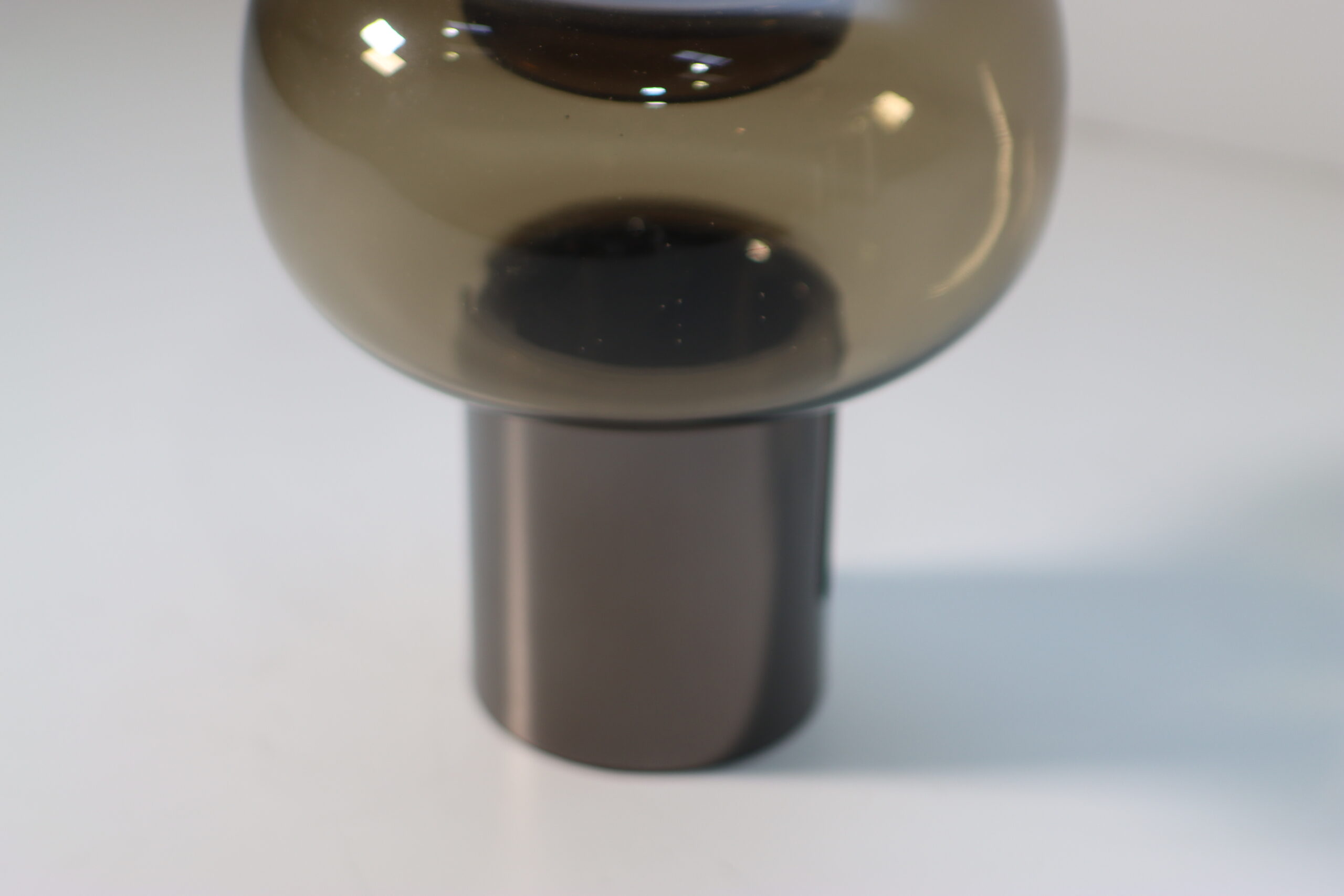 鏡面のように磨き上げられたメタリックな質感をベースに、重厚なスモークガラスのバルーン部を組み合わせることで、空間に「先進的な高級感」と圧倒的なマテリアルの対比を付与します。