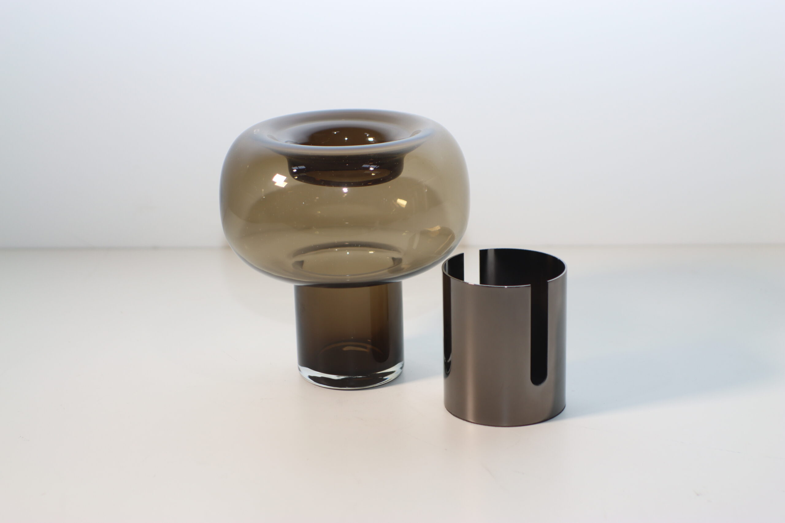 【注意事項】 本製品は、高度な研磨加工と吹きガラス技術を融合させた精密な造形が魅力です。メタリックベースの鏡面仕上げを美しく保つため、指紋や微細な埃は専用のクロスで優しく拭き取るメンテナンスを推奨いたします。また、特徴的なオーバーサイズのボウル部は、視覚的な軽やかさに対してガラス特有の重量があるため、設置の際はバランスに配慮し、安定した平面でご活用ください。