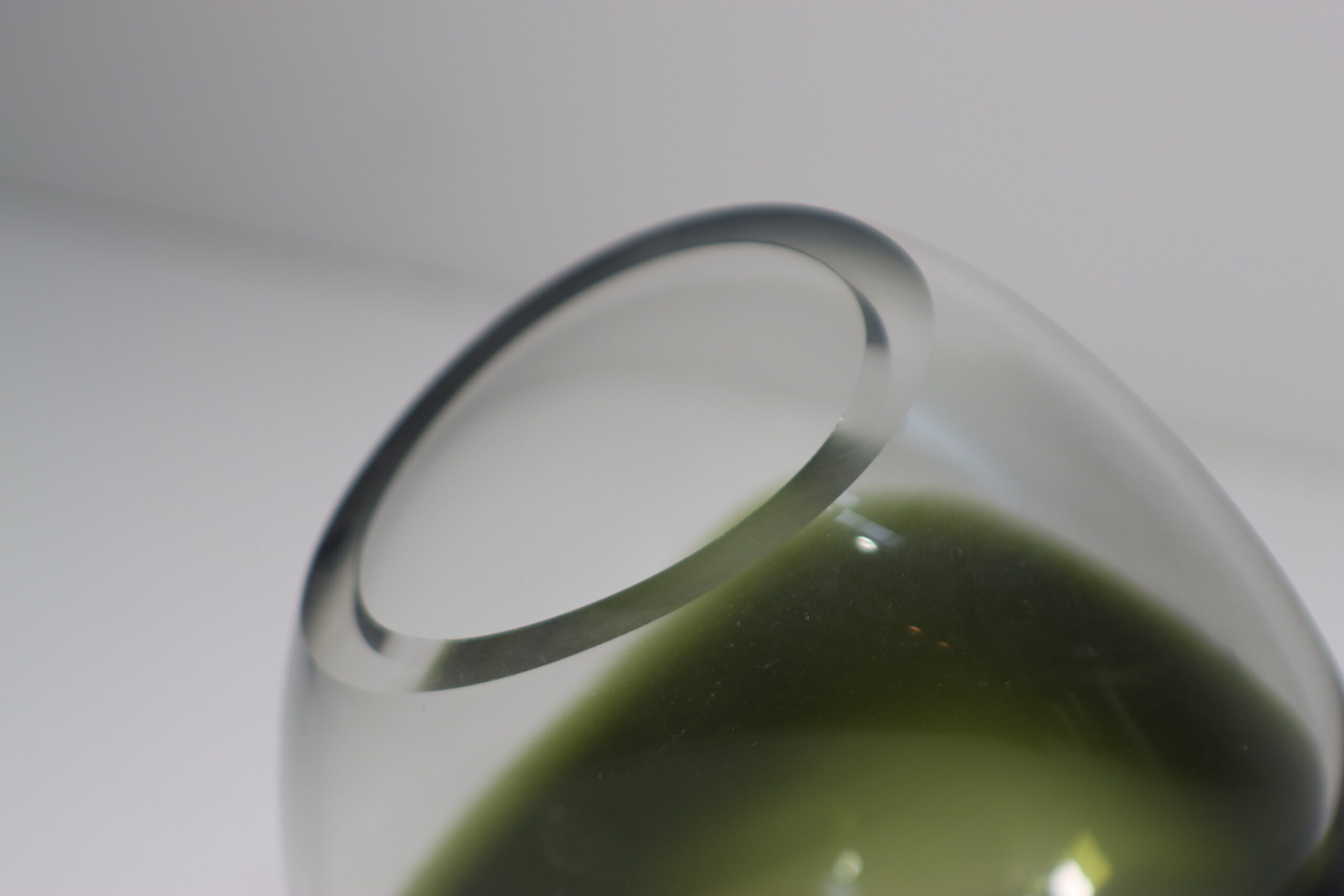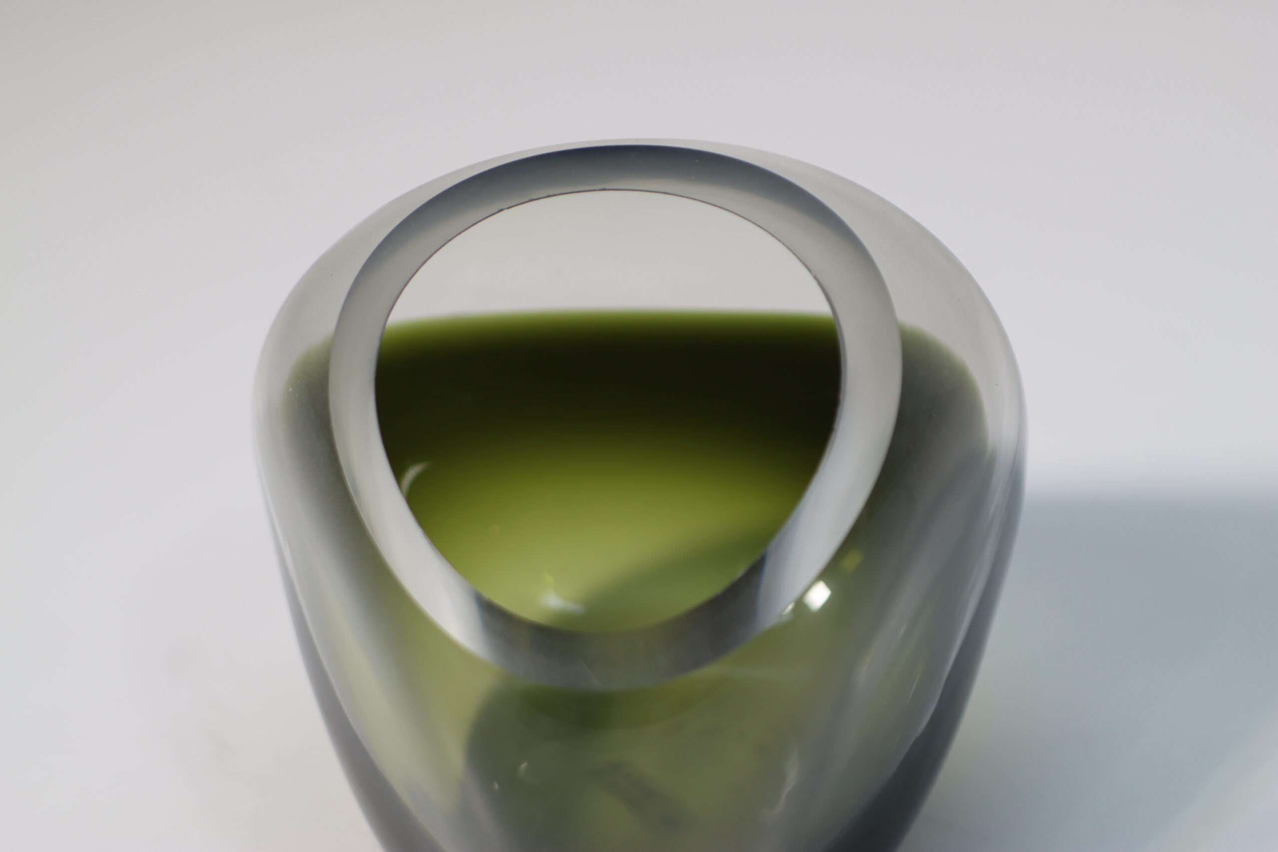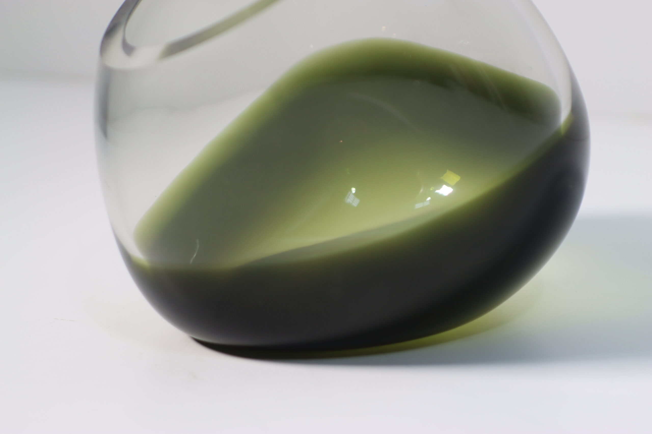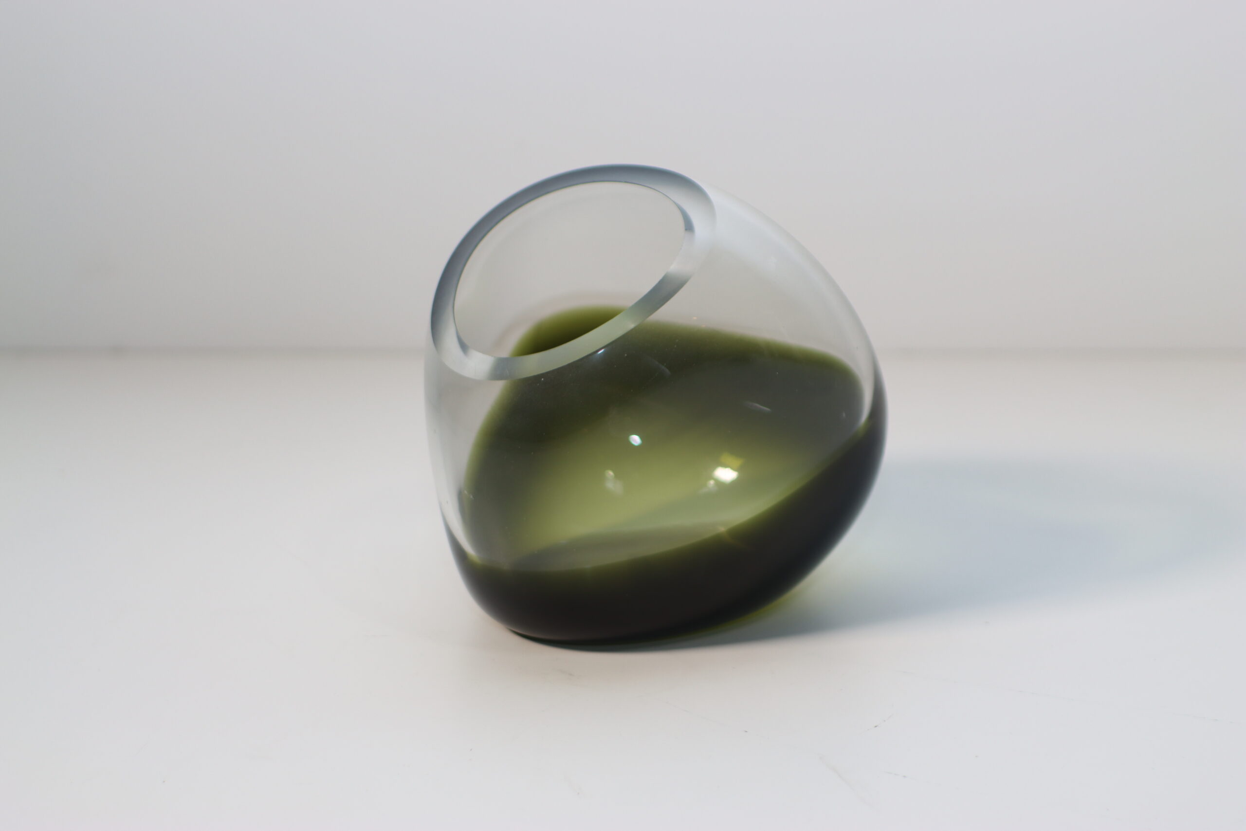 底部に深く沈殿する「フォレストグリーン」と、それを包み込む透明なガラスの肉厚な対比が、空間にオブジェとしての重厚感と、水面に映る森のような神秘性を付与します。