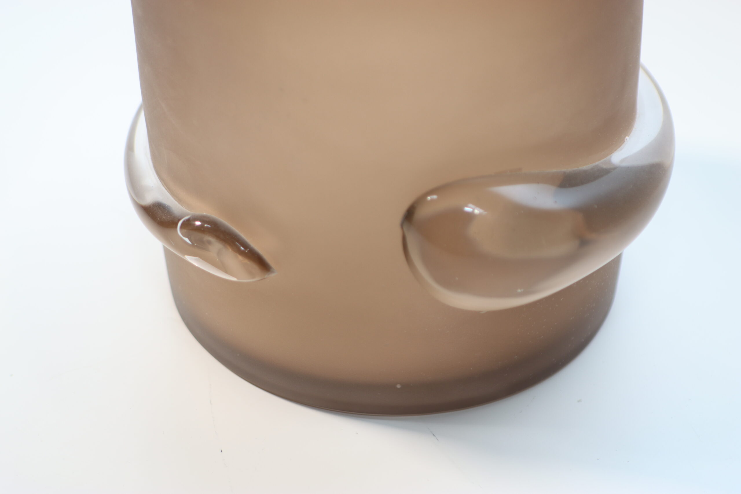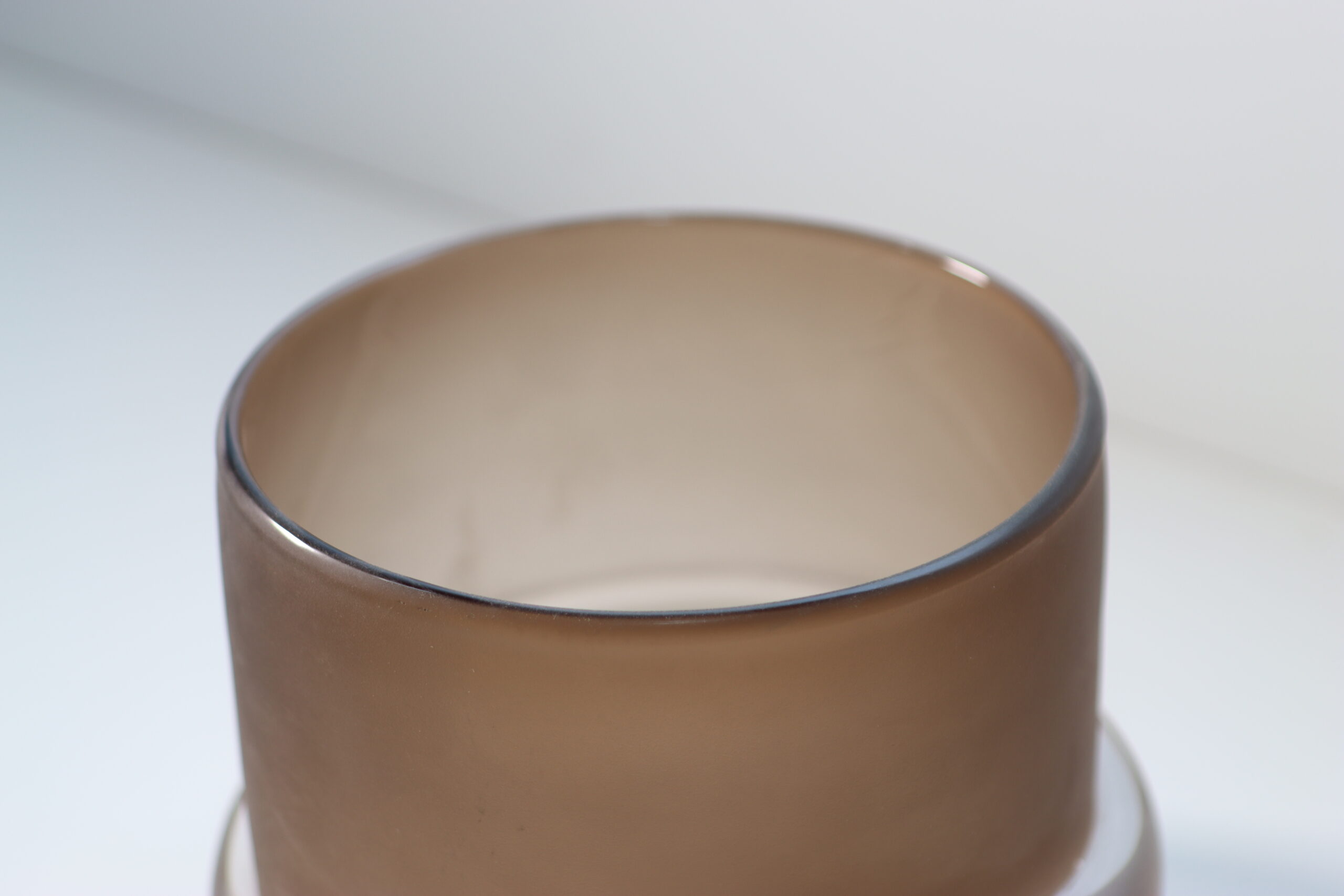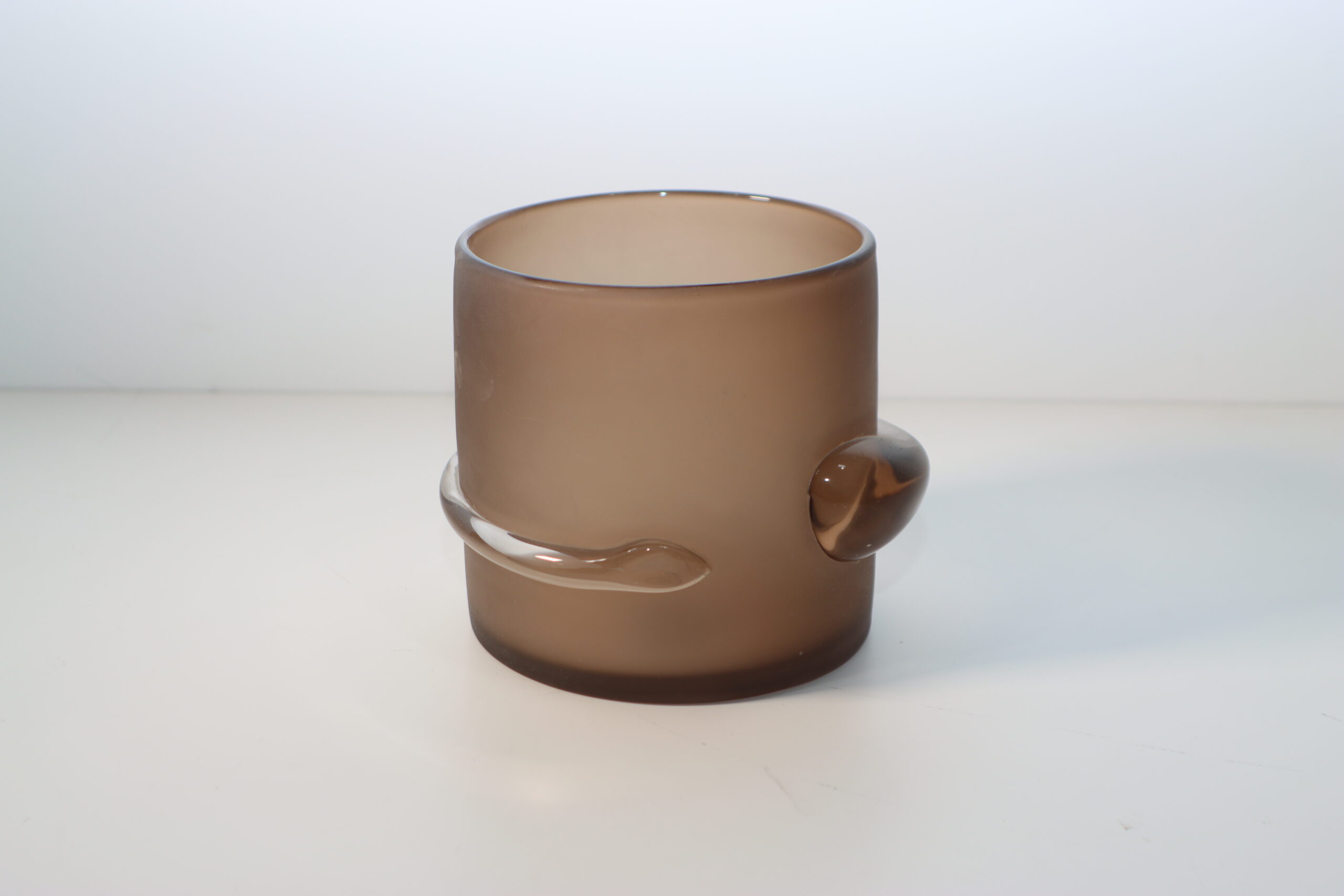 【注意事項】 本製品は、マットなサテン表面と透明なドロップパーツが一体となった、非常にデリケートな質感のアイテムです。その均一なスモーキーカラーを美しく保つため、指紋や微細な汚れは柔らかい布で優しく拭き取るメンテナンスを推奨いたします。また、ワイドな設計で安定感には優れていますが、ガラス特有の重量があるため、設置や移動の際は本体をしっかり保持して慎重に取り扱ってください。