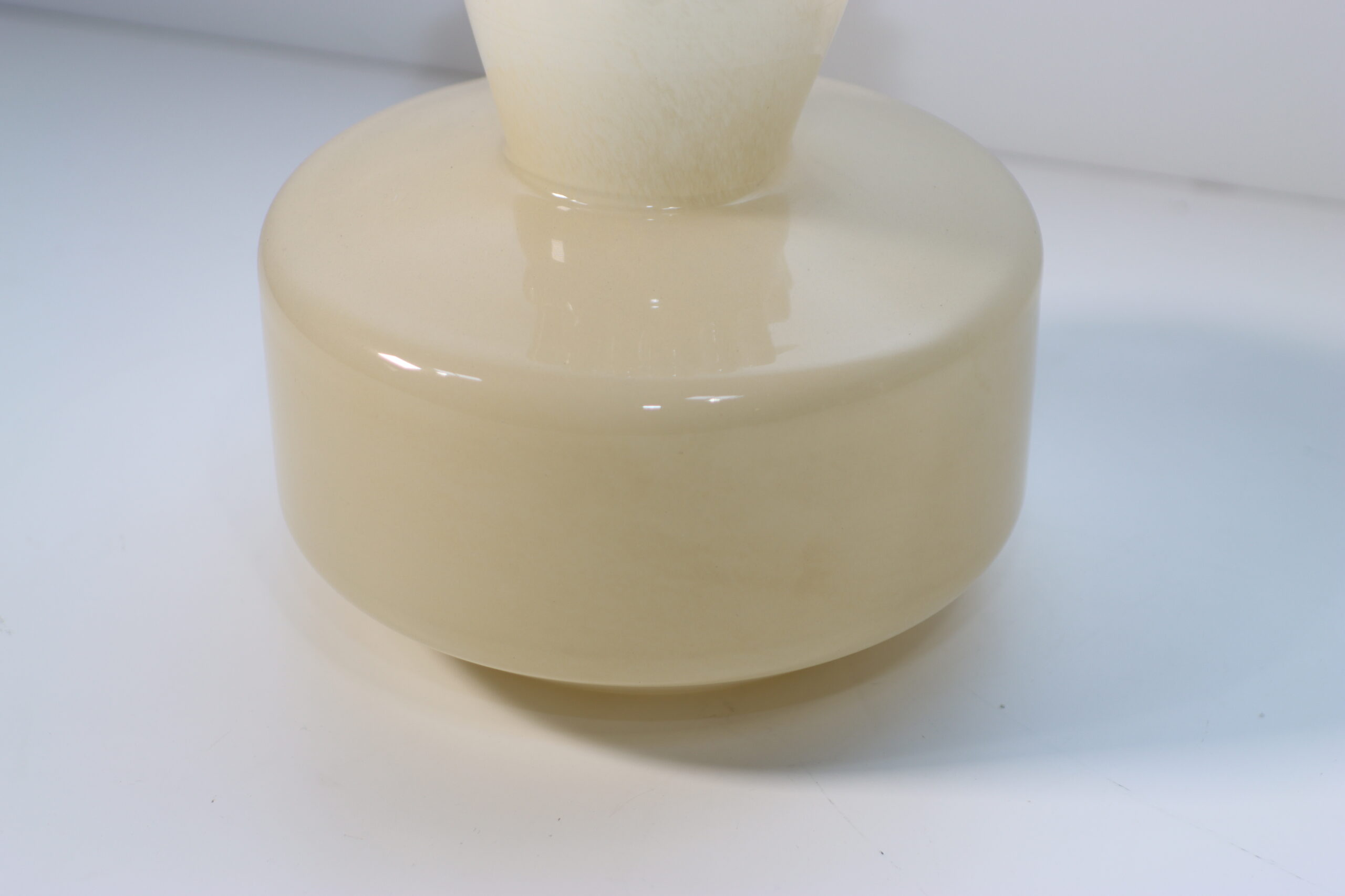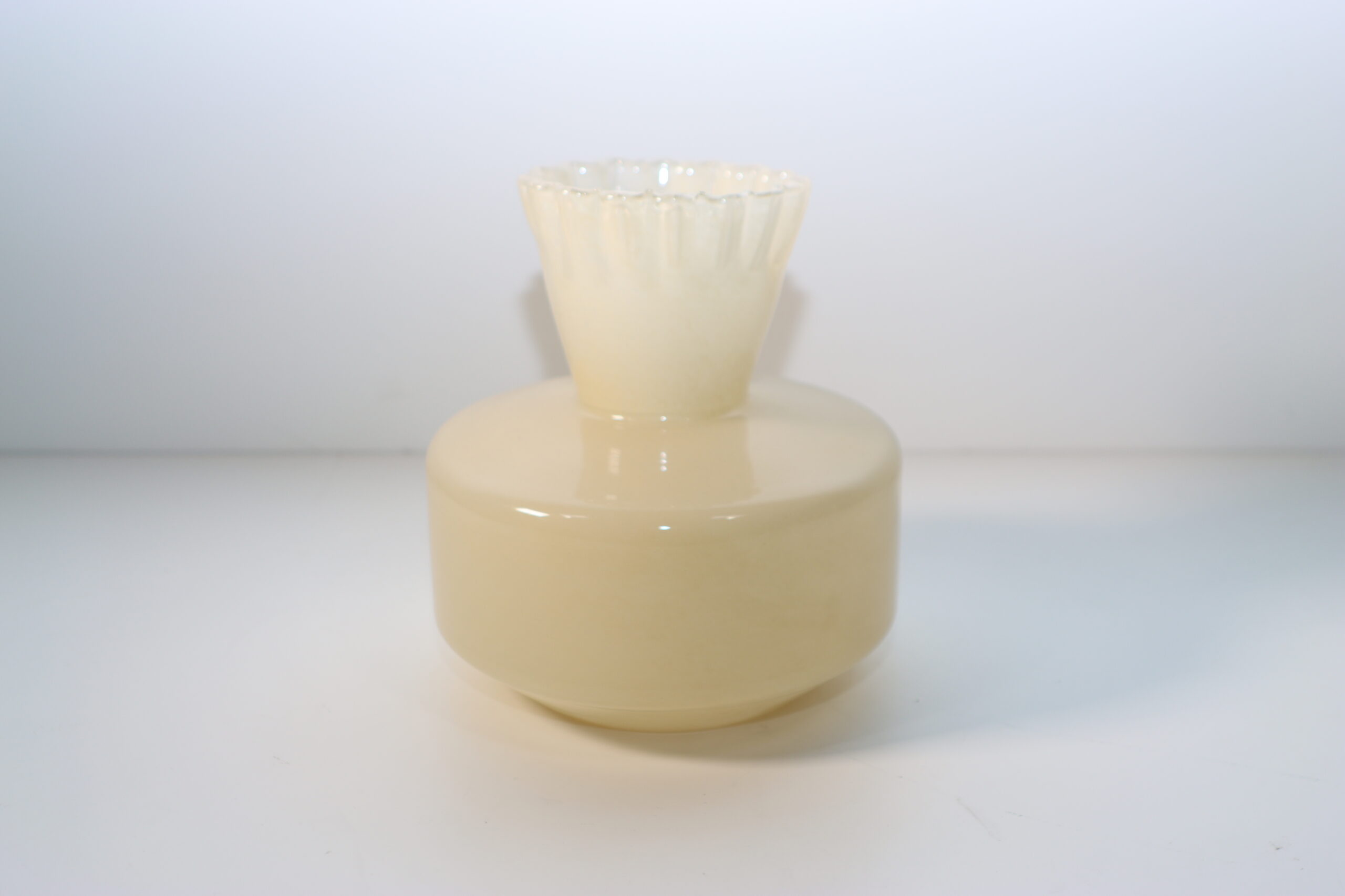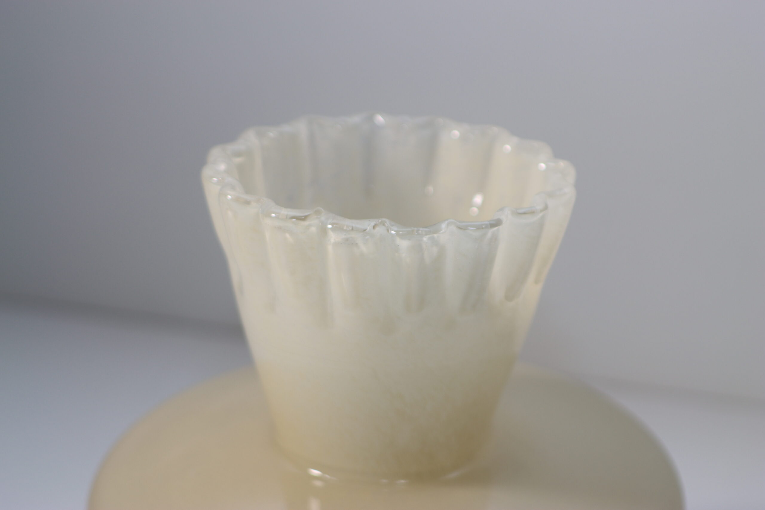 【注意事項】 本製品は、ガラス内部に微細な粒子を閉じ込めたような独自の透過性が魅力です。光を透過させることで、よりアラバスターのような深みのある表情が現れるため、自然光の入る窓辺や透過光を活かしたライティングでの展示を推奨いたします。また、口元のフリル部分は非常に繊細な造形となっているため、お手入れや移動の際は過度な負荷を避け、本体の重心部分を支えて慎重に取り扱ってください。