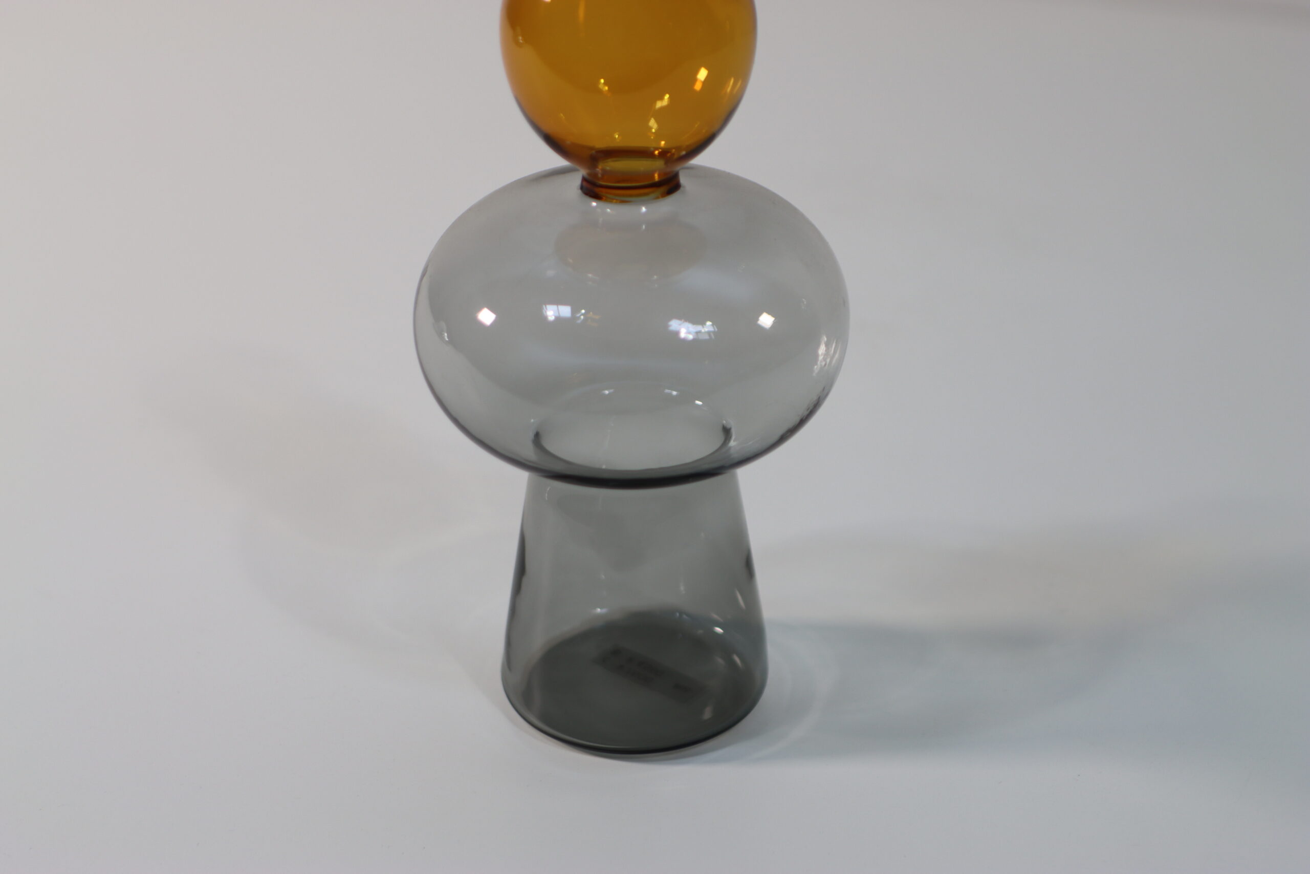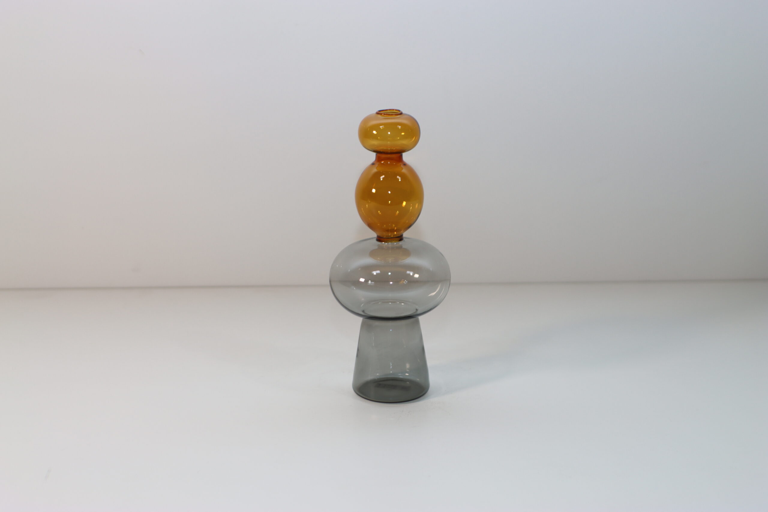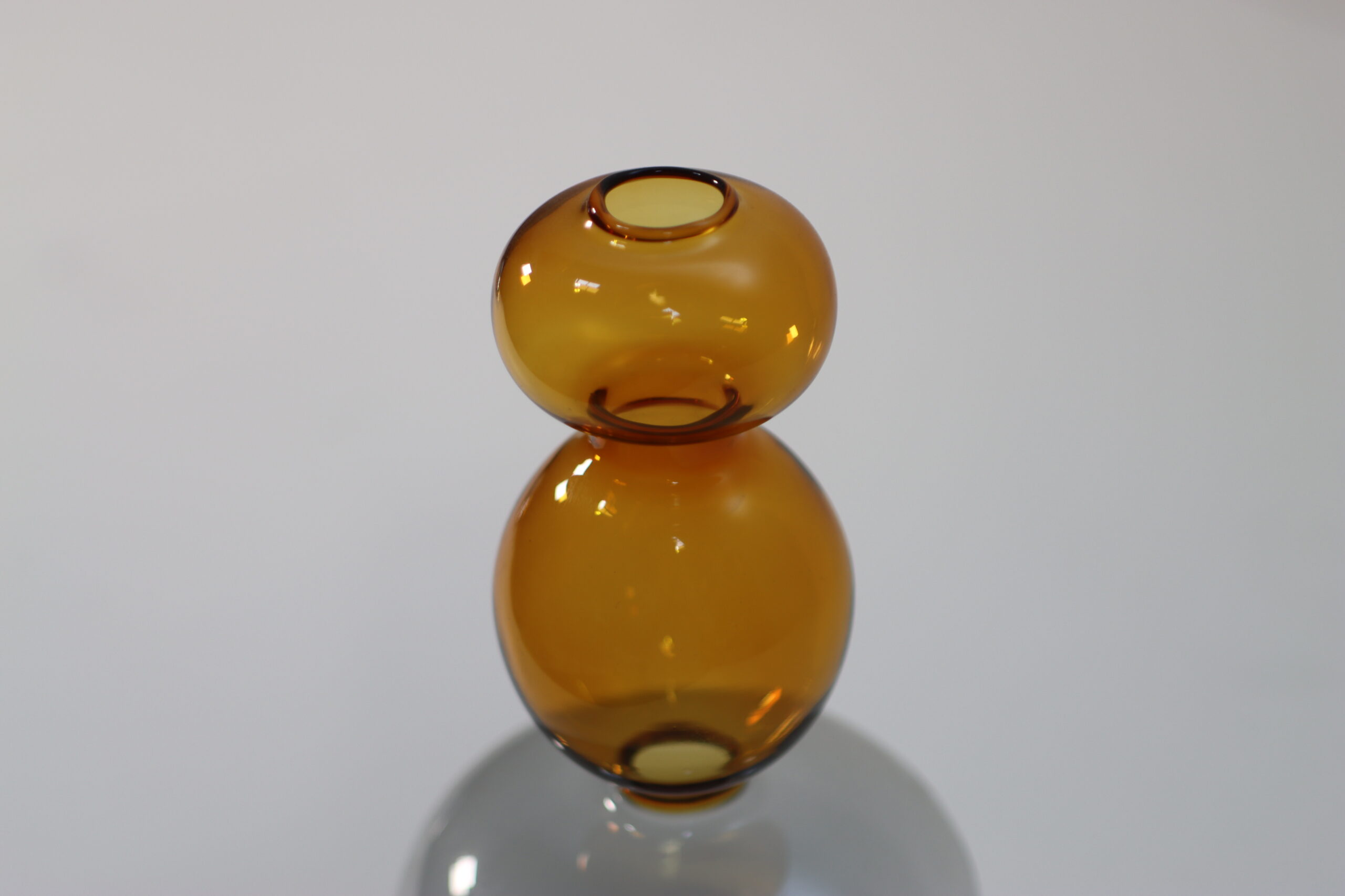 【注意事項】 本製品は、異なる形状のパーツを垂直にスタッキング(積層)した、高度なバランス感覚を要するハンドメイド作品です。各パーツの接合部はデザインのアクセントであると同時に、物理的な負荷が集中しやすい箇所でもあります。移動の際は必ず底部から全体を支え、揺れや衝撃の少ない安定した場所に展示してください。また、アンバーガラスは光を透過させることでより豊かな表情を見せるため、背面からのライティングや自然光を活かした配置を推奨いたします。