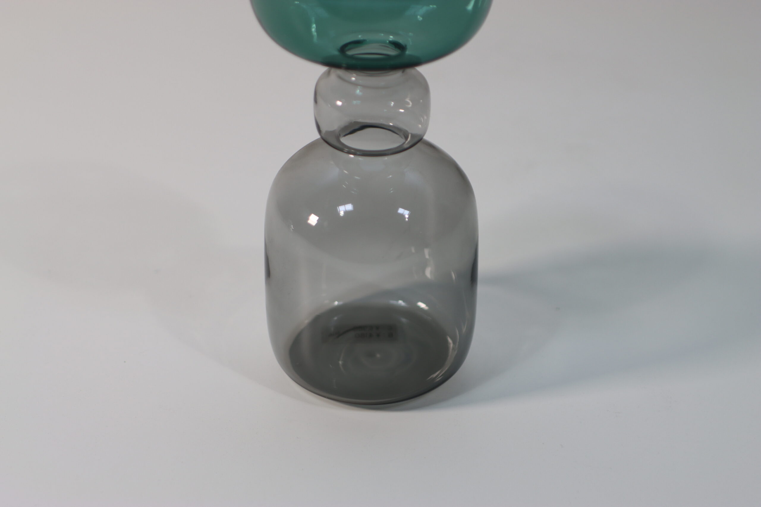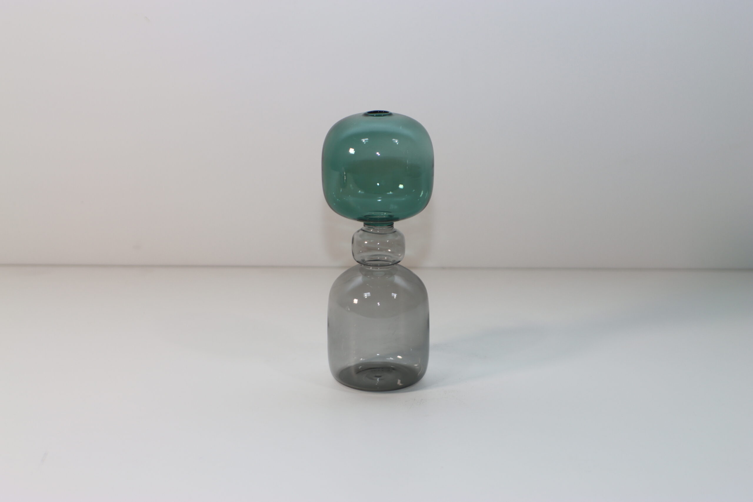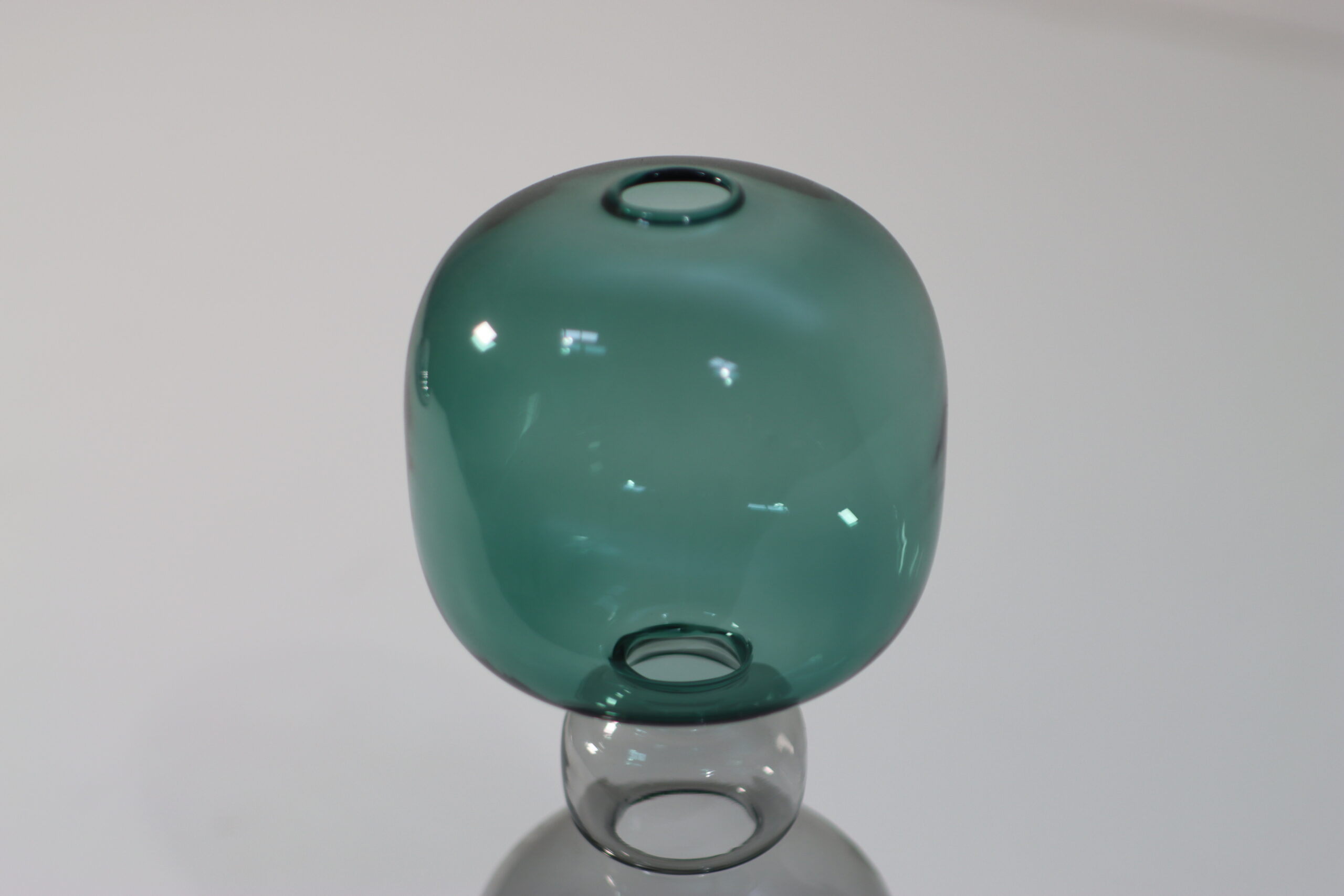 土台となるスモーキーなクリアベースから、鮮やかなミントグリーンの球体が二段連なる「軽快な垂直性」が、空間に現代的な洗練と清涼感を付与します。