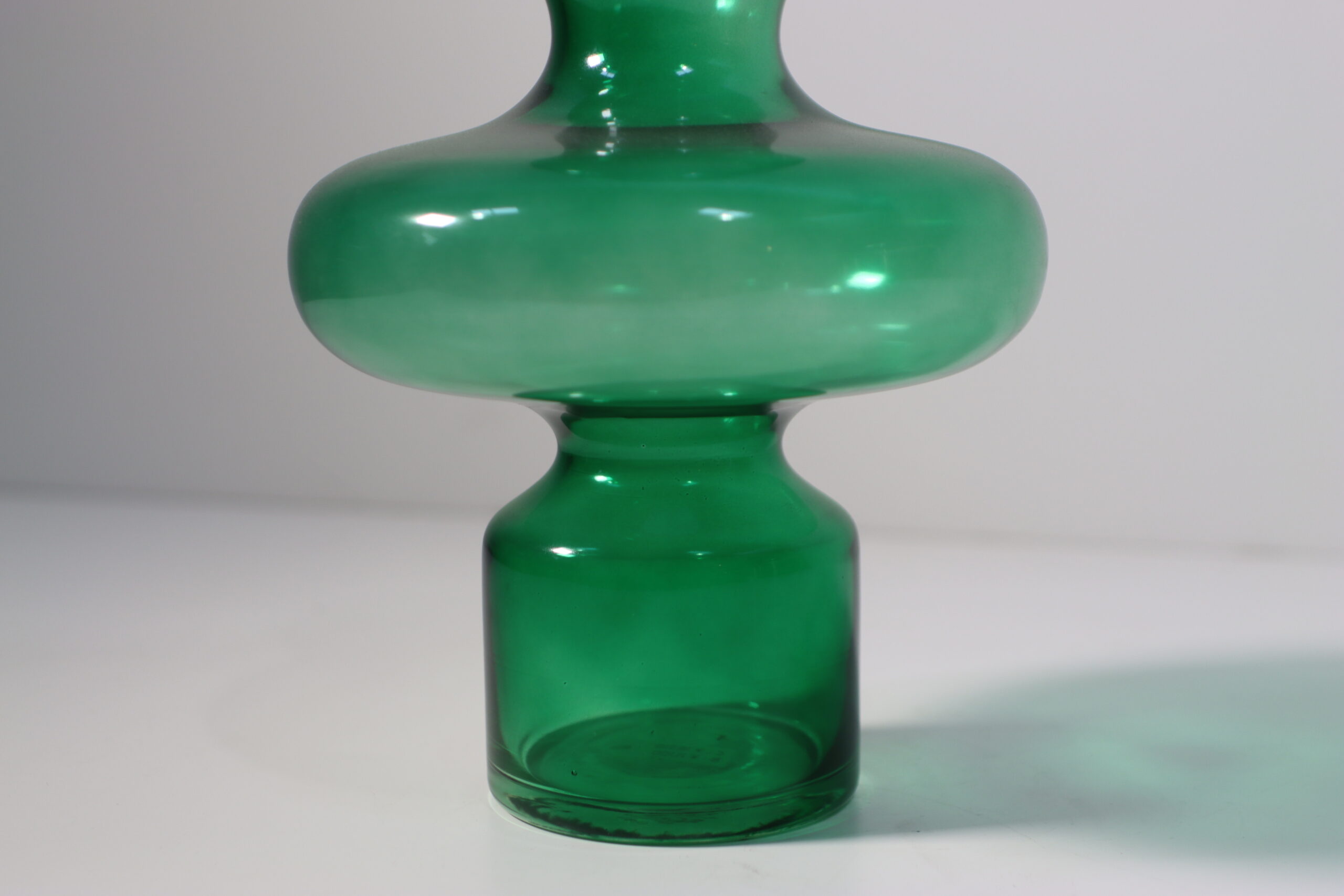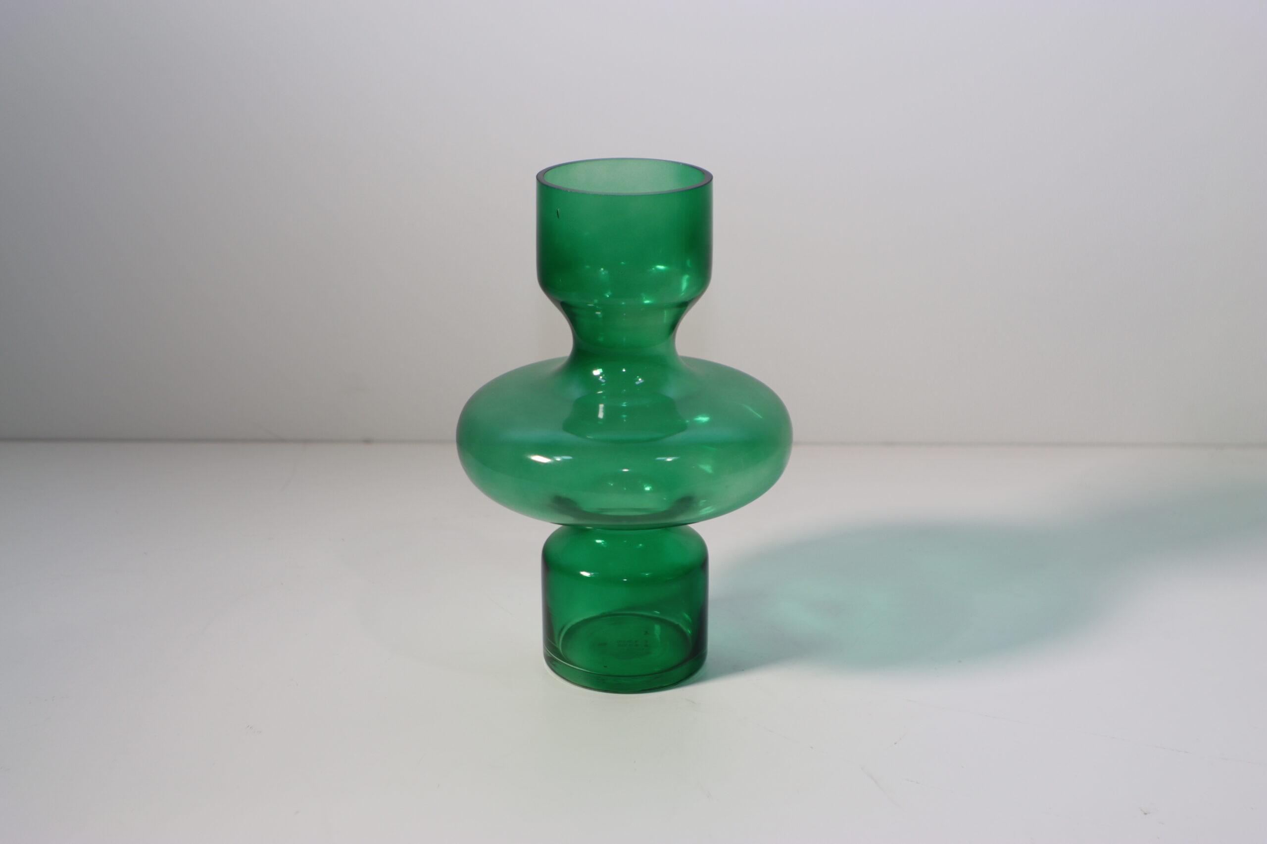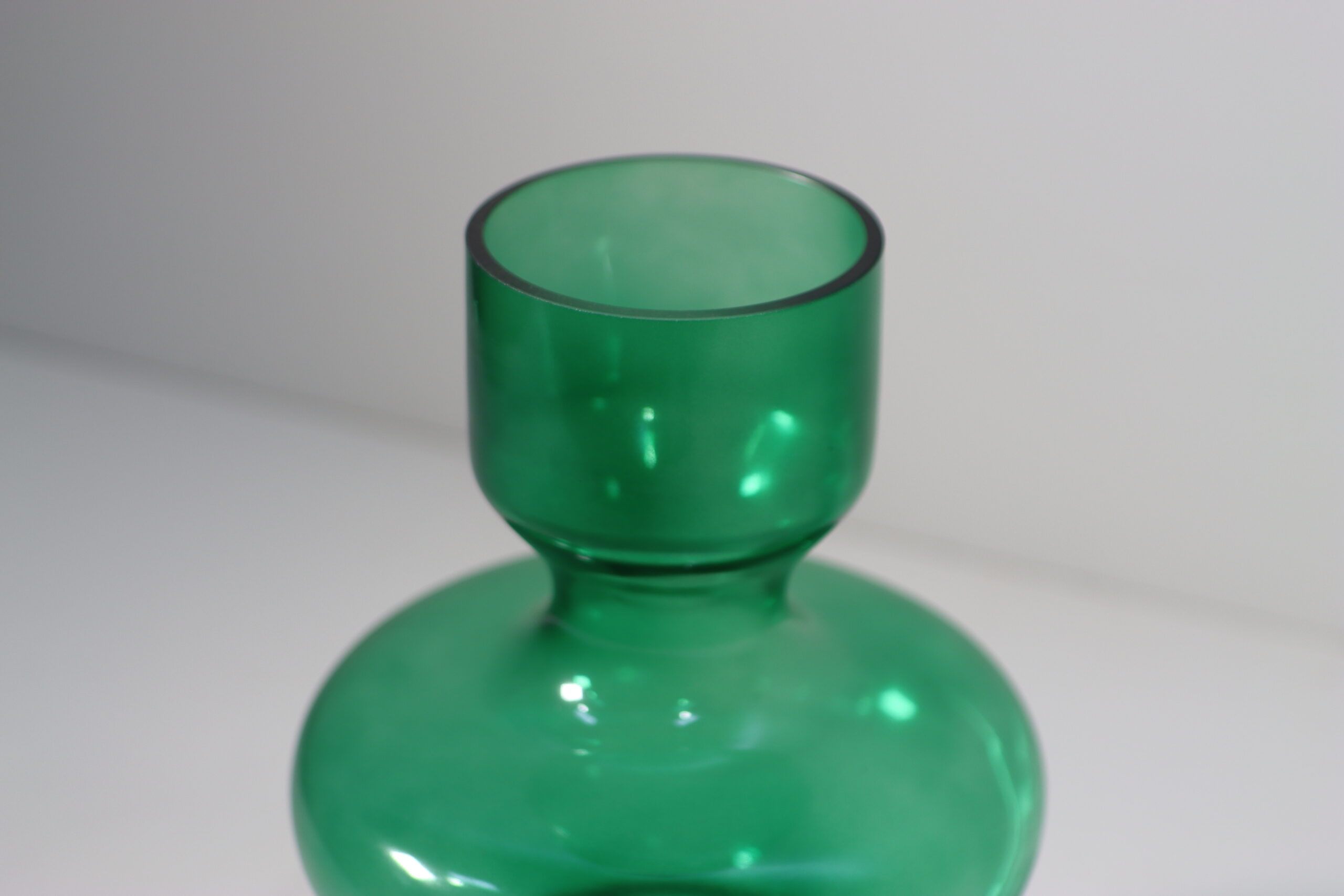 中央が大きく膨らんだ独創的な3段構成のフォルムと、深みのあるエメラルドグリーンの対比が、空間に強い視覚的リズムをもたらします。透過性の高いガラス素材は、光を浴びることで床面に美しい色の影(カラーシャドウ)を落とし、静止画の中に幻想的な奥行きを演出します。