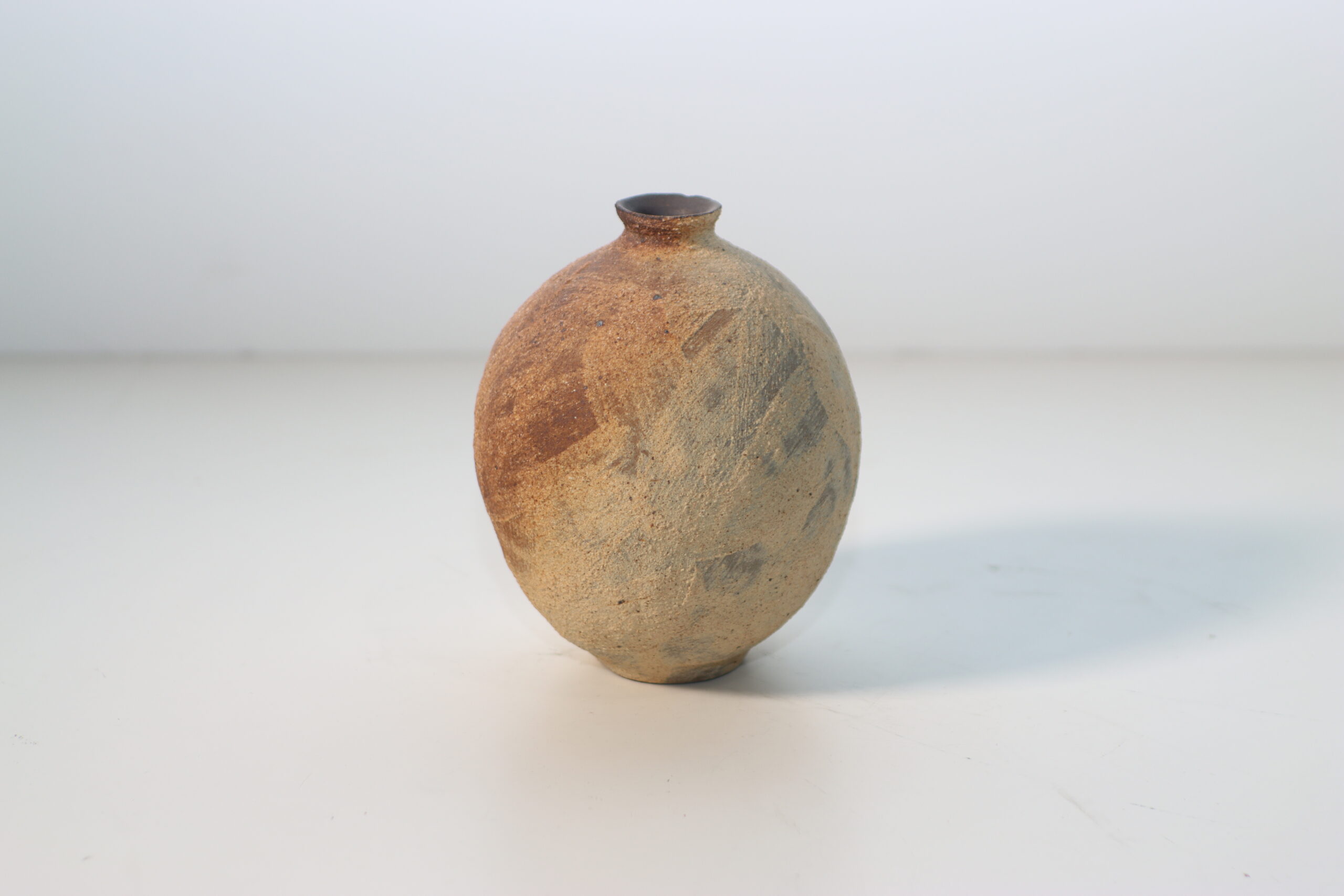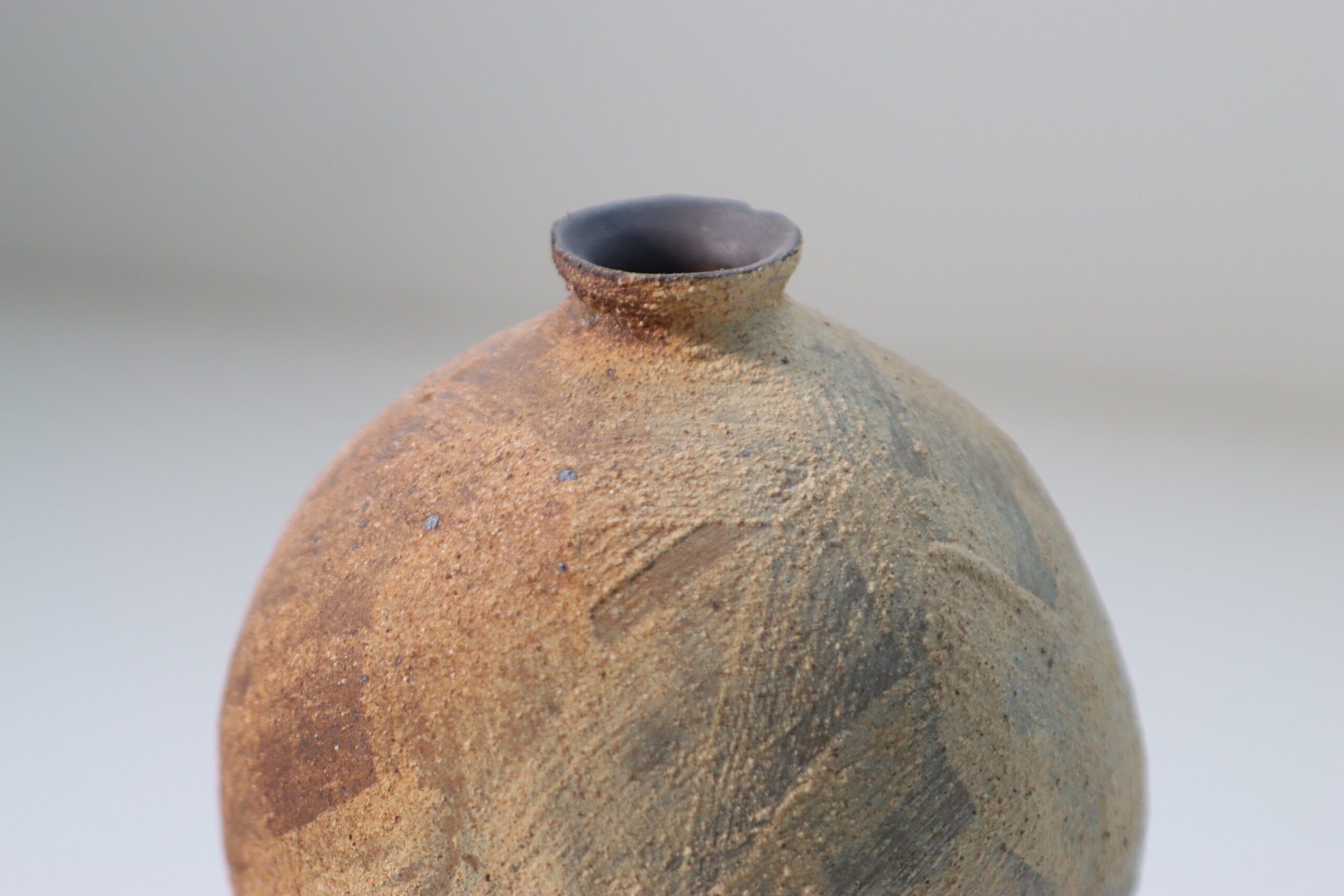 【注意事項】 本製品は、手仕事によって一点ずつ異なる土の焼き色と、マットで奥行きのある質感が最大の魅力です。その滑らかな球体フォルムを活かすため、周囲のノイズを排除したシンプルなスタイリングを推奨いたします。極小の開口部は、枯れた枝一本を差すだけでも絵になりますが、そのままオブジェとして、光の移ろいとともに変化する球体上の影の美しさをお楽しみください。