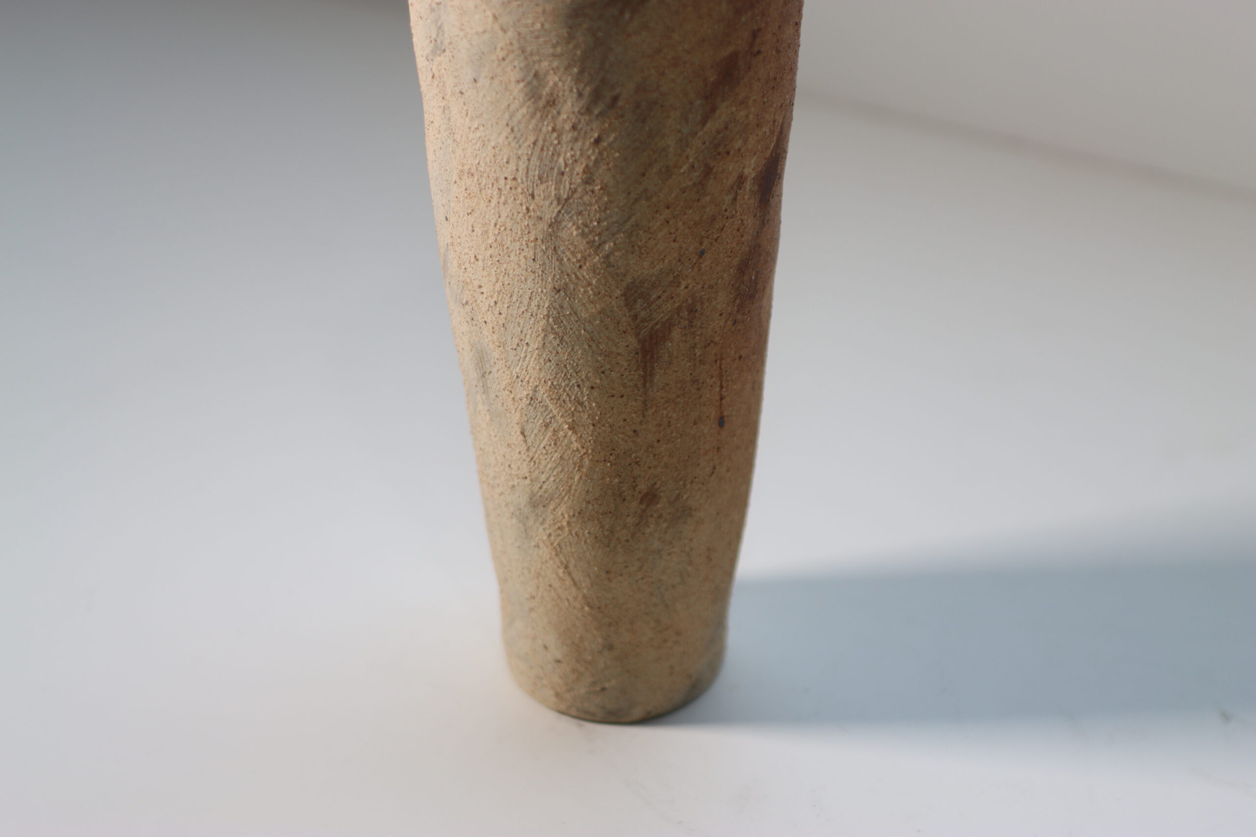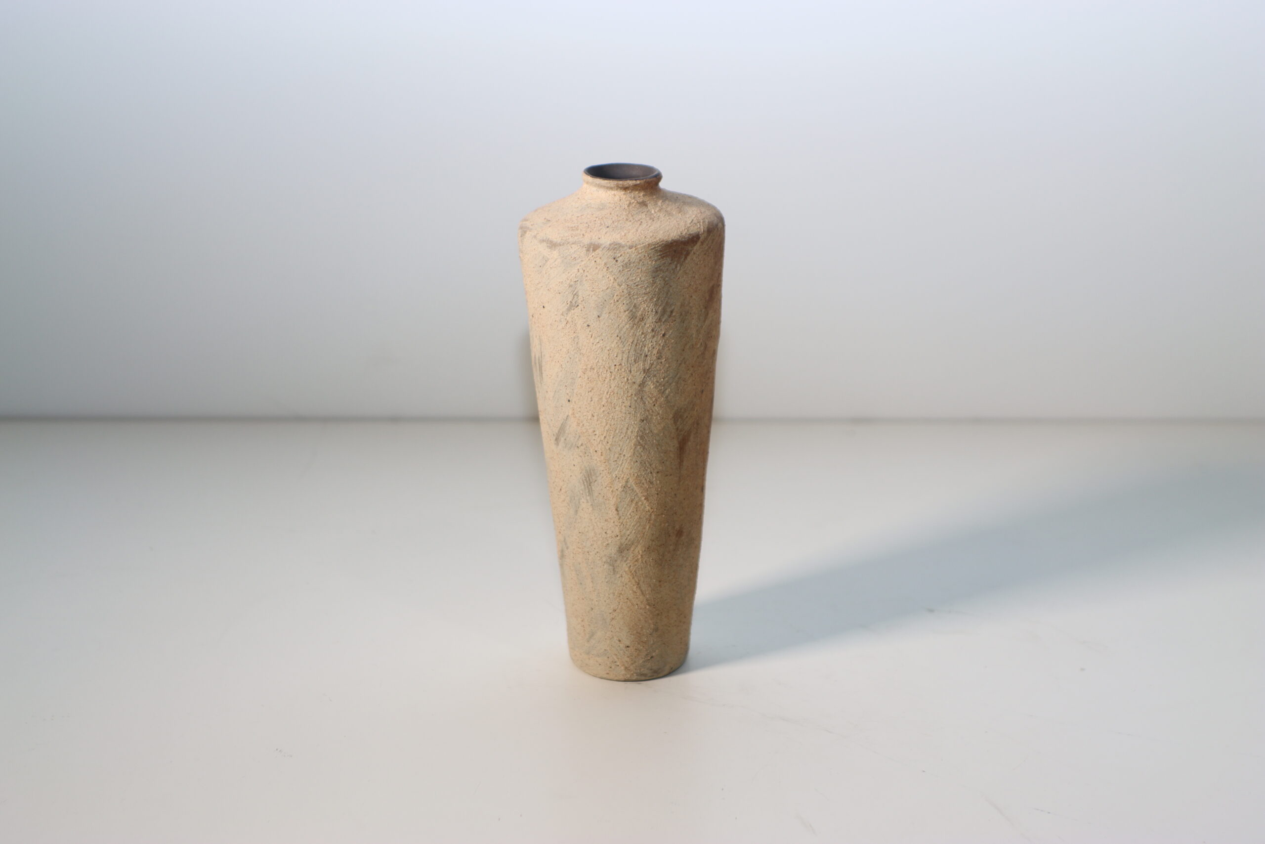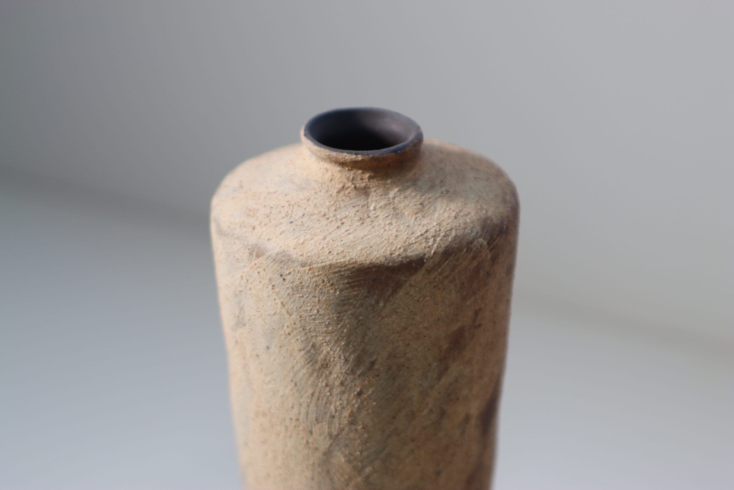 【注意事項】 本製品は、手仕事の跡が刻まれた粗い表面と、一点ごとに異なる自然な色の濃淡が最大の魅力です。そのスリムな立ち姿を際立たせるため、安定した平坦な場所に設置し、サイドからの光で表面の凹凸が描く繊細な陰影をお楽しみいただくことを推奨いたします。そのままオブジェとして、あるいは極小の開口部に細い枝を一枝差すことで、空間に深い静寂を運びます。