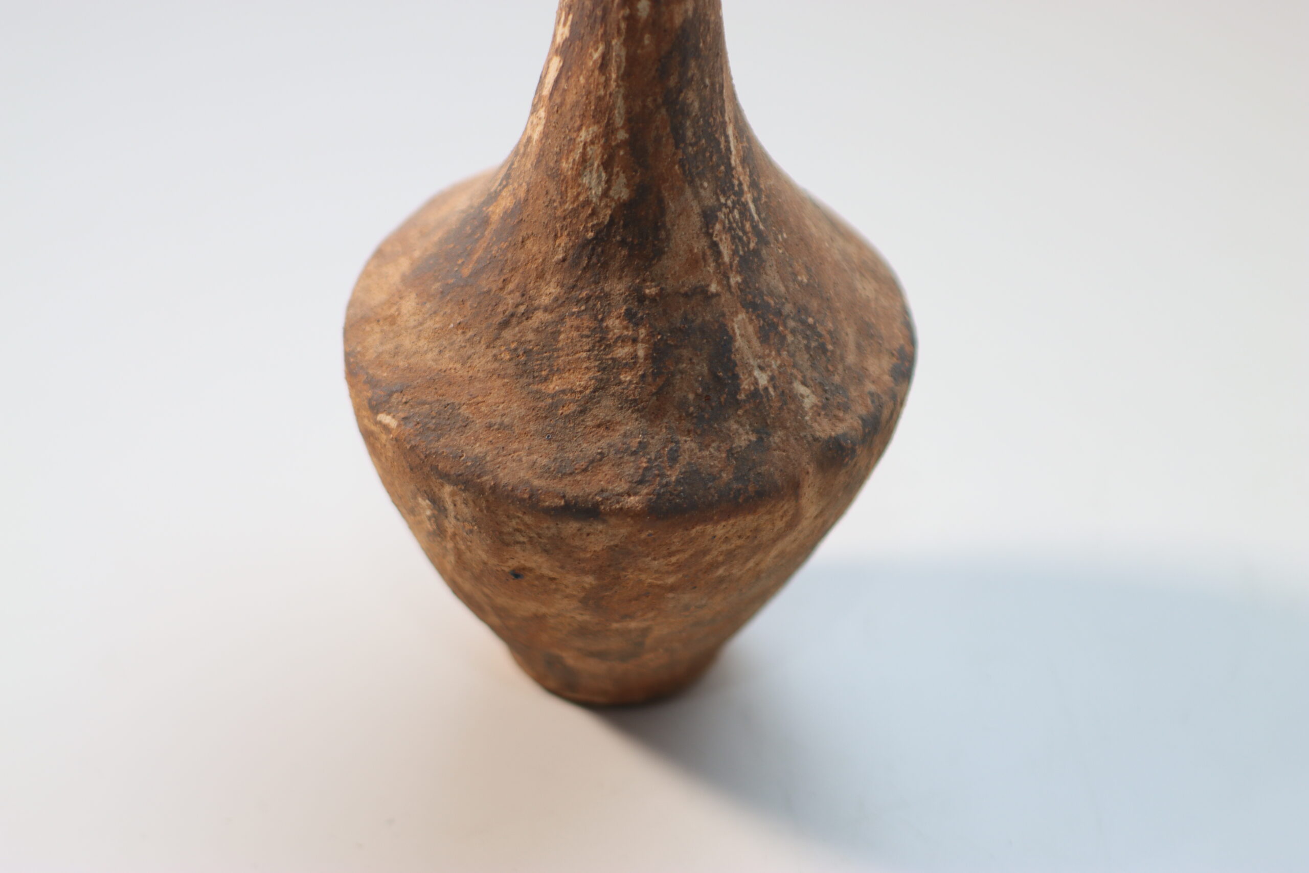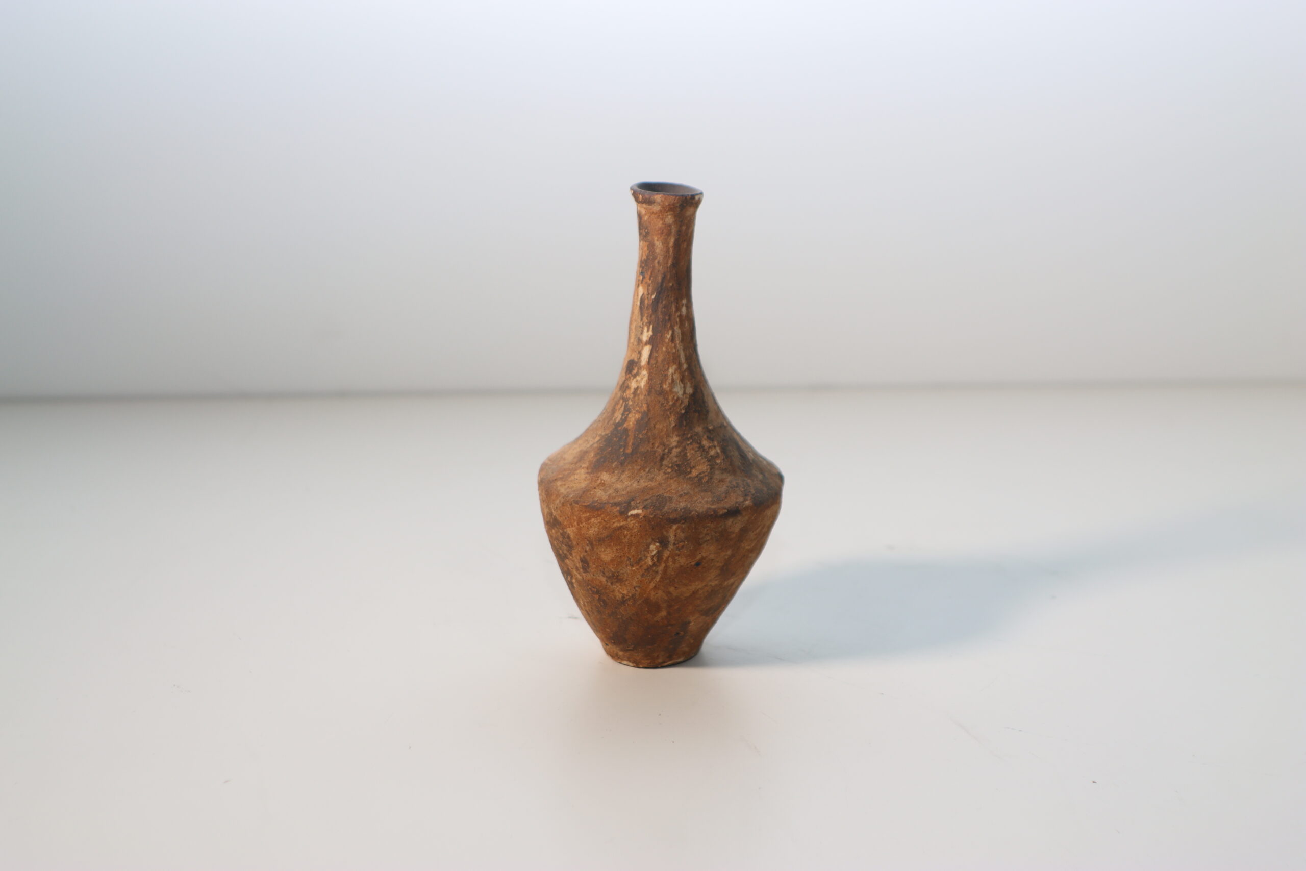 【注意事項】 本製品は、手仕事による唯一無二の歪み(ゆがみ)と、自然な火色のムラが最大の魅力です。その流れるようなシルエットと地肌の質感を活かすため、スポットライト等で影を長く落とし、素材の凹凸が生み出す「静かなるドラマ」を演出することを推奨いたします。底部が安定した重心設計となっていますが、設置の際は平坦な場所を選び、土着的な素材が放つ深い情緒をお楽しみください。
