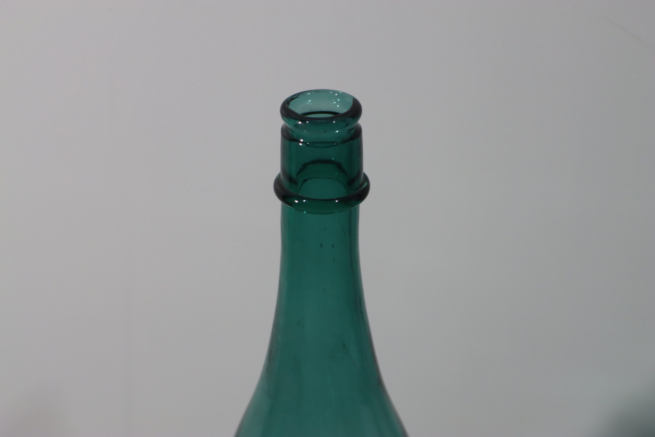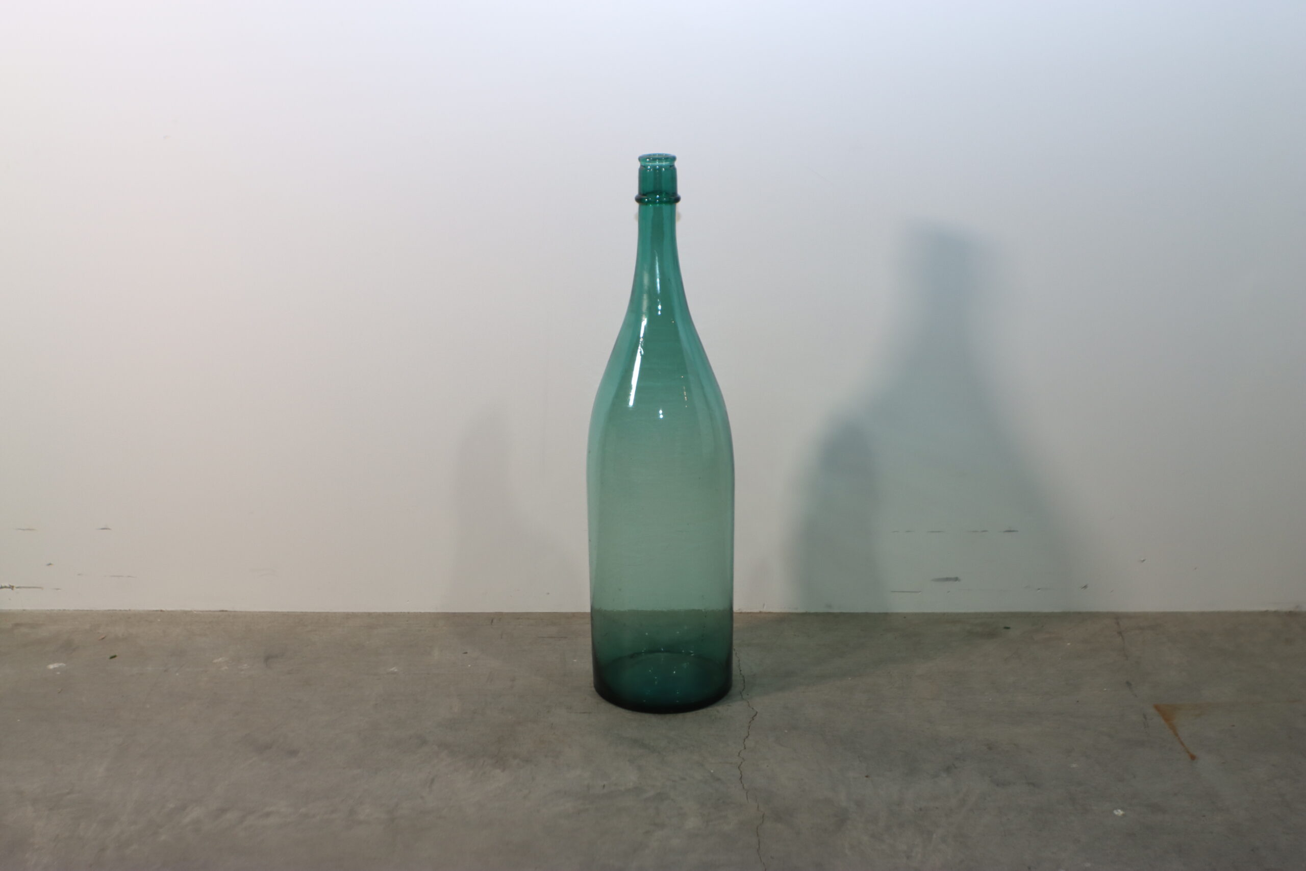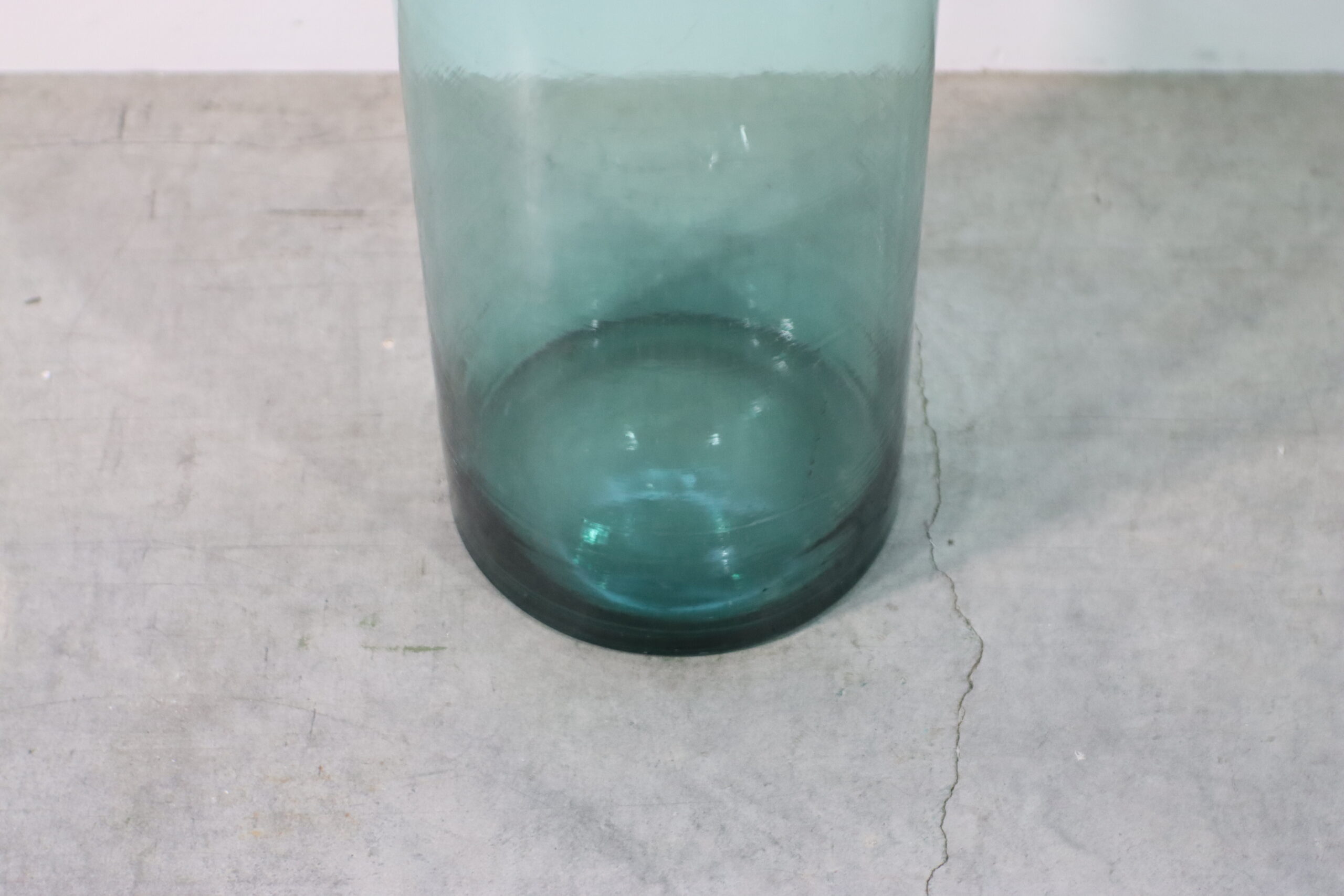 静謐なオーガニック・フォルム:なだらかな曲線を描く大ぶりなボトルラインと、ゆらぎのあるブルーグリーンのガラスが、空間に穏やかな時間の流れとアンティークな情緒をもたらします。