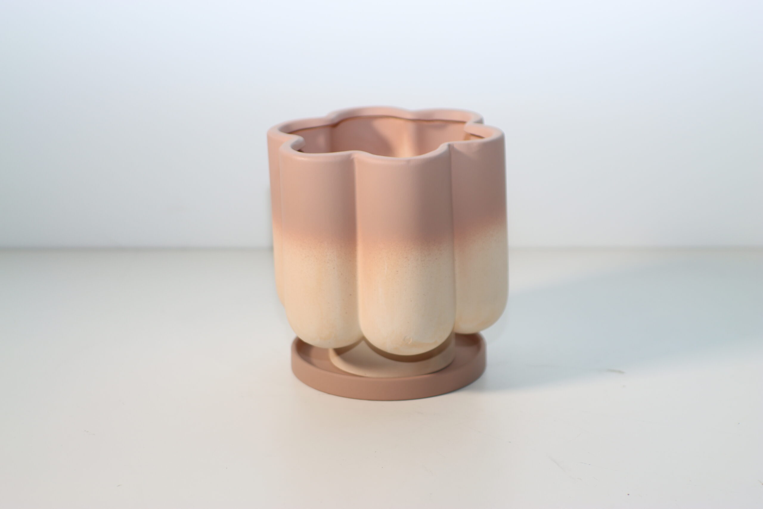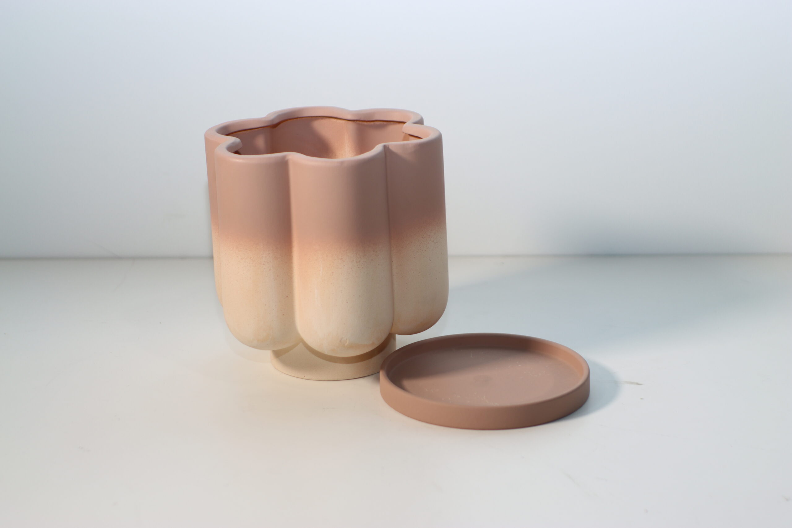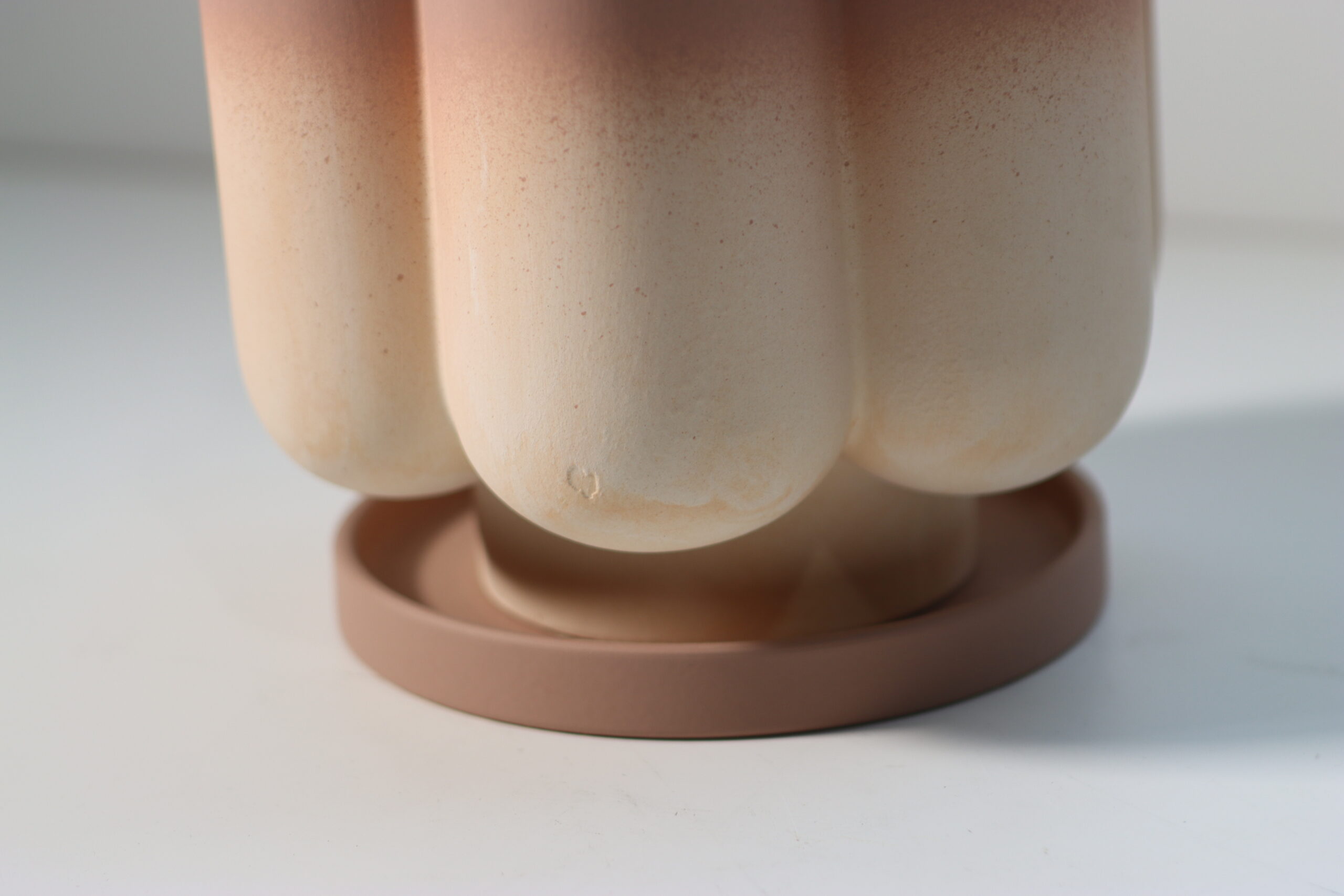 【注意事項】 本製品は、素焼きのようなマットな質感が魅力のテラコッタ製です。油分や水滴が付着するとシミになりやすいため、展示や撮影の際は清潔なグローブを使用するなど、表面の美しさを維持するための丁寧な取り扱いを推奨いたします。また、受け皿(ソーサー)が付属した一体感のあるデザインですが、繊細な色調を損なわないよう、お手入れは乾いた布で埃を払う程度に留めてください。