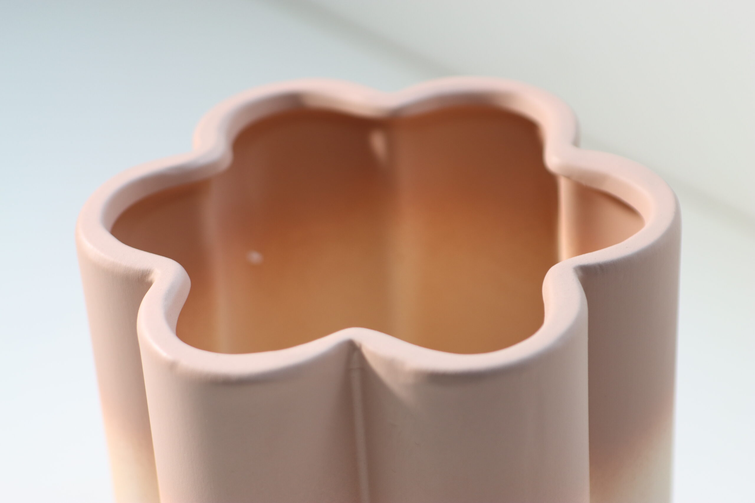 底部から上部へと移ろうテラコッタからペールピンクへのグラデーションは、マットな質感と相まって、空間に「朝の光」のような温かみと情緒的な奥行きを創出するプロップとして機能します。