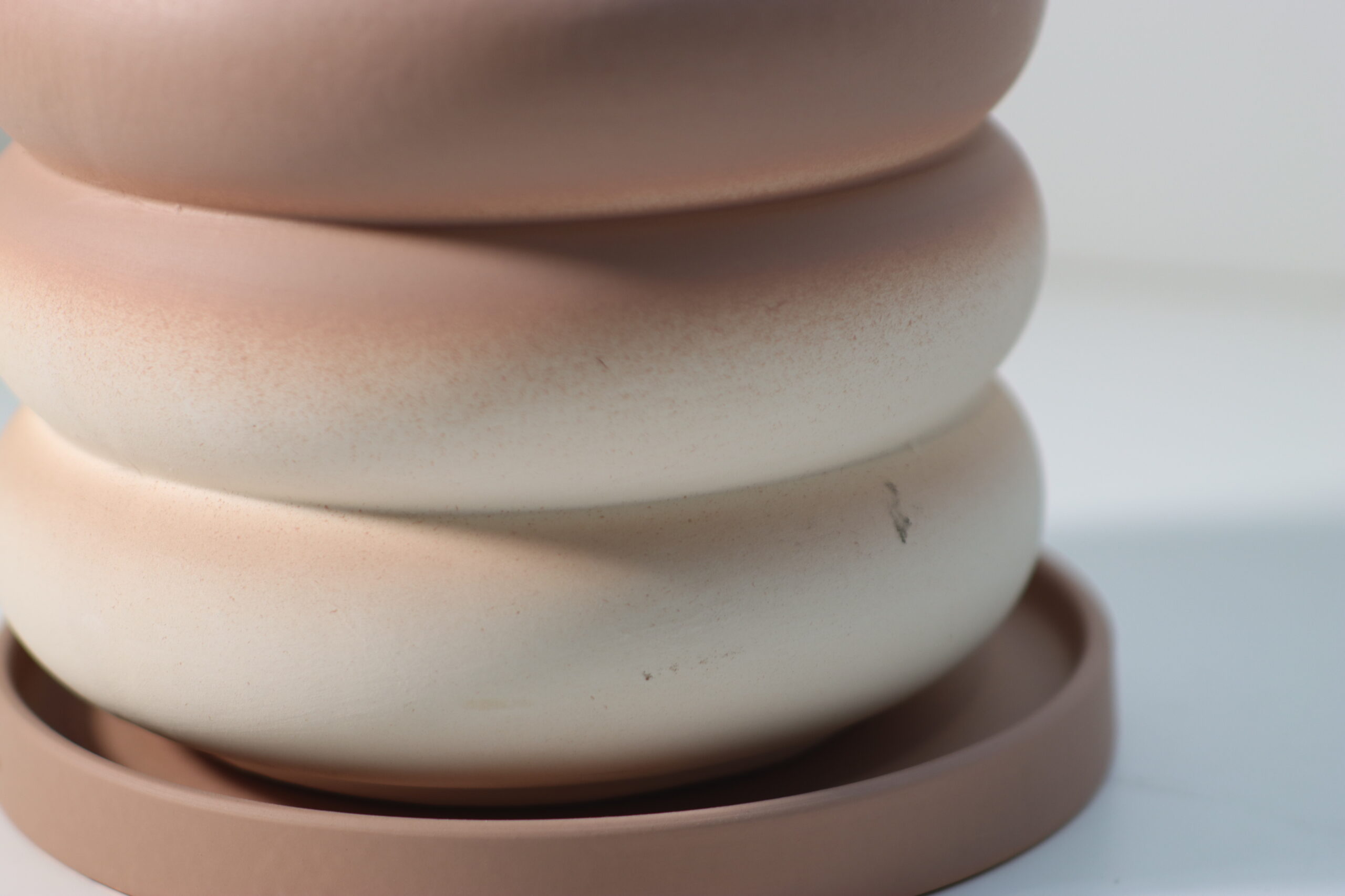 底部から上部へと移ろうテラコッタからペールピンクへのグラデーションは、マットな質感と相まって、空間に「朝の光」のような温かみと情緒的な奥行きを創出するプロップとして機能します。