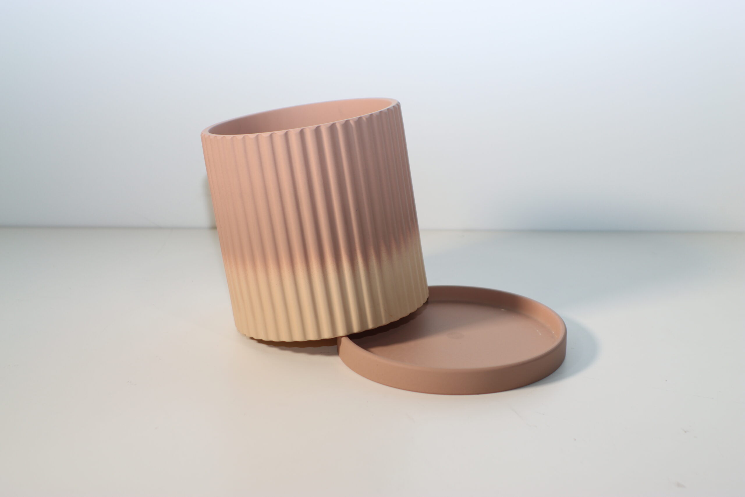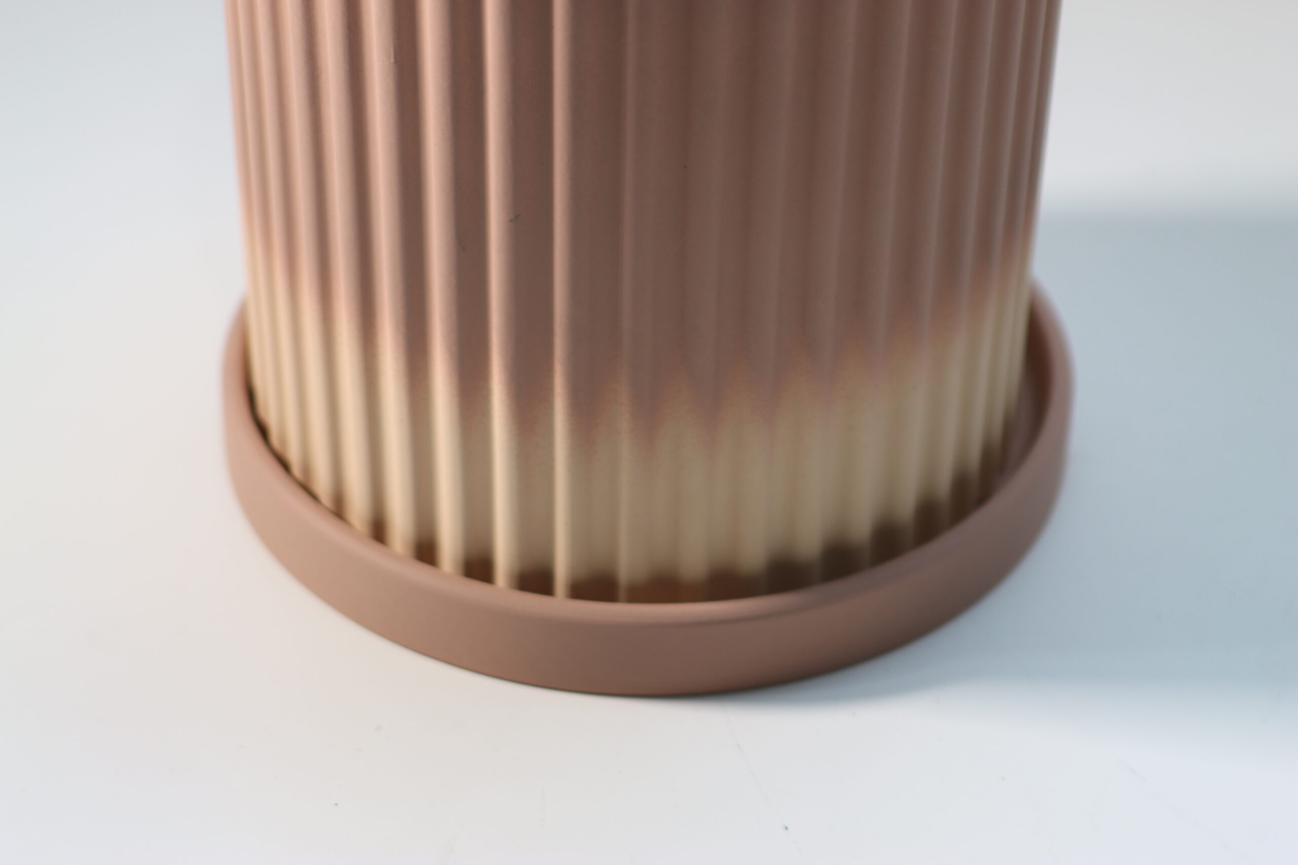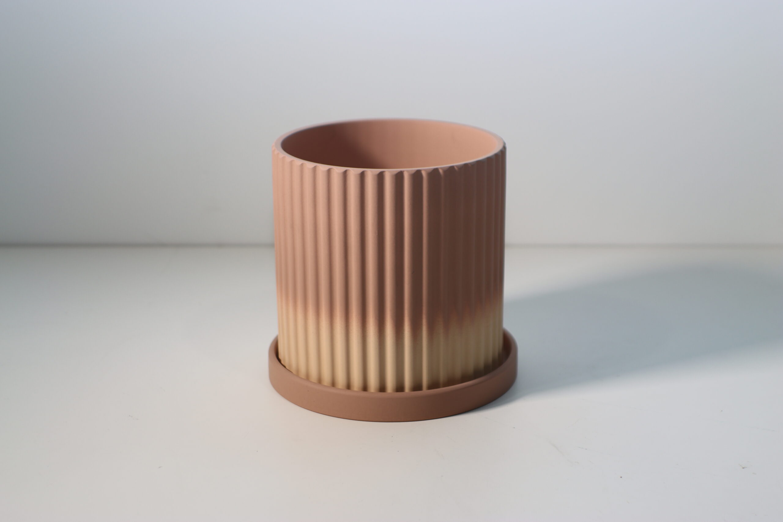 底部から口元にかけて移ろう、深いテラコッタから柔らかなベージュへの「サンセット・グラデーション」が、植物の緑を鮮やかに引き立て、ミニマルな空間に温かな生命力と情緒的な奥行きをもたらします。