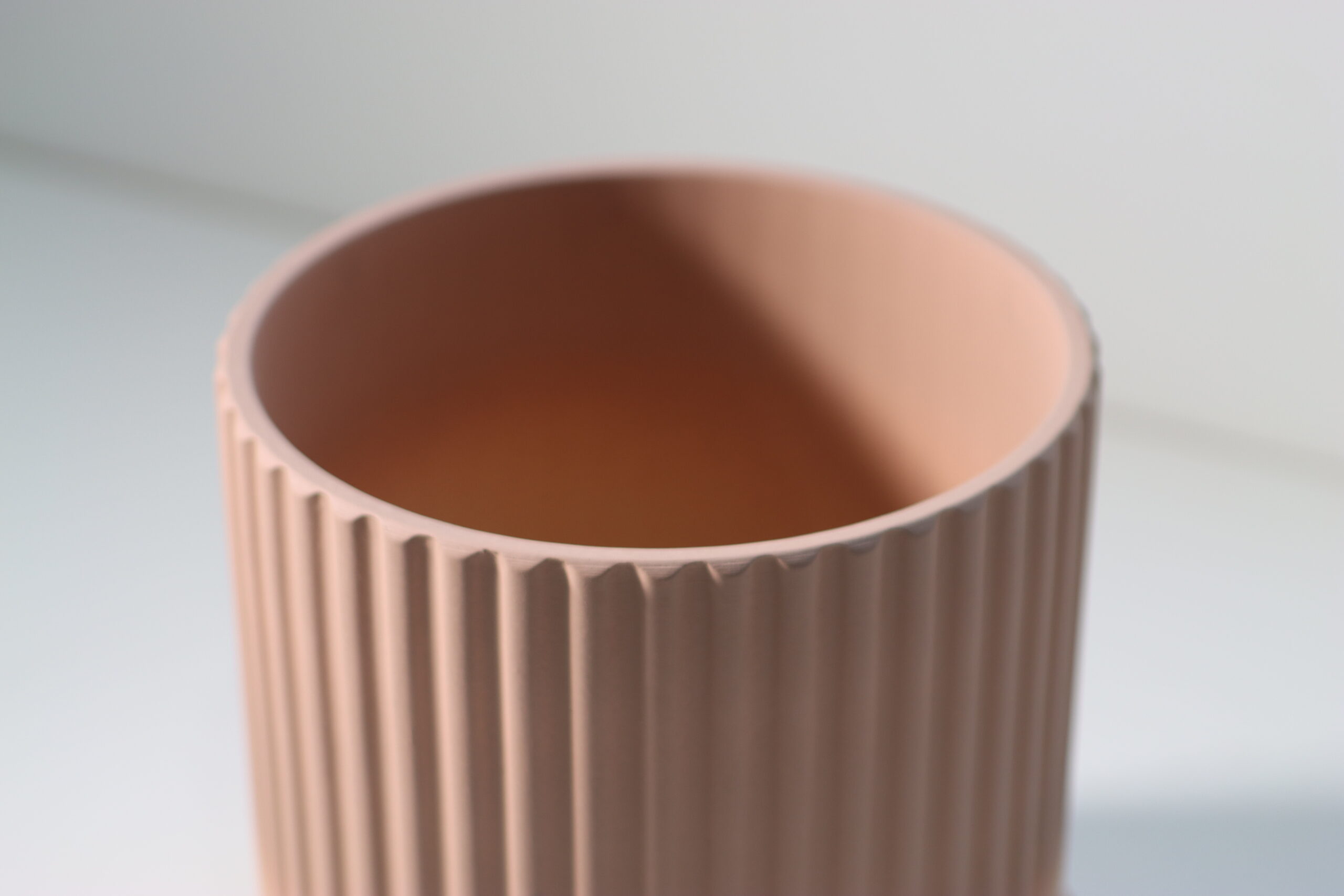 古代建築の柱を彷彿とさせる、精密な「フルーティング(縦溝)加工」が、プランター表面に規則正しい光と影のコントラストを生み出し、空間に規律ある美学を付与します。