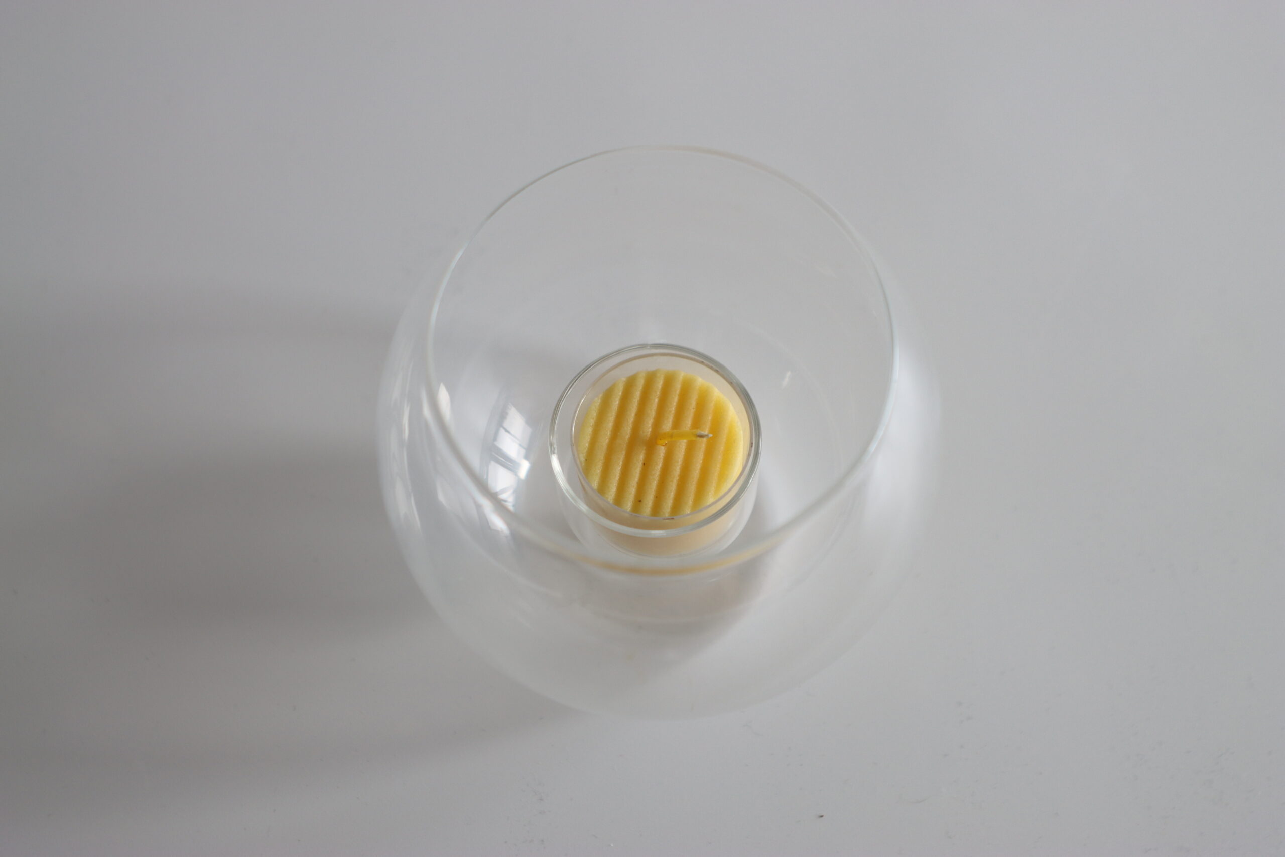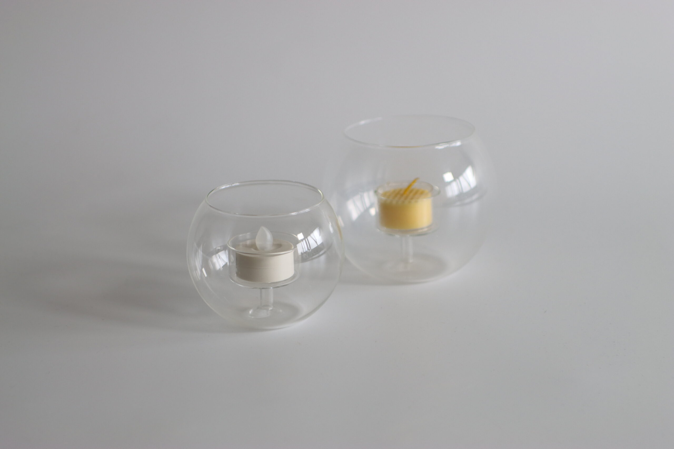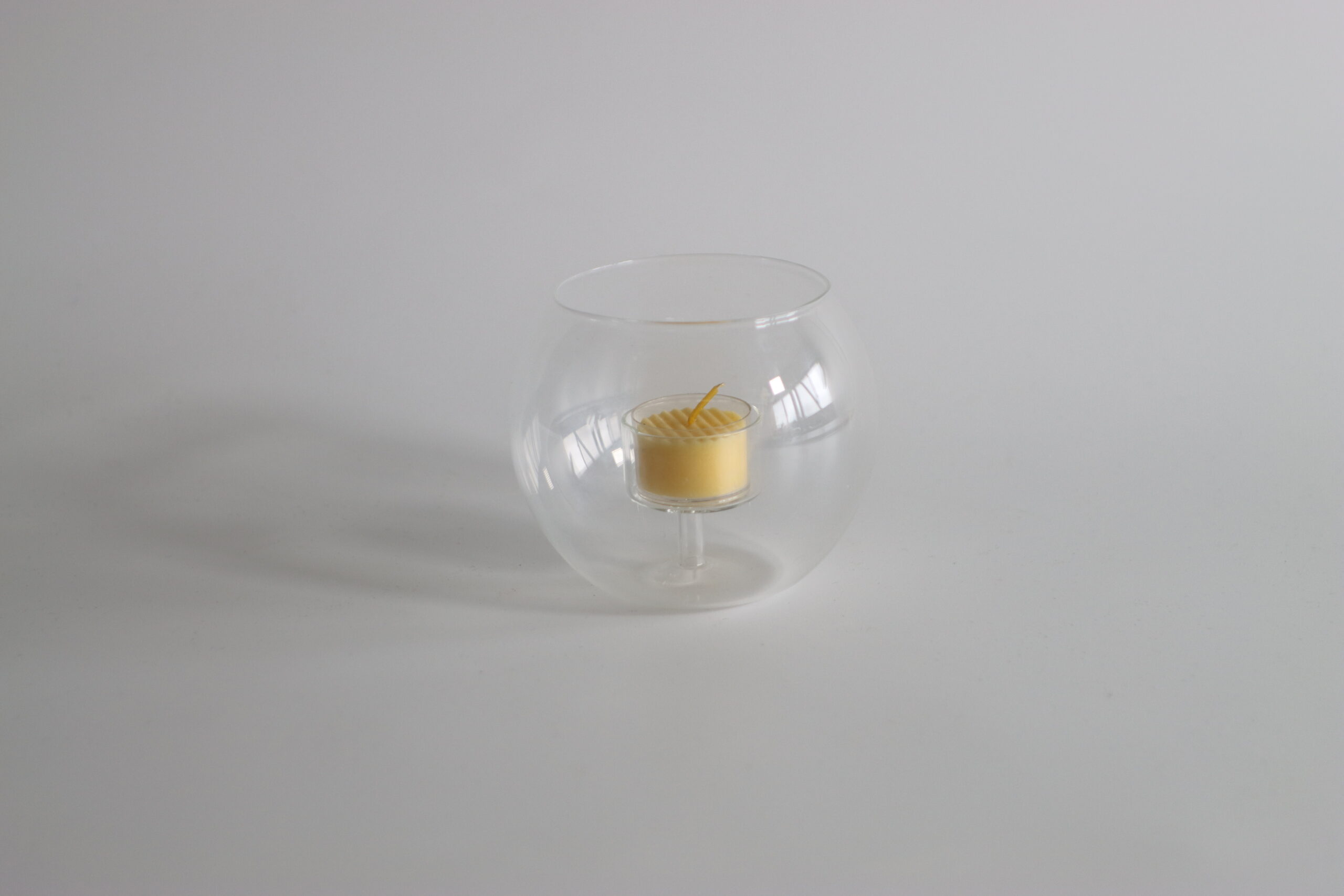 丸みのあるフォルムが印象的な、ガラス製キャンドルホルダー。