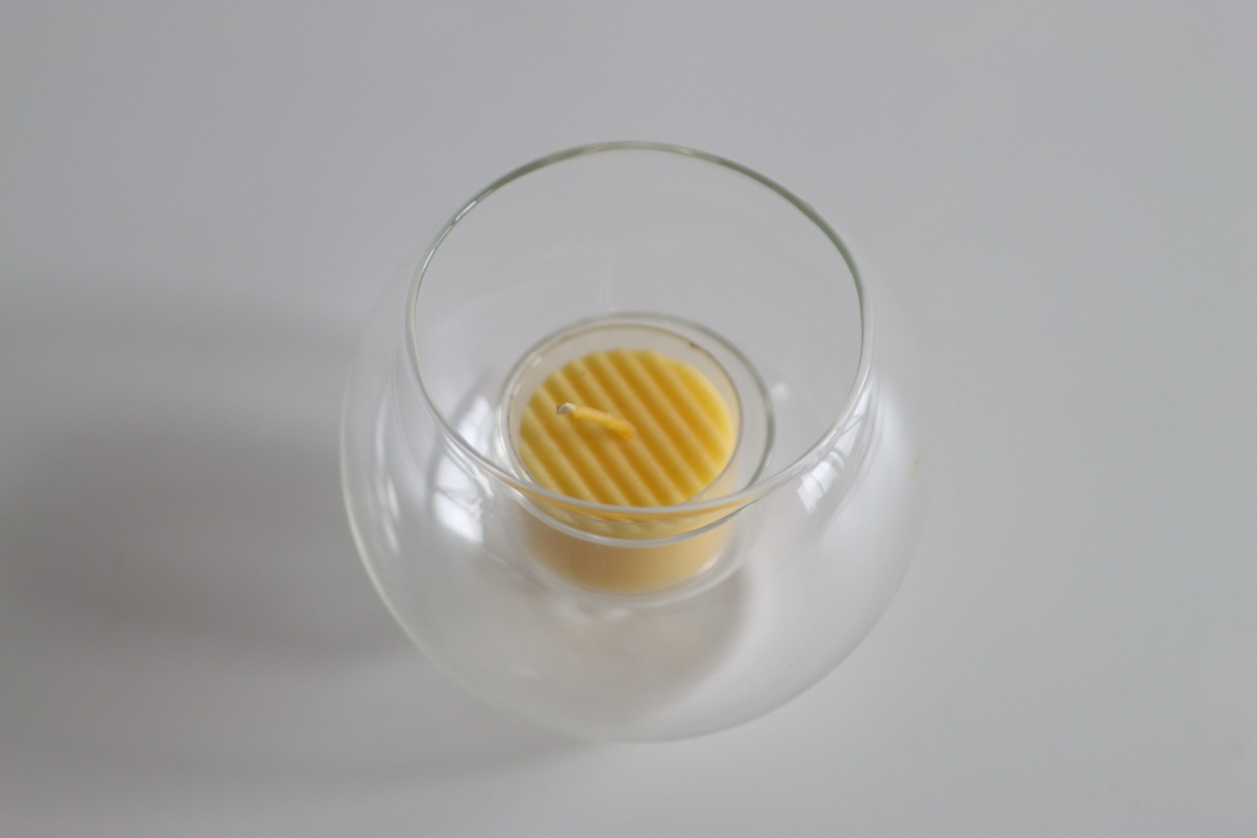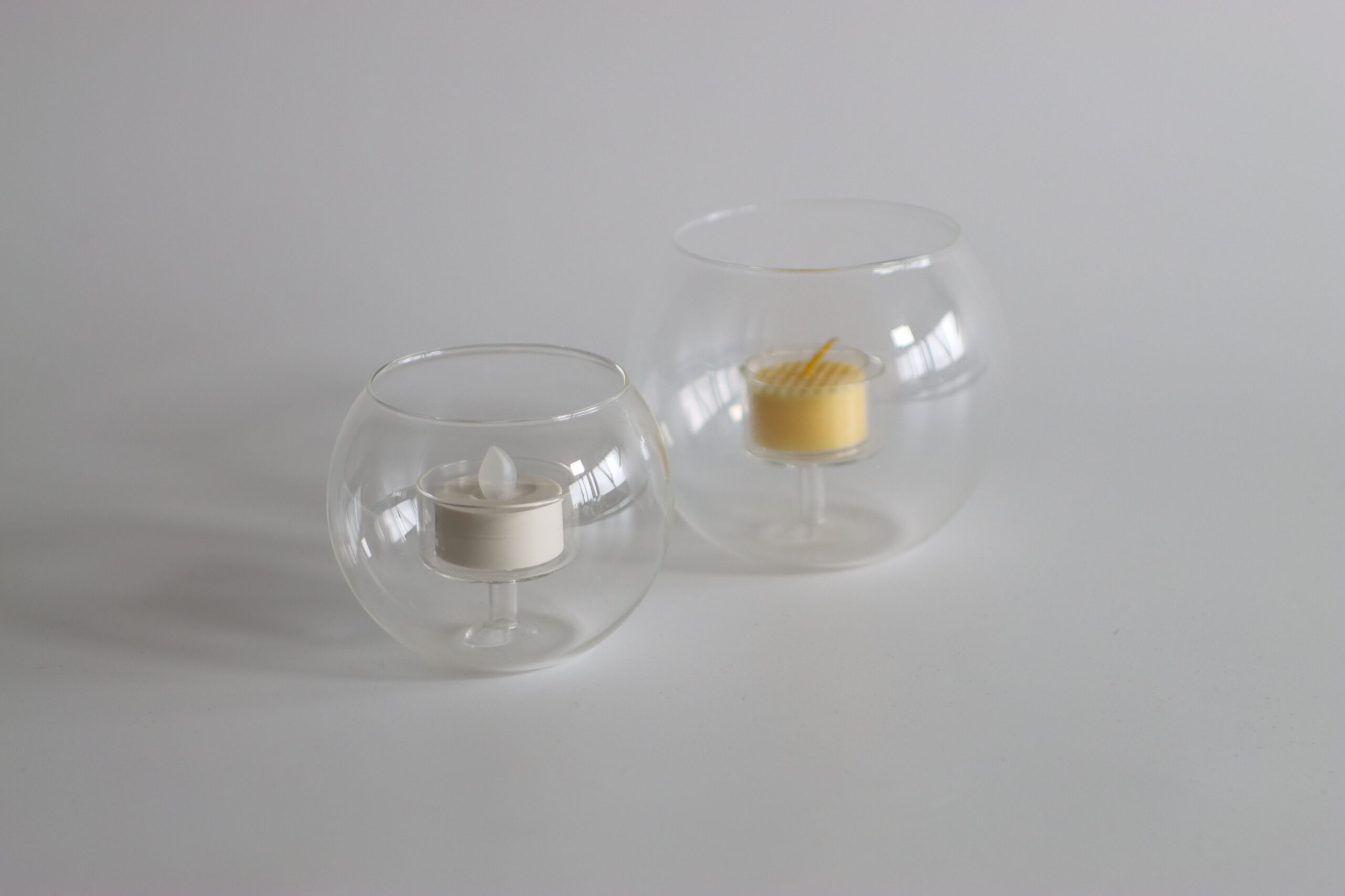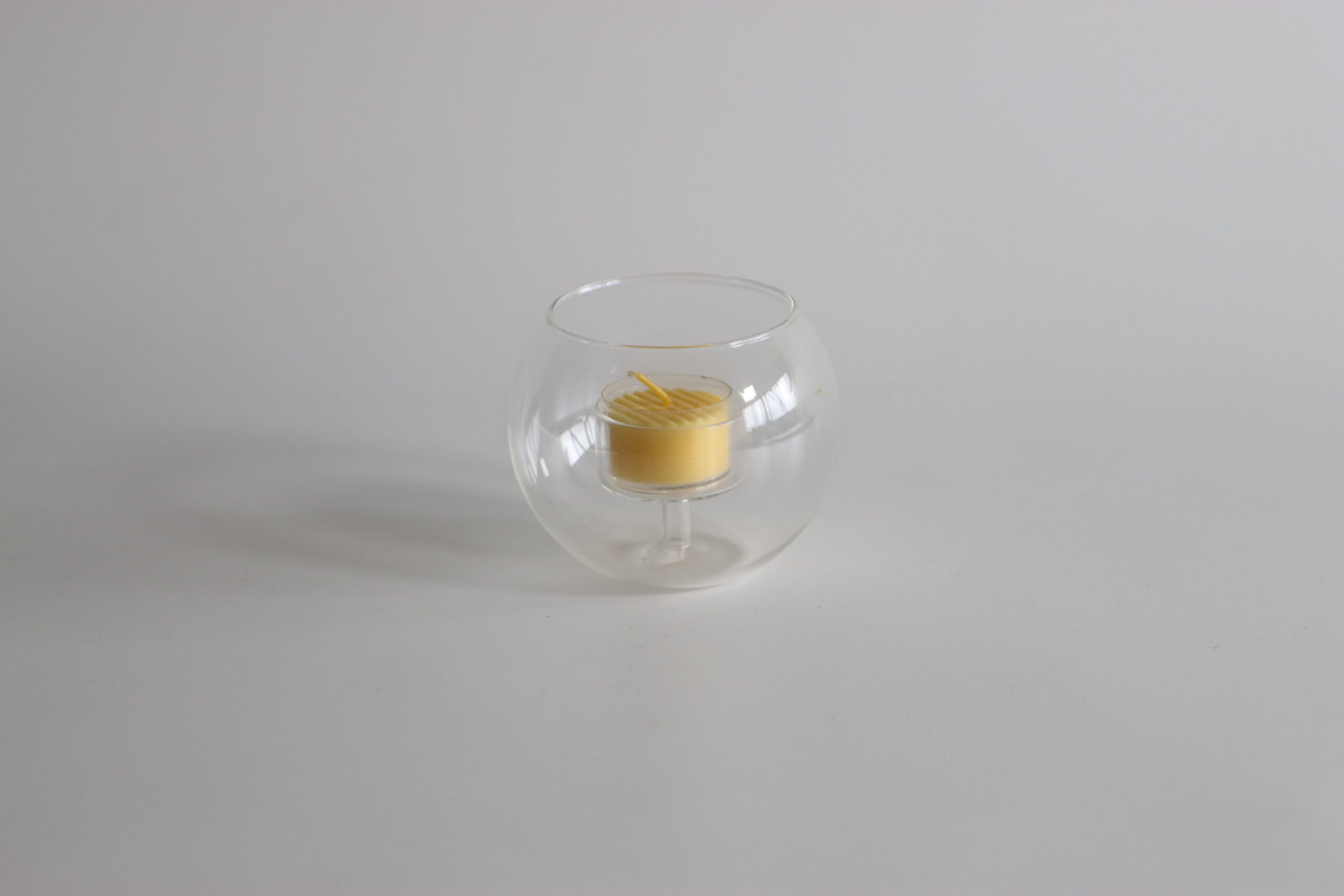 ワイドな丸みを持つフォルムが特徴の、ガラス製キャンドルホルダー。