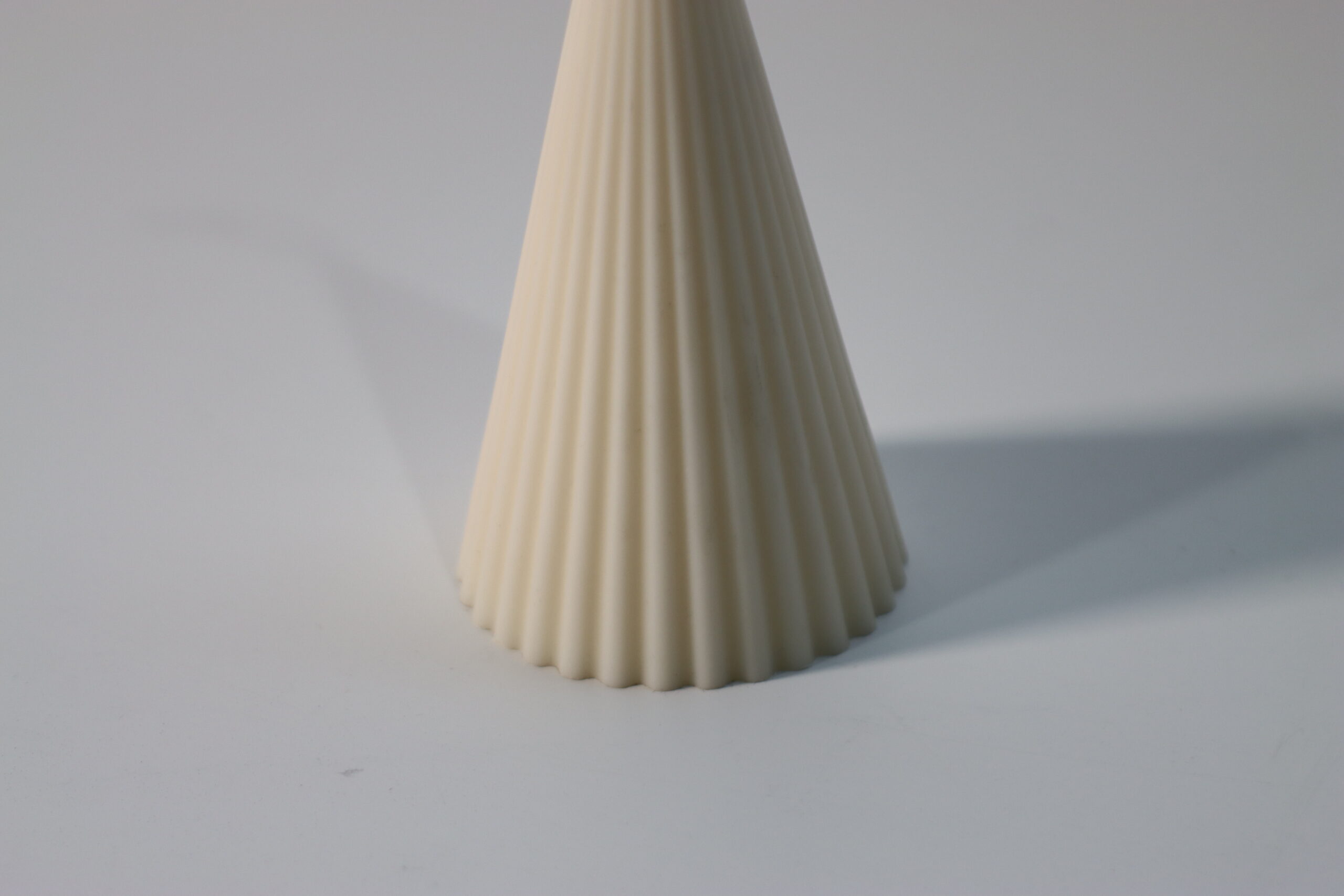 円錐形のボディに細やかな縦ラインのプリーツが施されており、灯した火の光がその凹凸に繊細な陰影を映し出します。