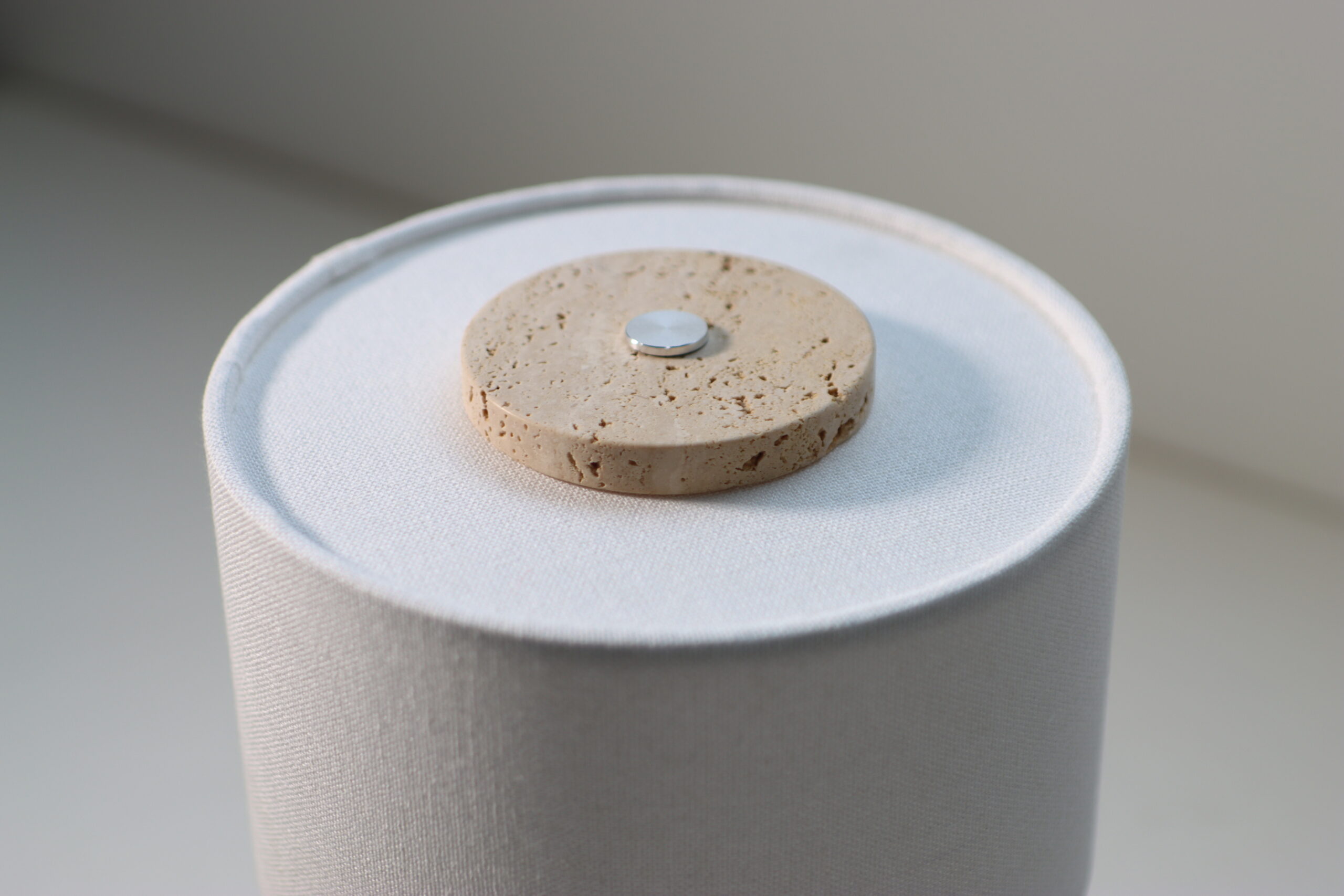 幾何学的なシリンダーベースと、その頂点に配された円形の石材パーツ、そして水平方向へ広がるファブリックシェードの構成は、ミニマルなセットにおいて、素材の純粋さを際立たせる「光の彫刻」として機能します。