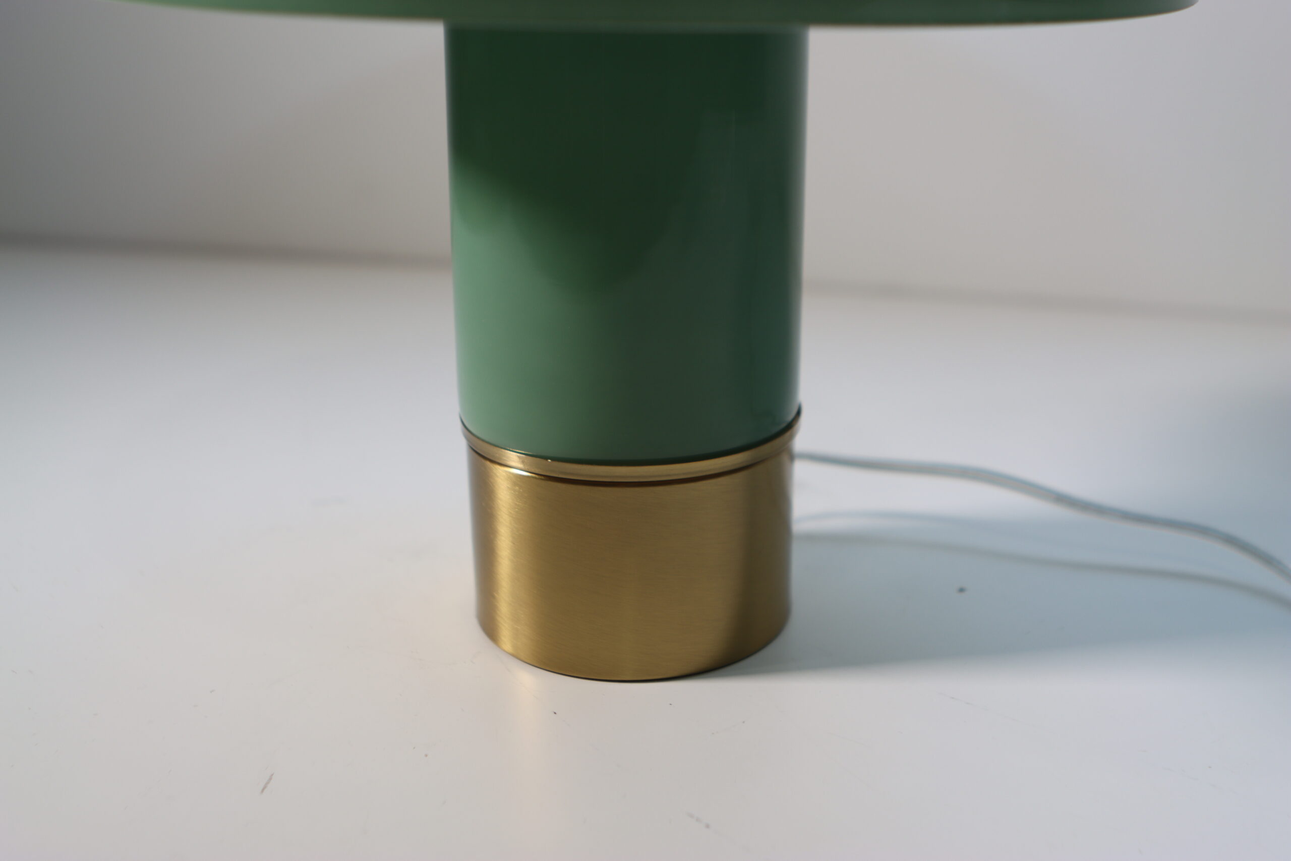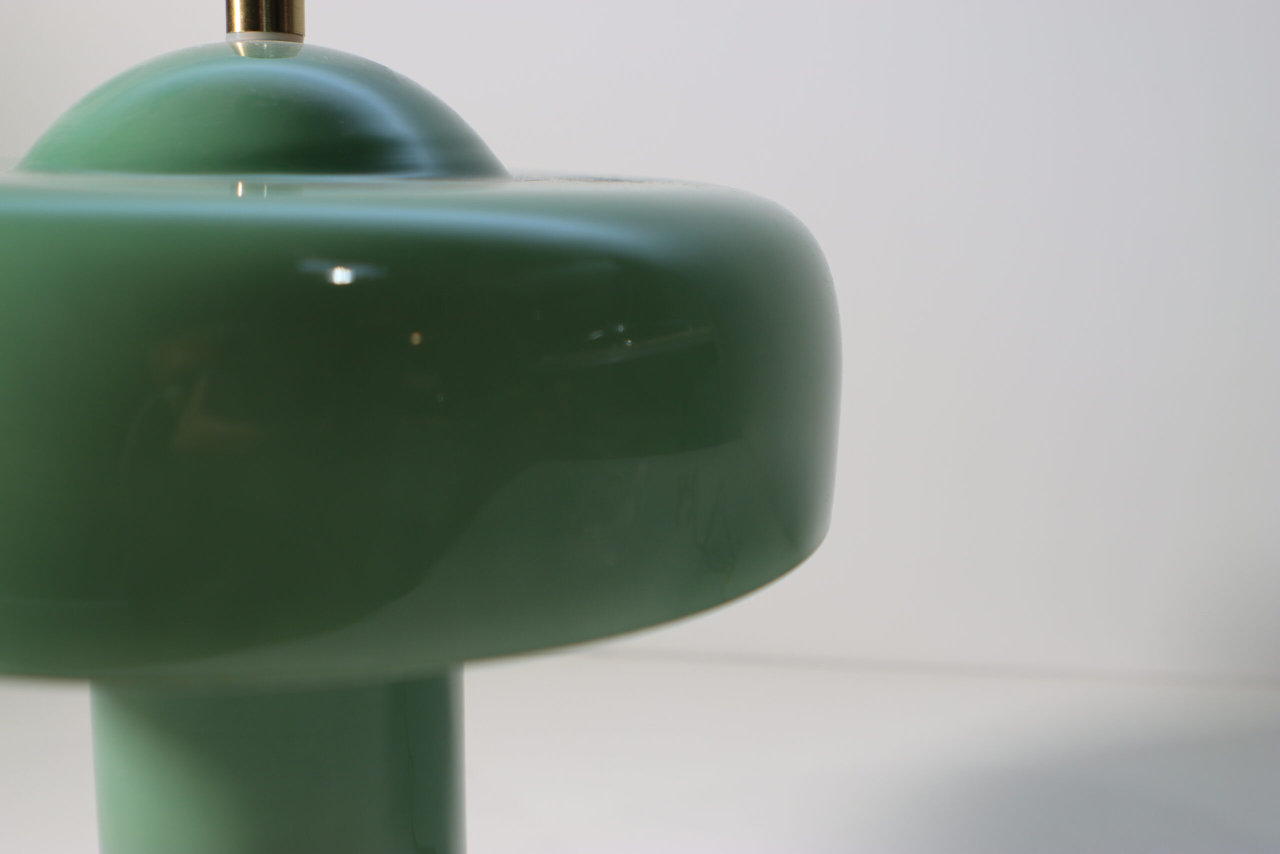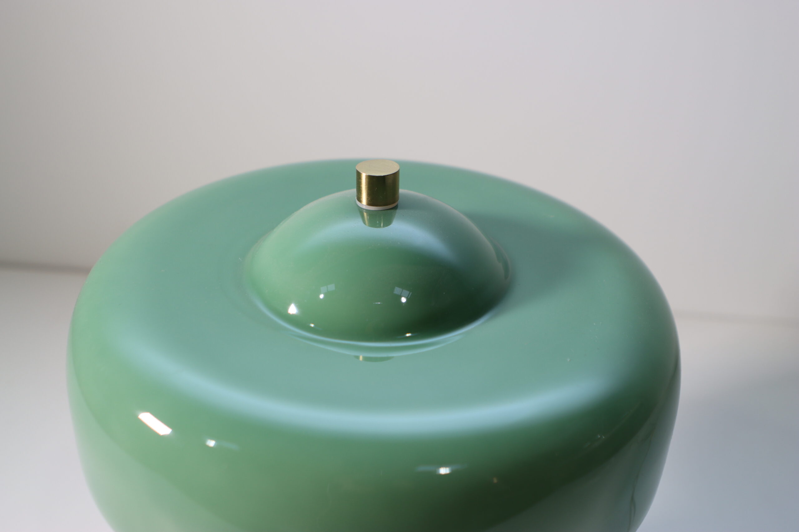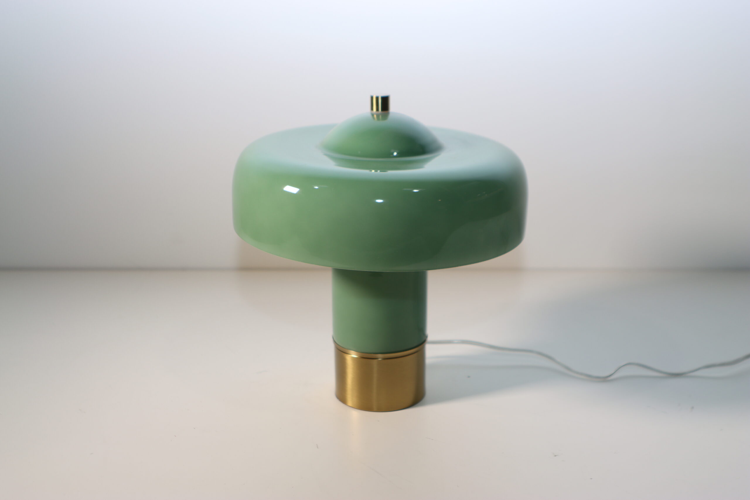 艶やかなセージグリーンのガラスシェードと、重厚な真鍮(ブラス)ベースのコントラストが、空間に「レトロモダンな知性」と洗練された色彩のアクセントを付与します。