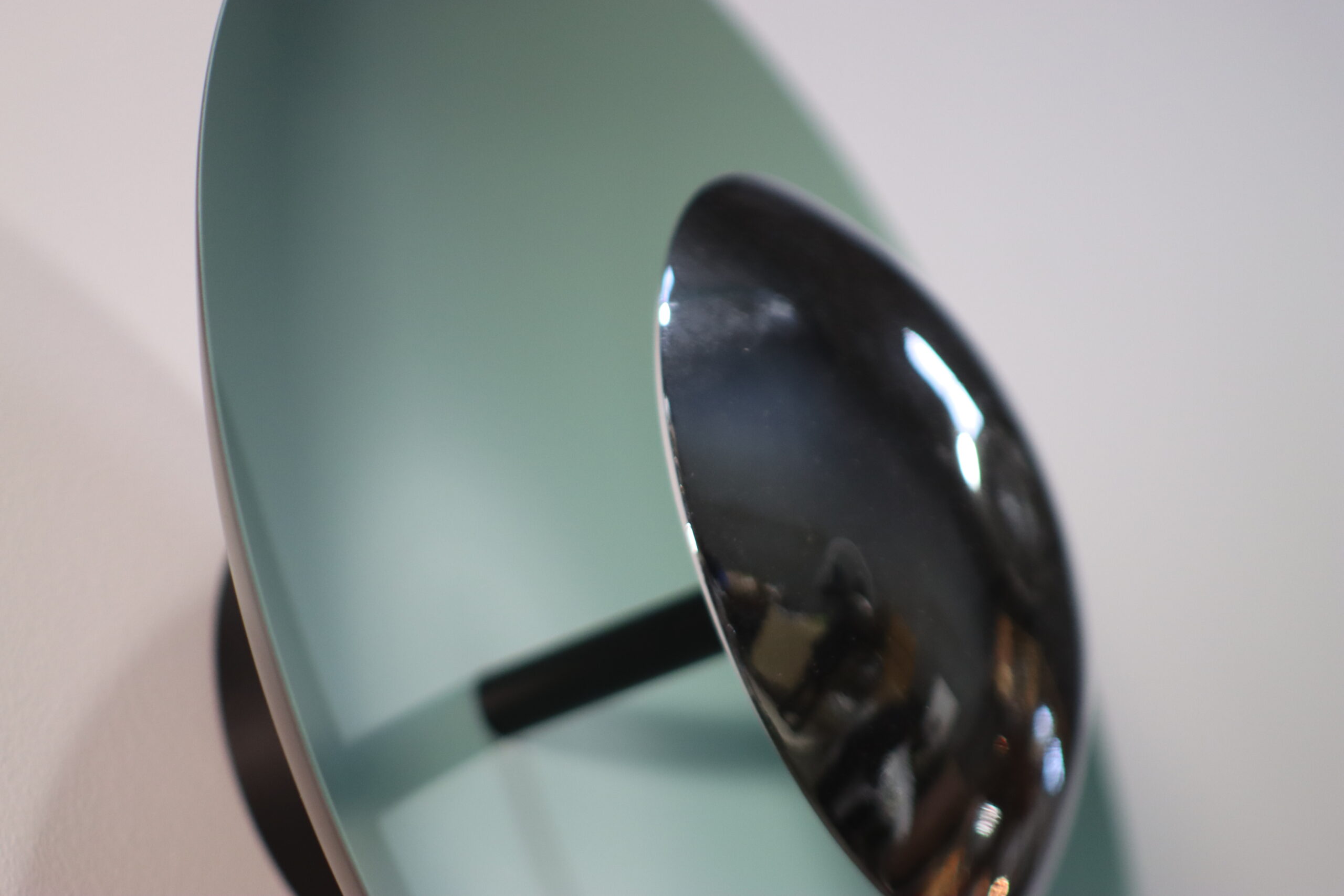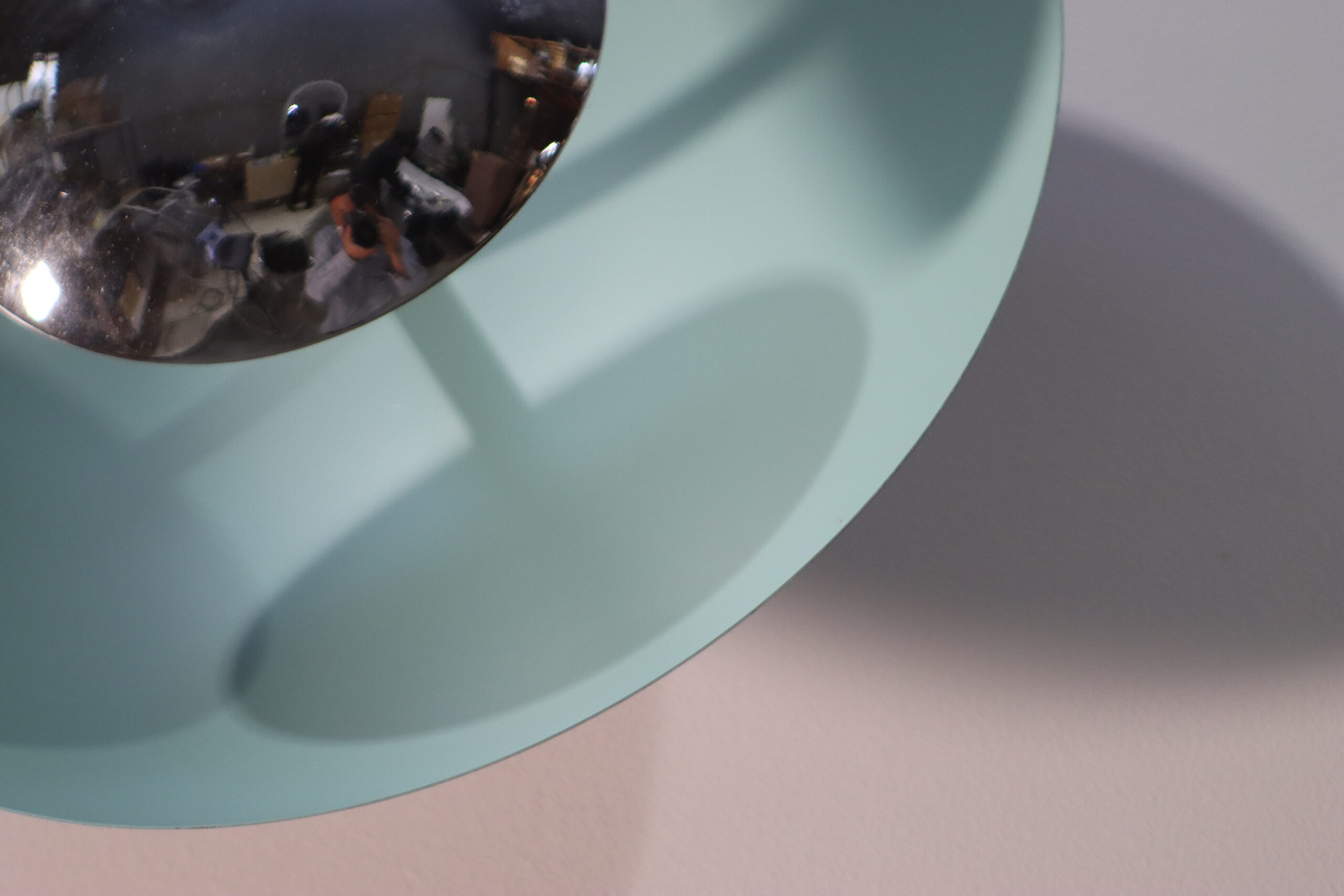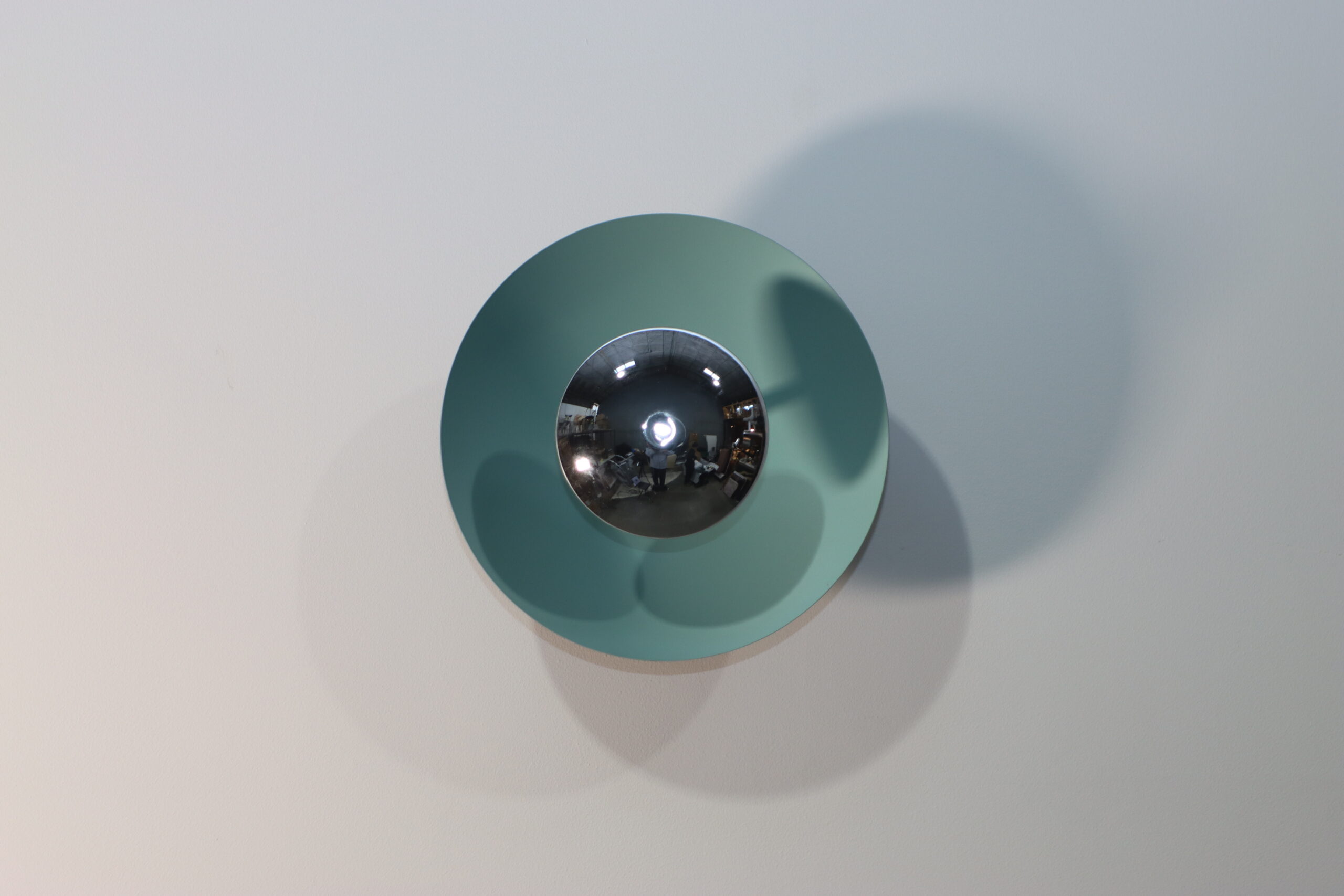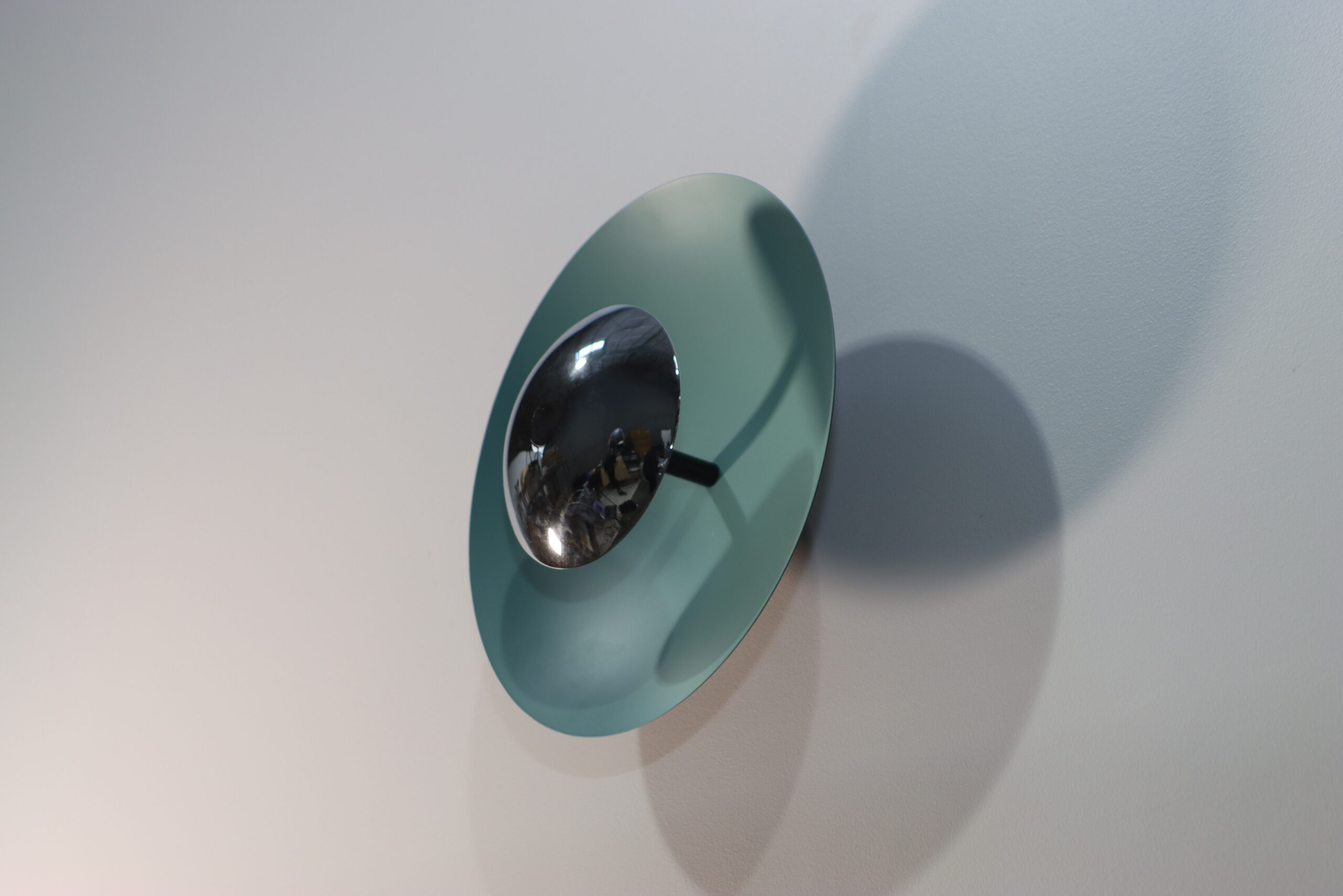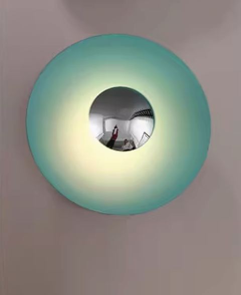 中央のミラー状の光源から、外周に向けてミントグリーンからイエローへと変化する柔らかな色彩が広がり、壁面にオーロラのような美しい光の輪を描き出します。