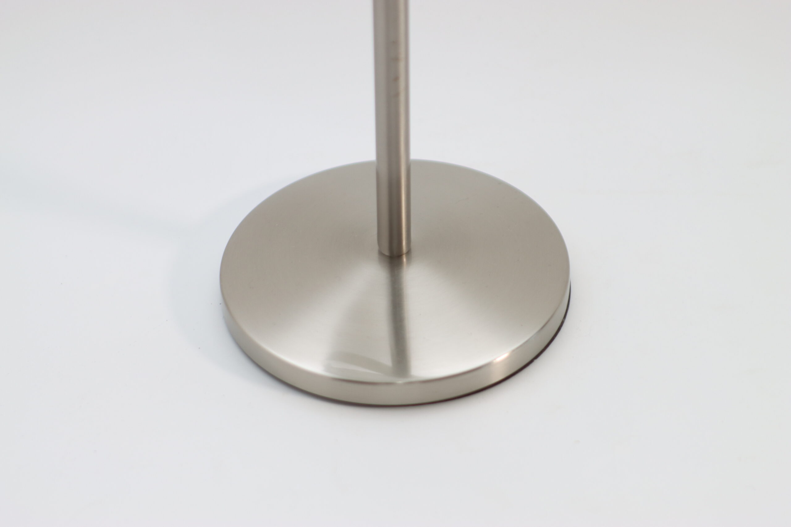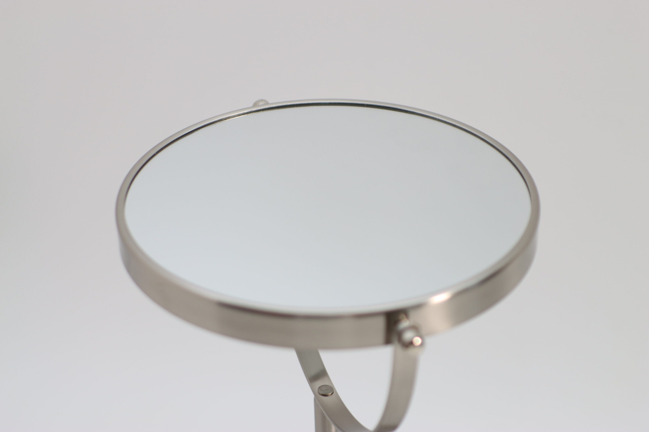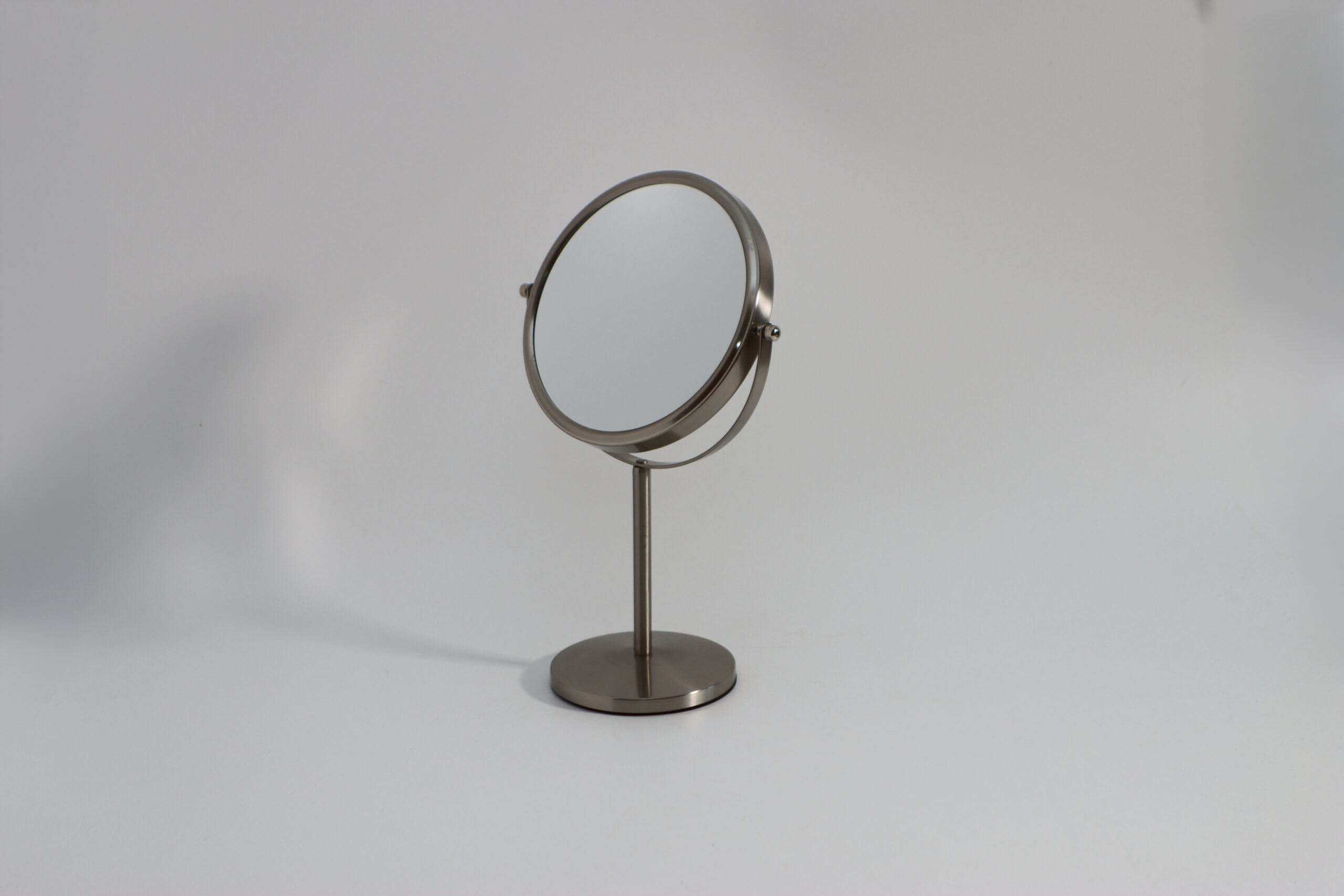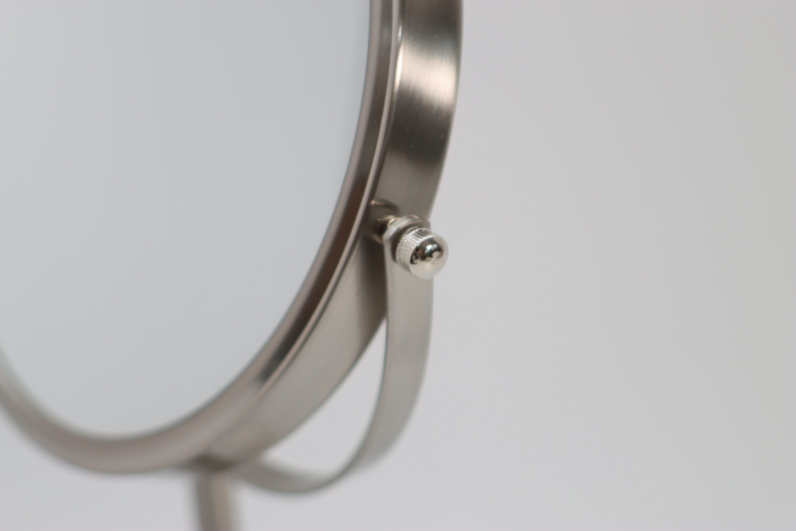 シルバートーンの金属素材を用いた、ミニマルな円形の置き式ミラー。