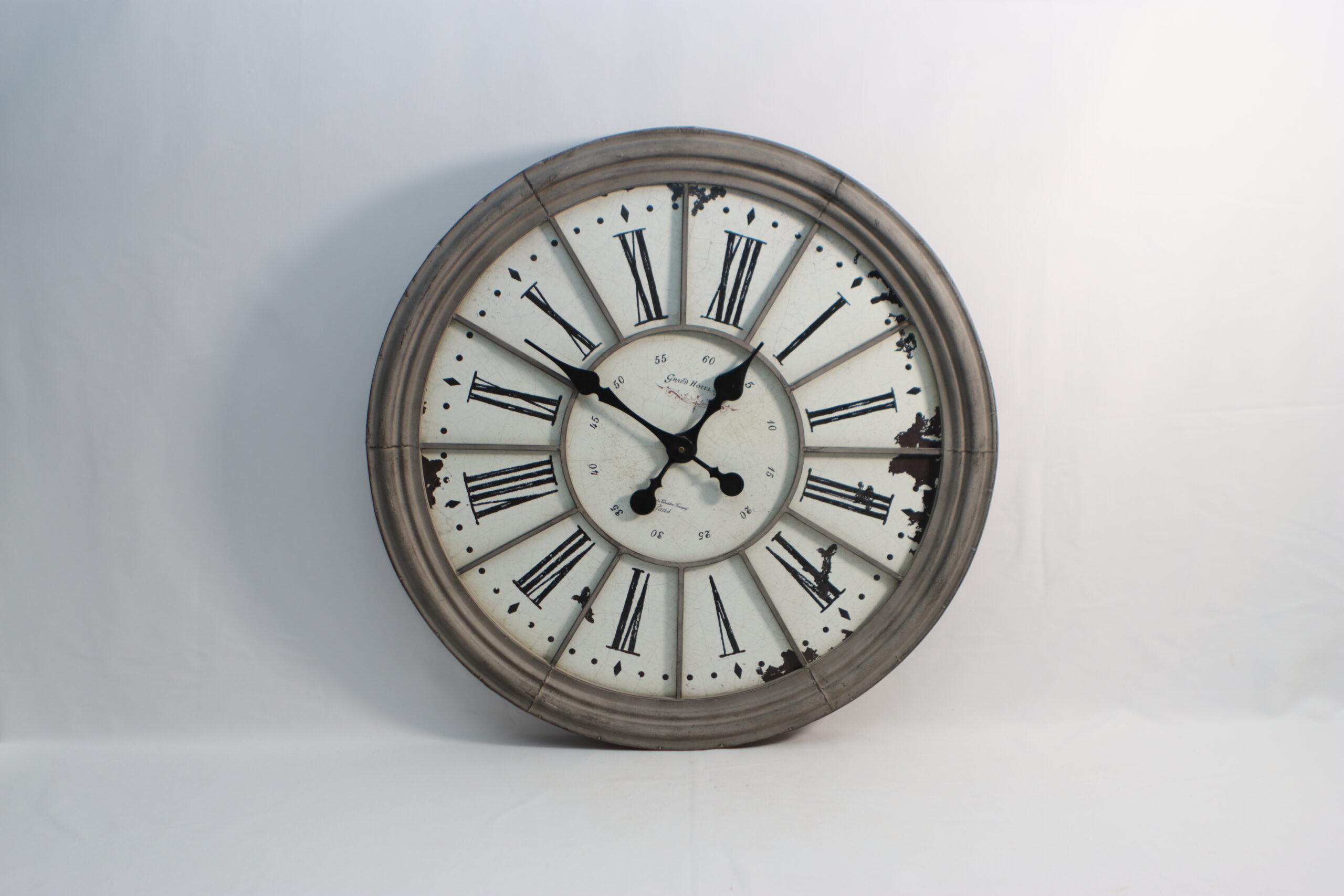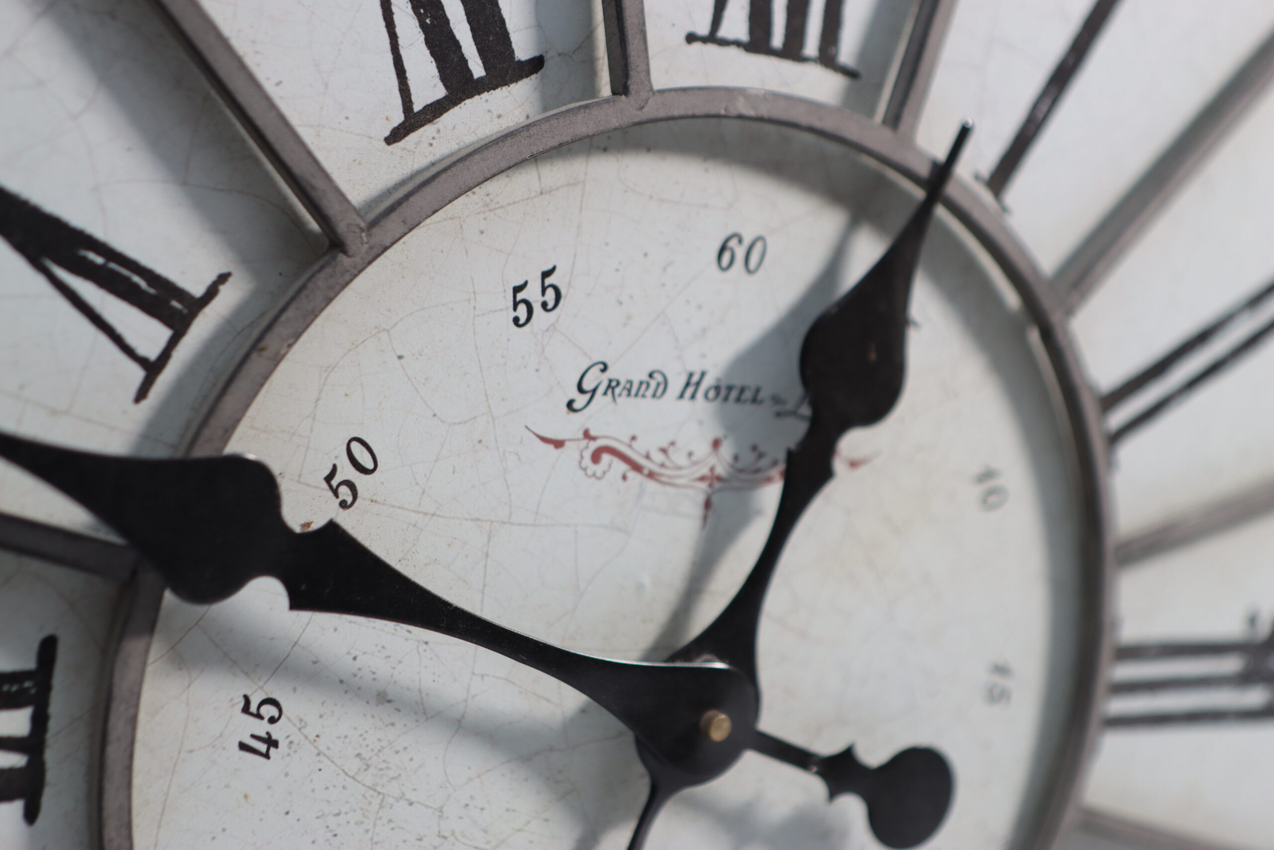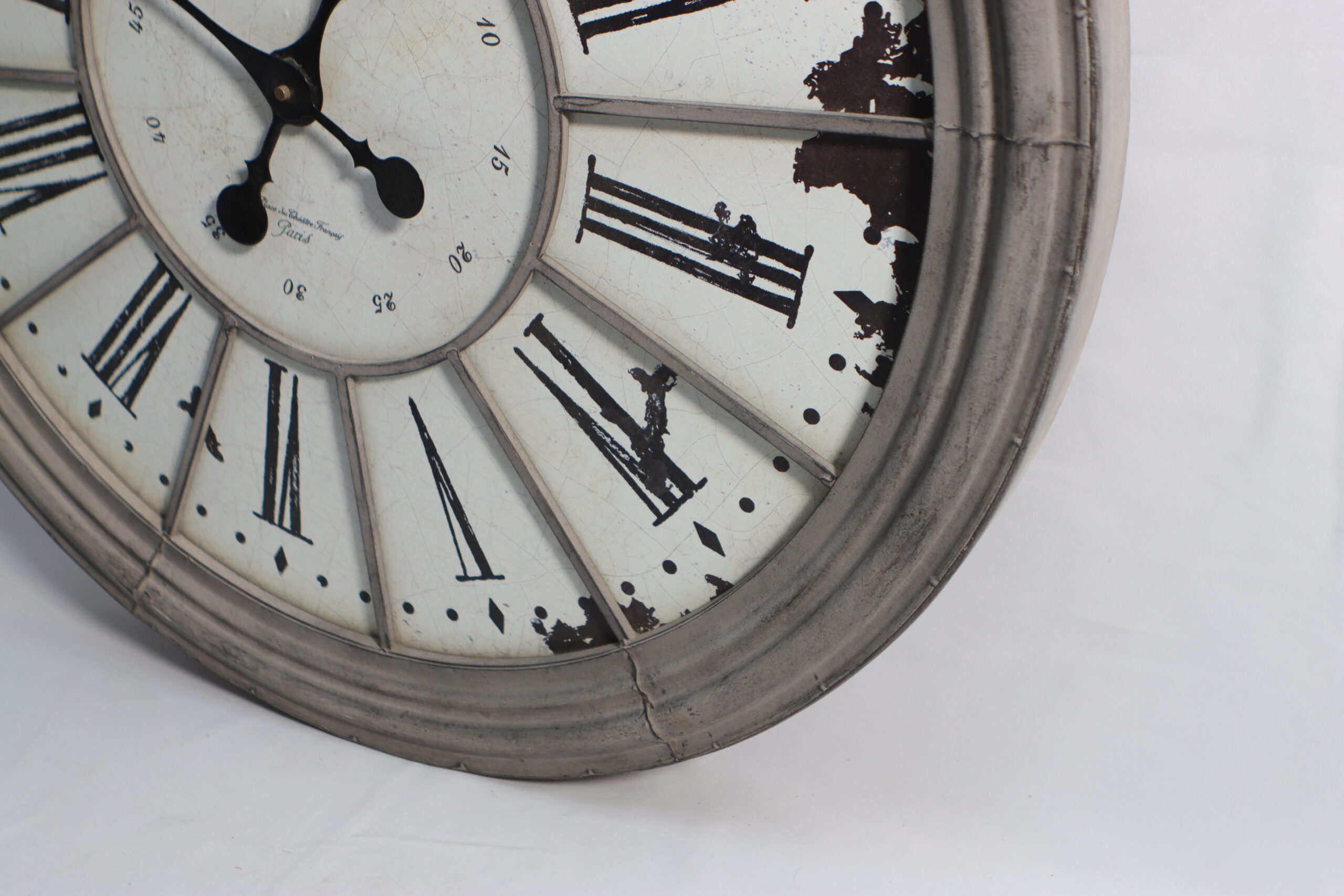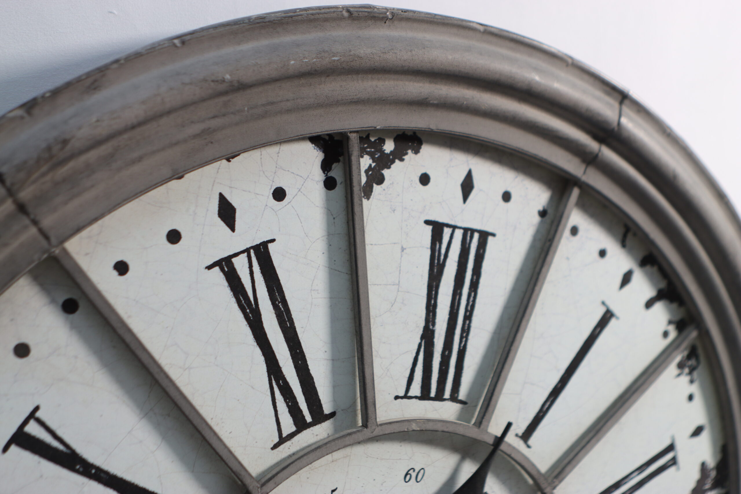 大型ヴィンテージ・ウォールクロックは、経年変化を感じさせるひび割れた文字盤と、掠れたローマ数字のタイポグラフィが、空間に「積み重ねられた時間」という圧倒的な重厚感を与えます。