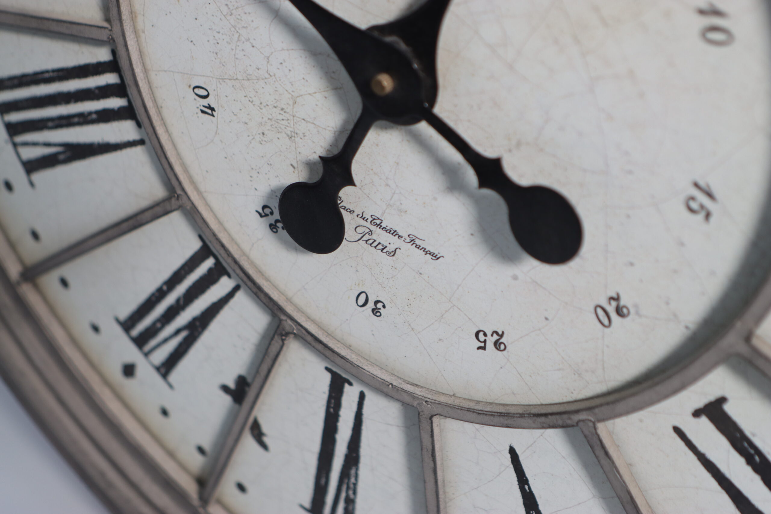 直径のある大型ヴィンテージ・ウォールクロックは、広い壁面やスタジオセットにおいて強力なフォーカルポイント(視線を集める点)となり、クラシックかつ知的な世界観を瞬時に構築します。