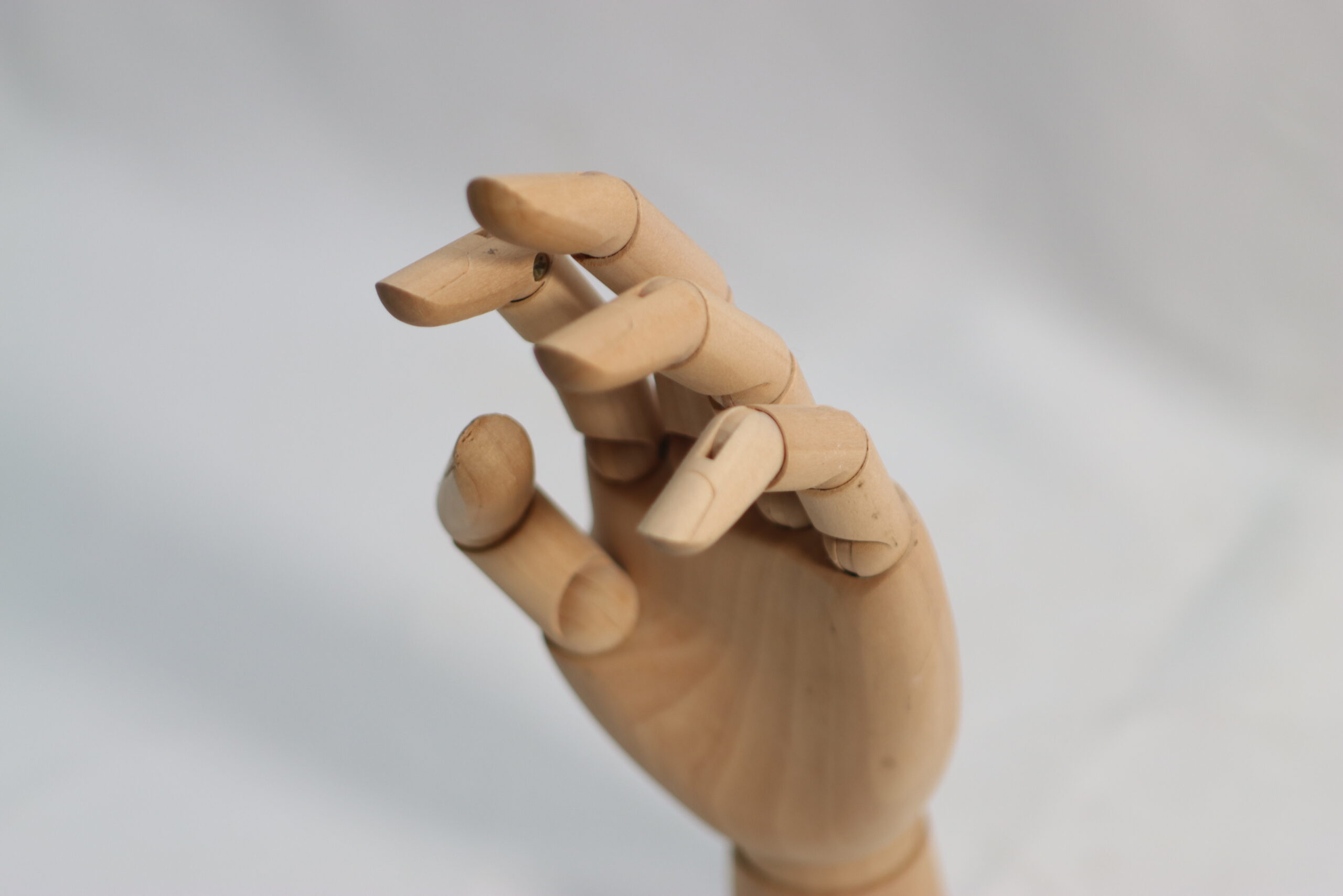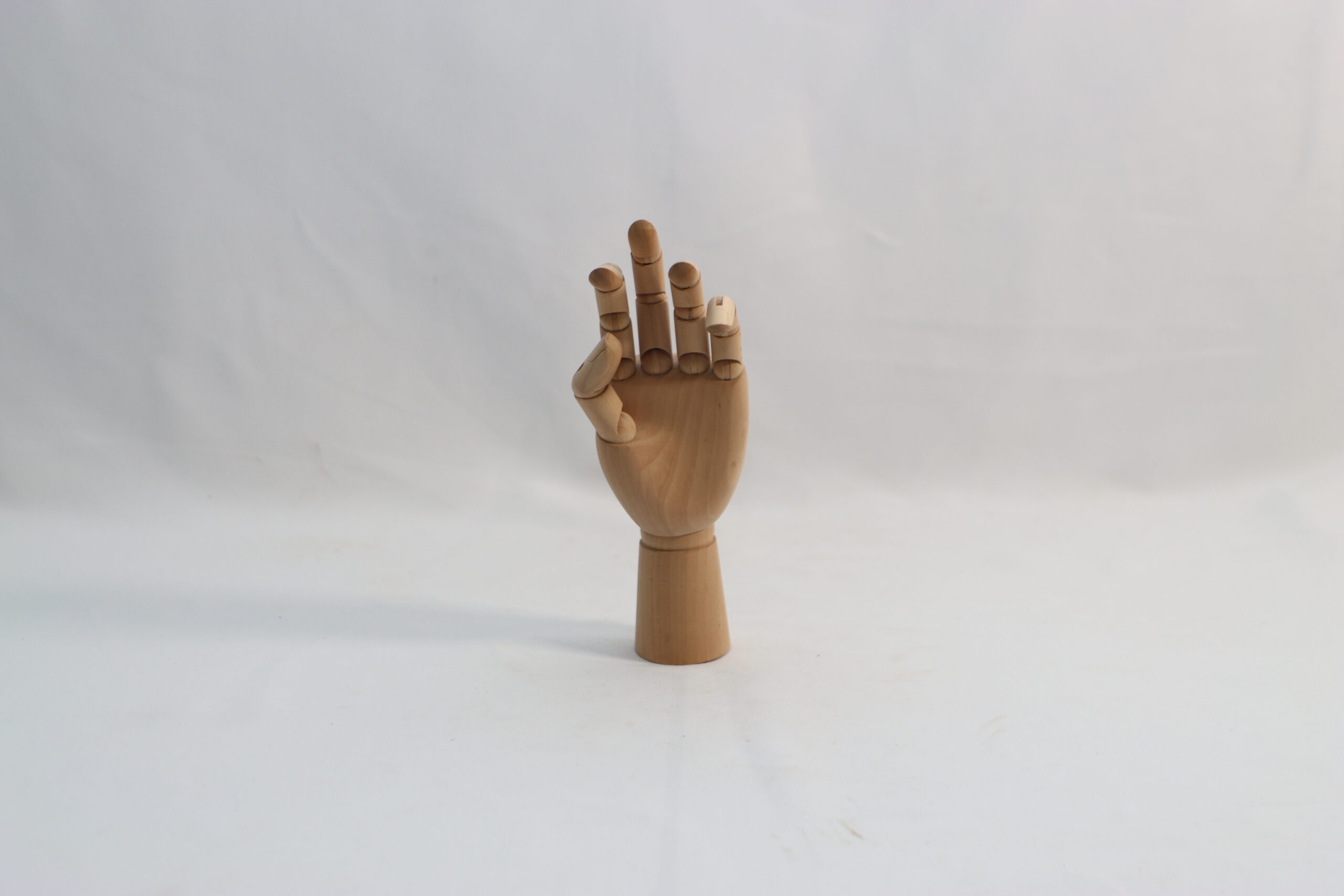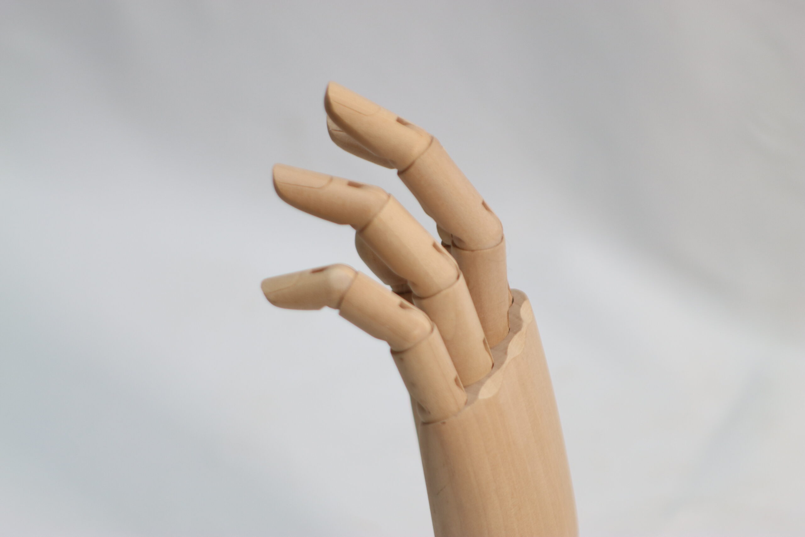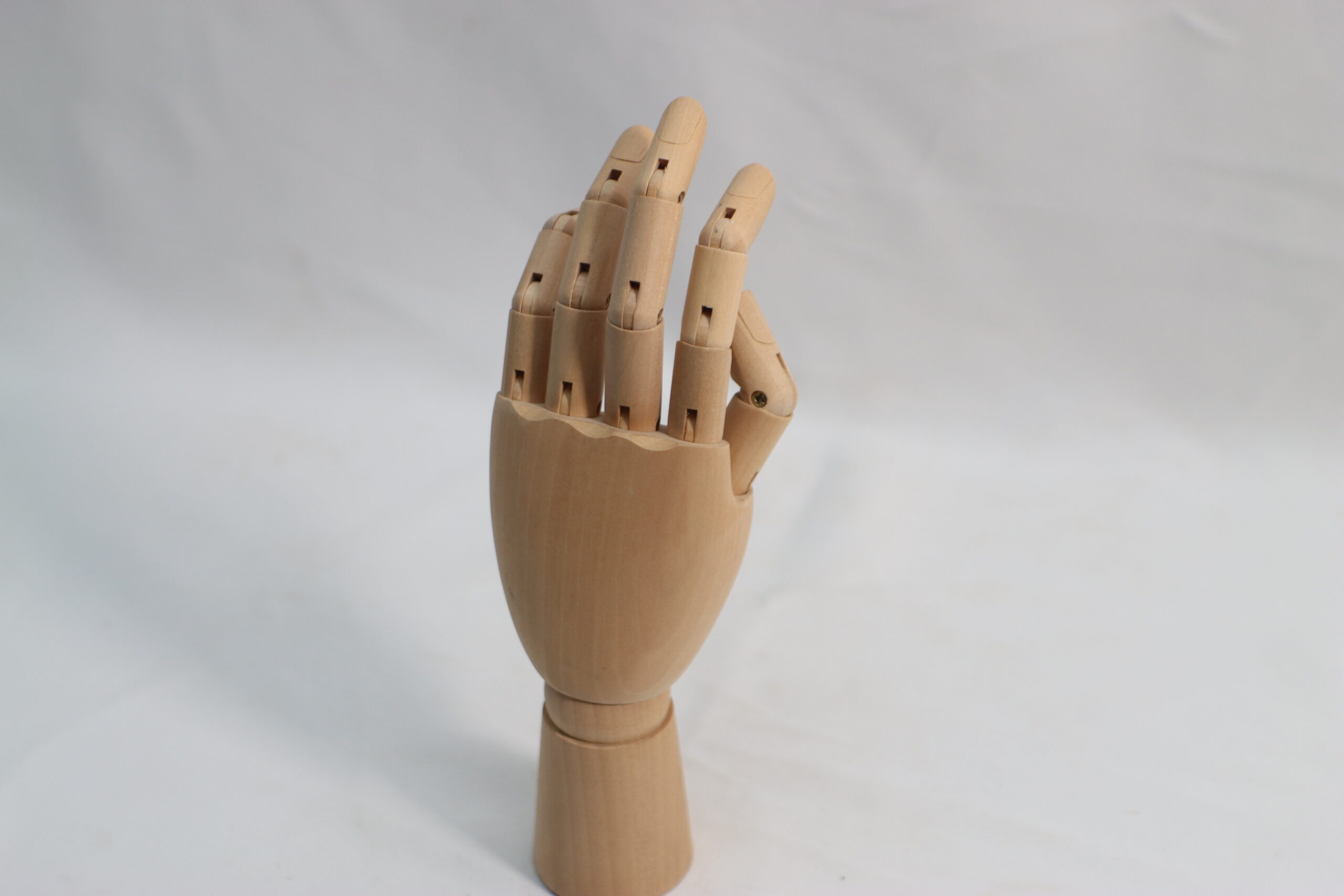指の曲線や親指の対向動作をリアルに再現できる、側面からのシルエットが美しい木製ハンドマネキンです。