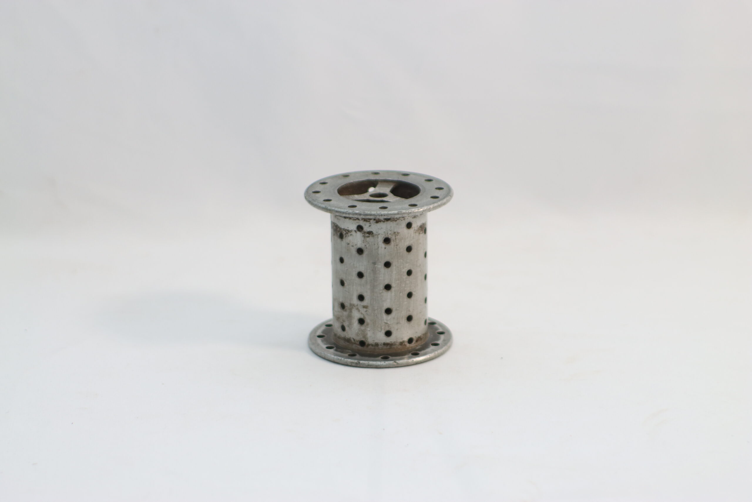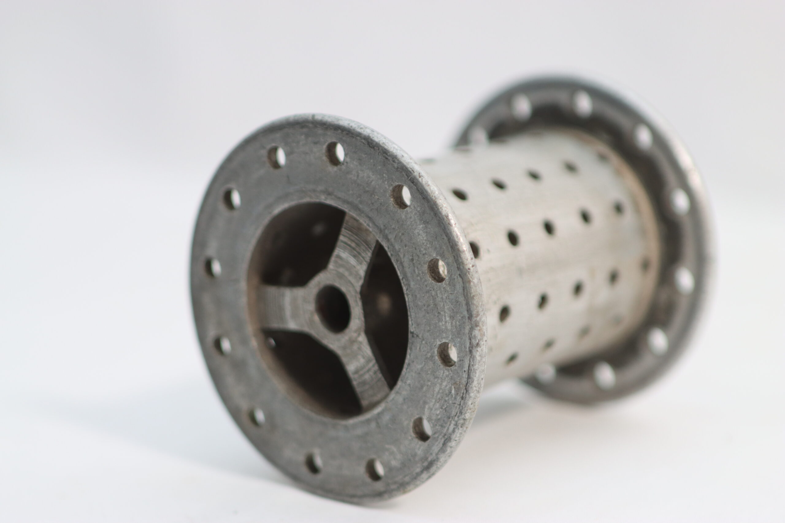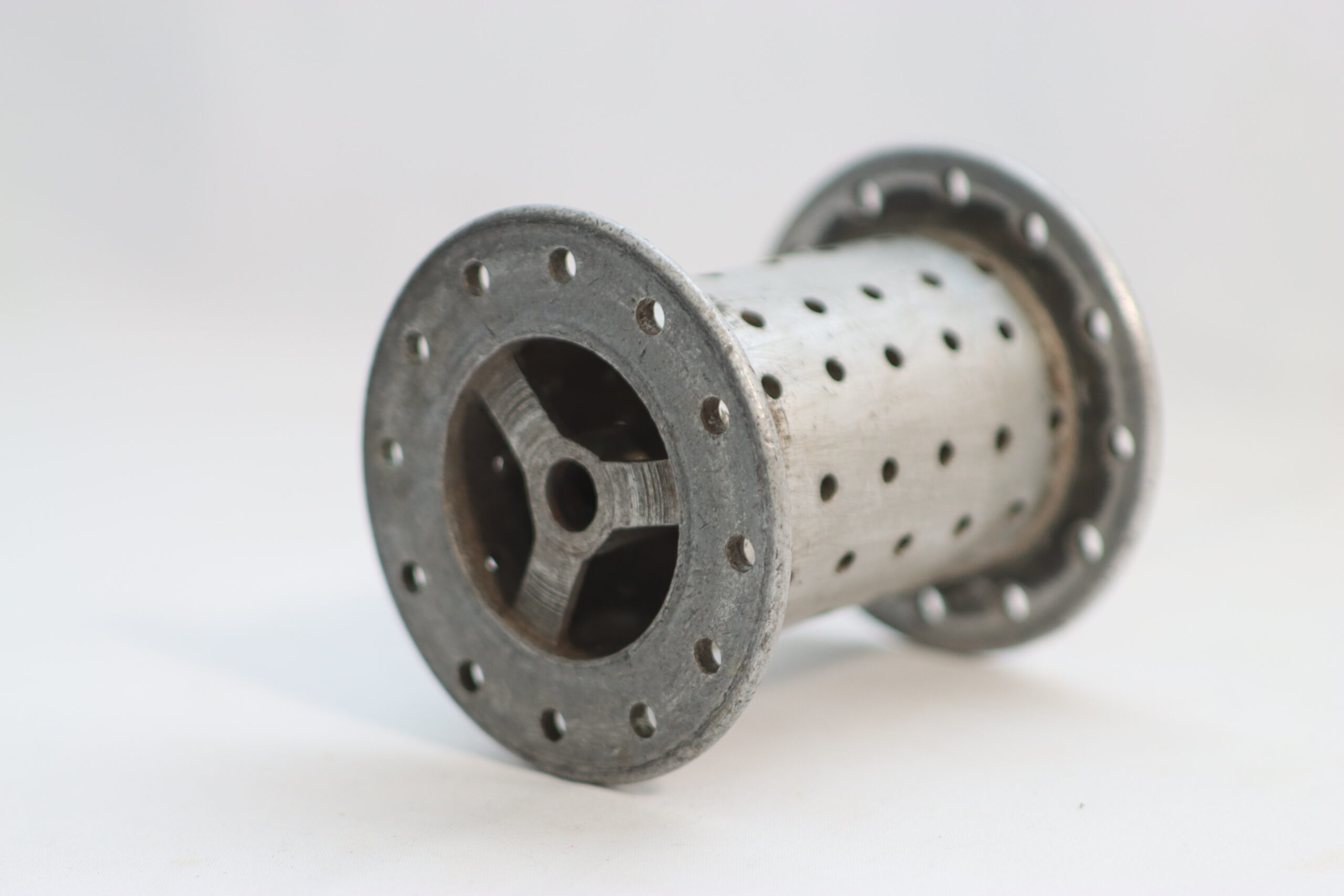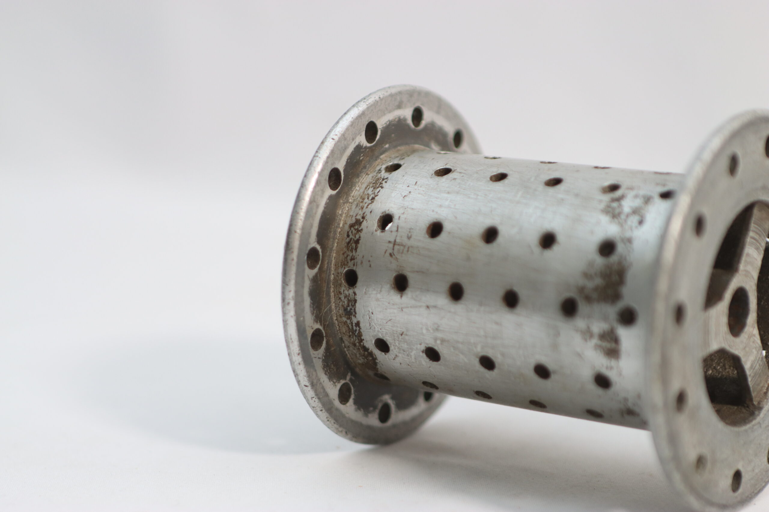 規則的に並んだホールが機能美を感じさせる、堅牢なアルミニウム(または合金)製のメタルボビンです。