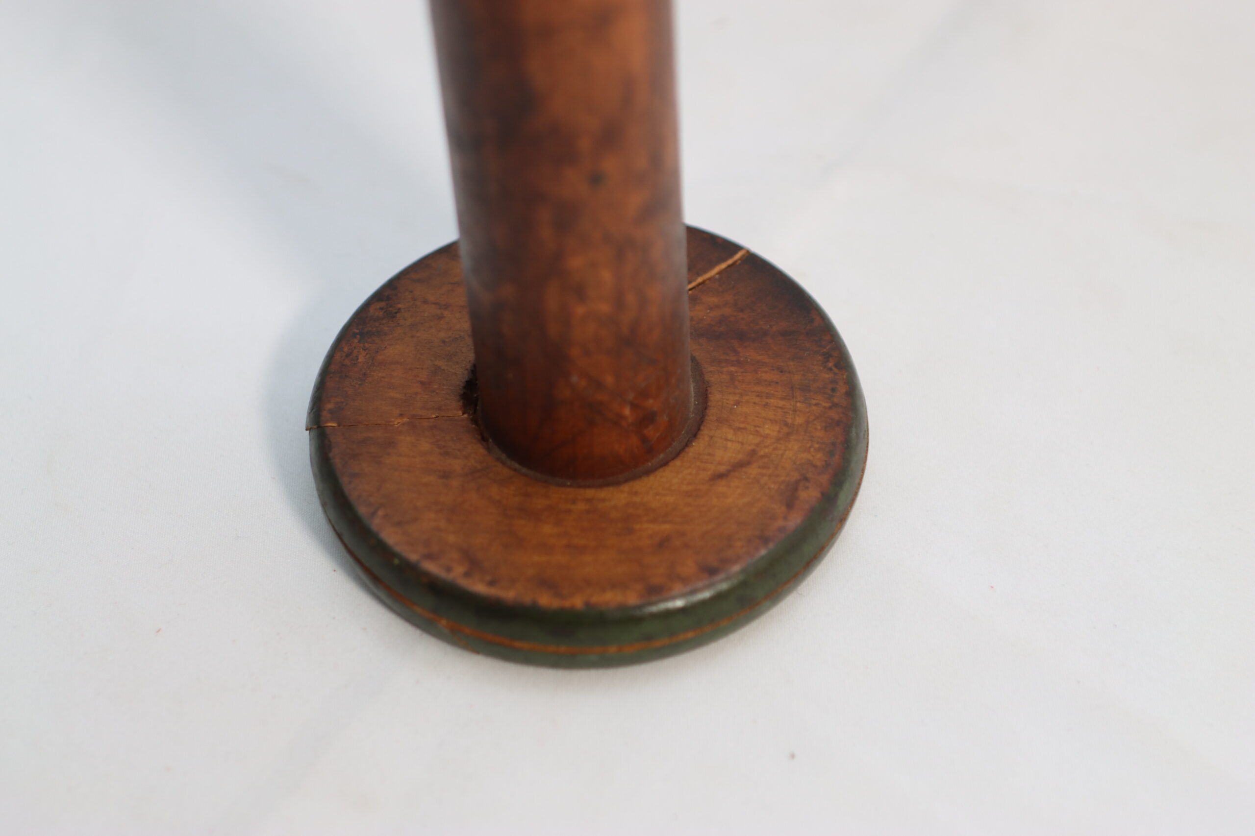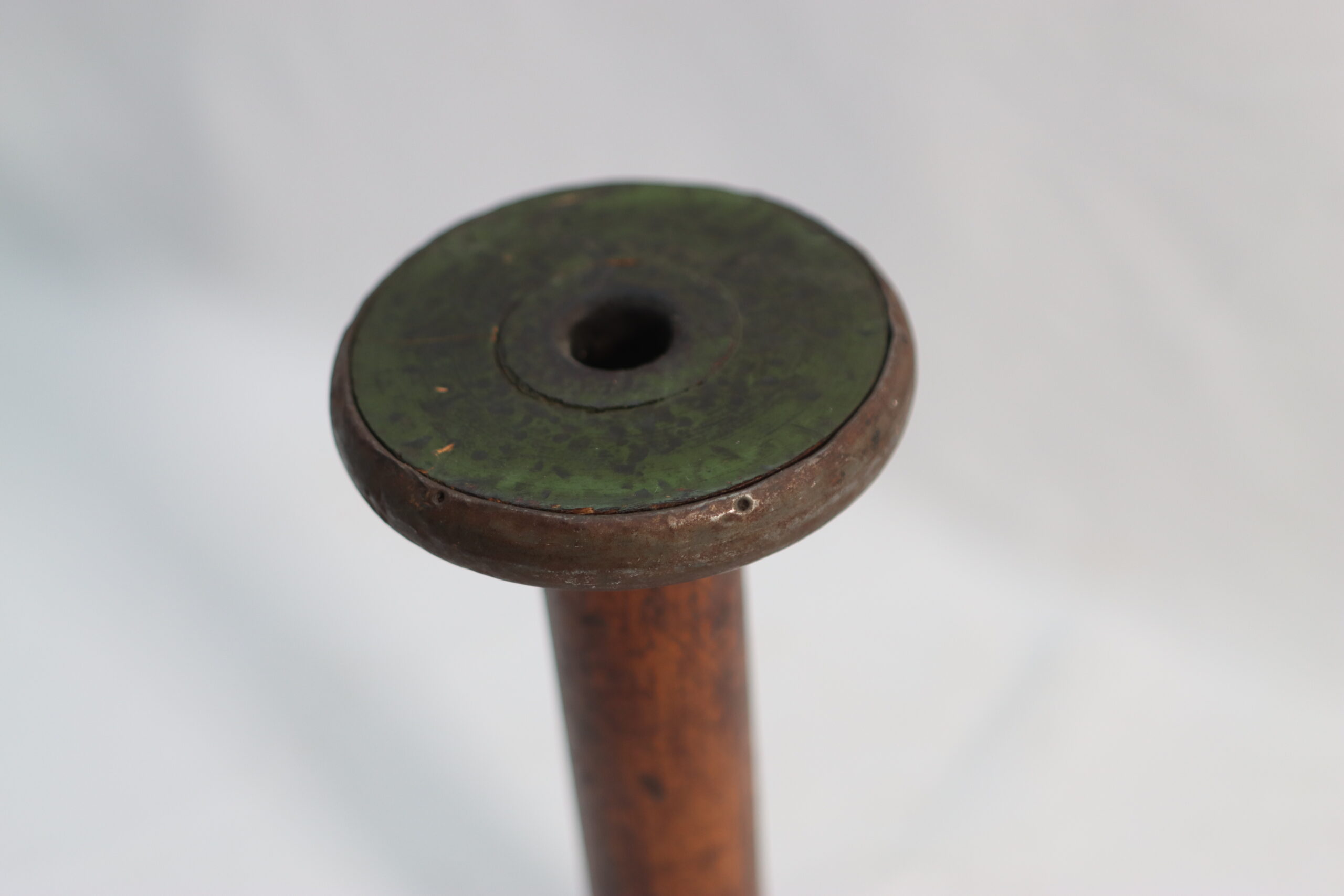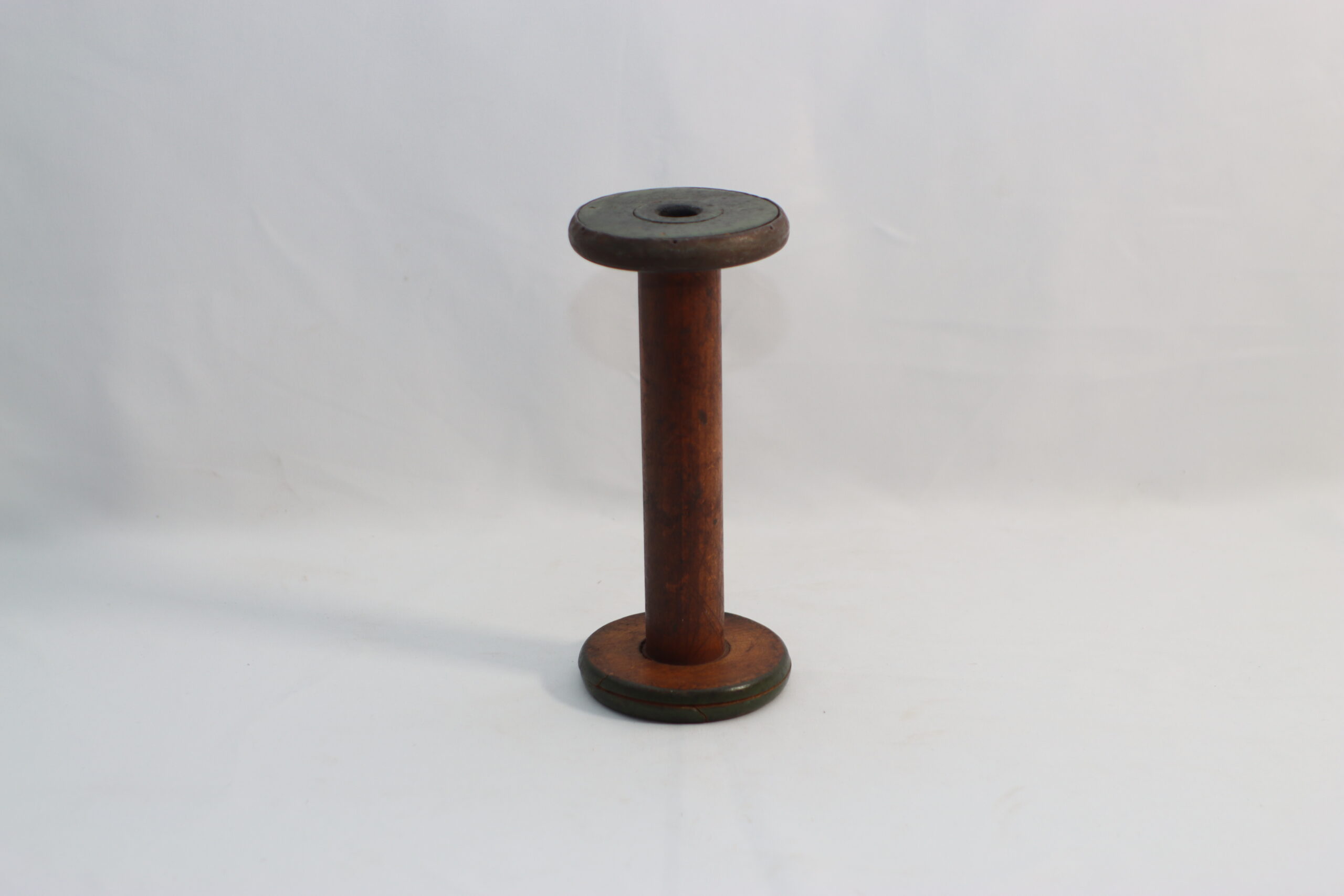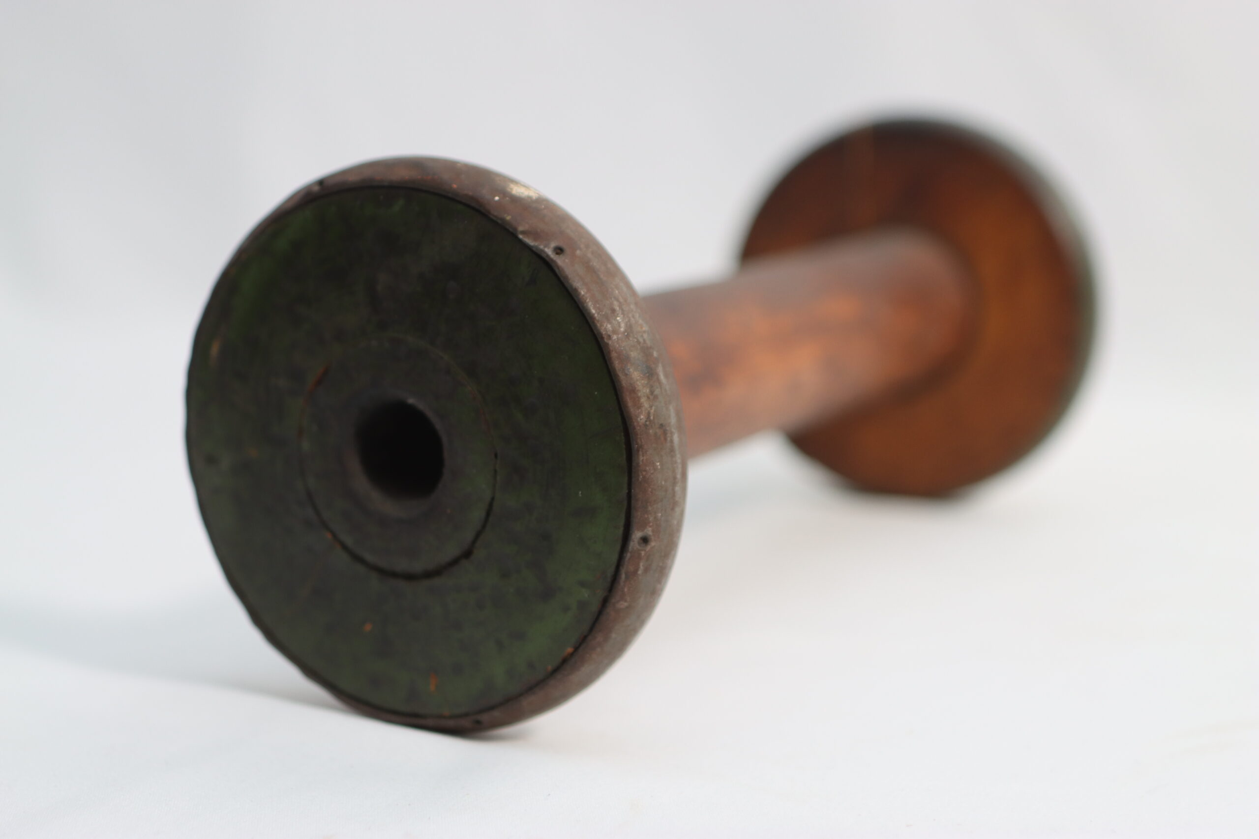 ヴィンテージ・ウッドスプールは、緑色の塗装剥げと露出した木肌が高い経年変化を感じさせ、「伝統的な手仕事」や「古き良き工場の記憶」を想起させる名脇役となります。