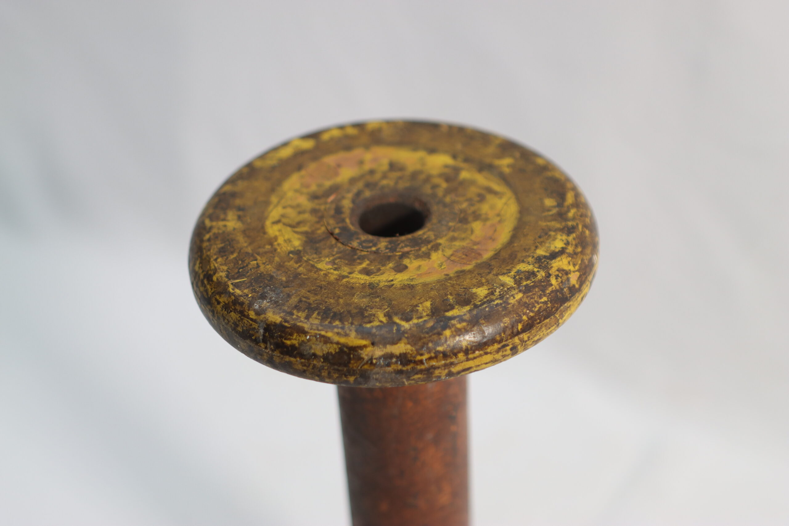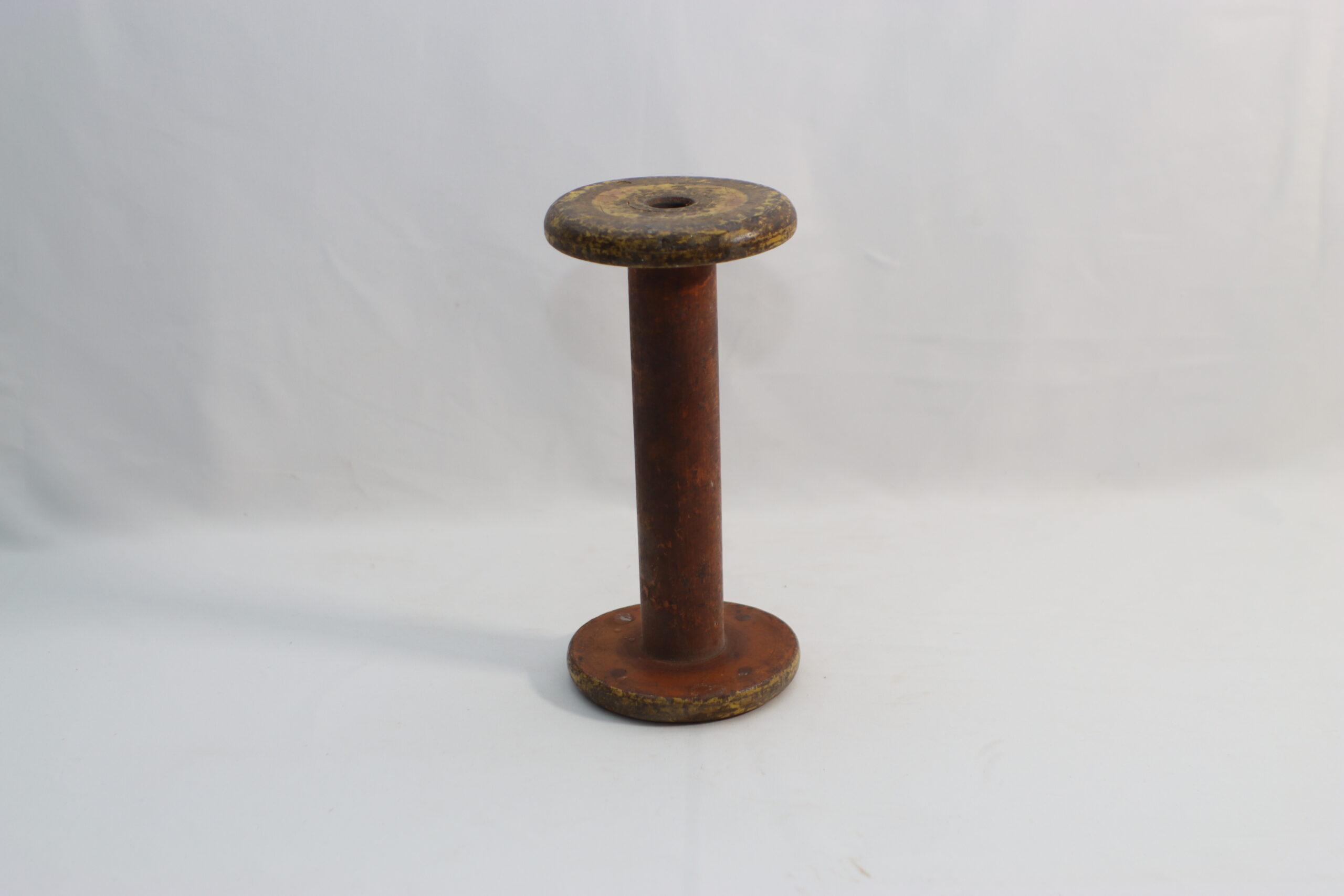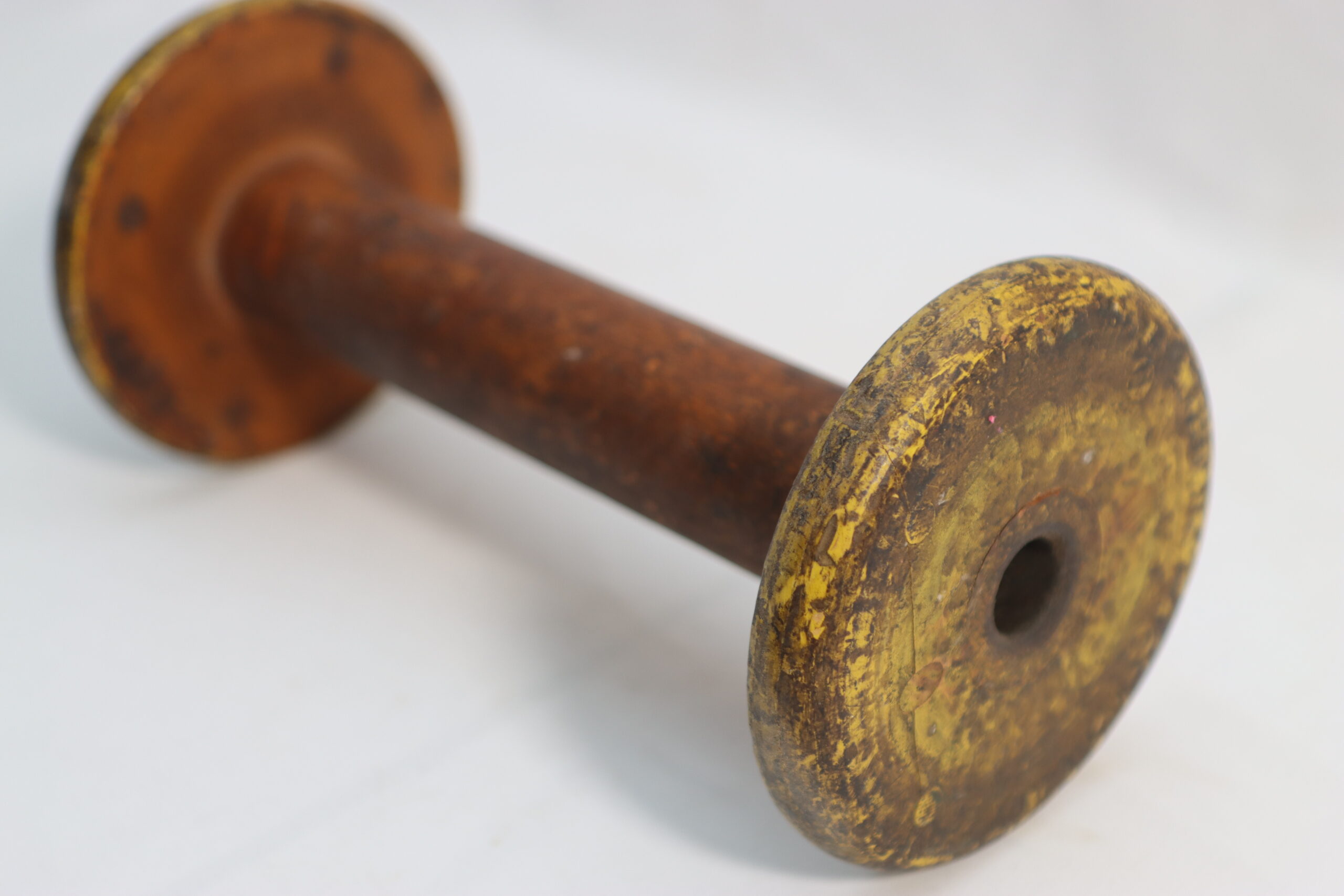ヴィンテージ・ウッドスプールは、緑色の塗装剥げと露出した木肌が高い経年変化を感じさせ、「伝統的な手仕事」や「古き良き工場の記憶」を想起させる名脇役となります。