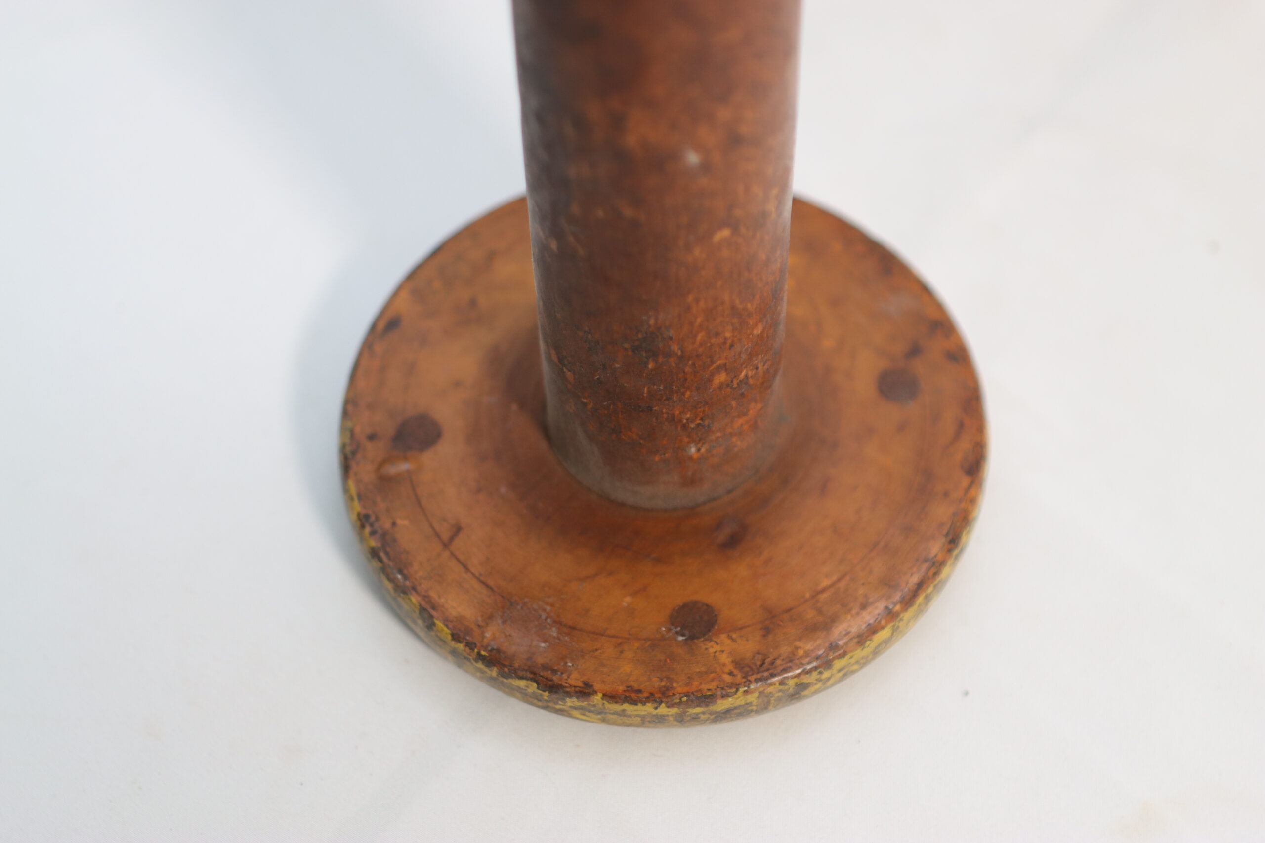 縦に長いフォルムのヴィンテージ・ウッドスプールは、平坦になりがちな物撮りの構図に「高さ」と「歴史的な重み」を加え、主役の商品を効果的に引き立てます。