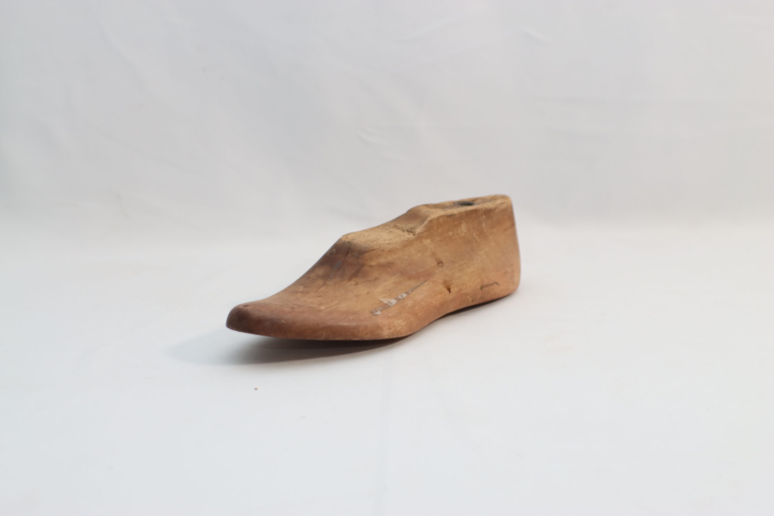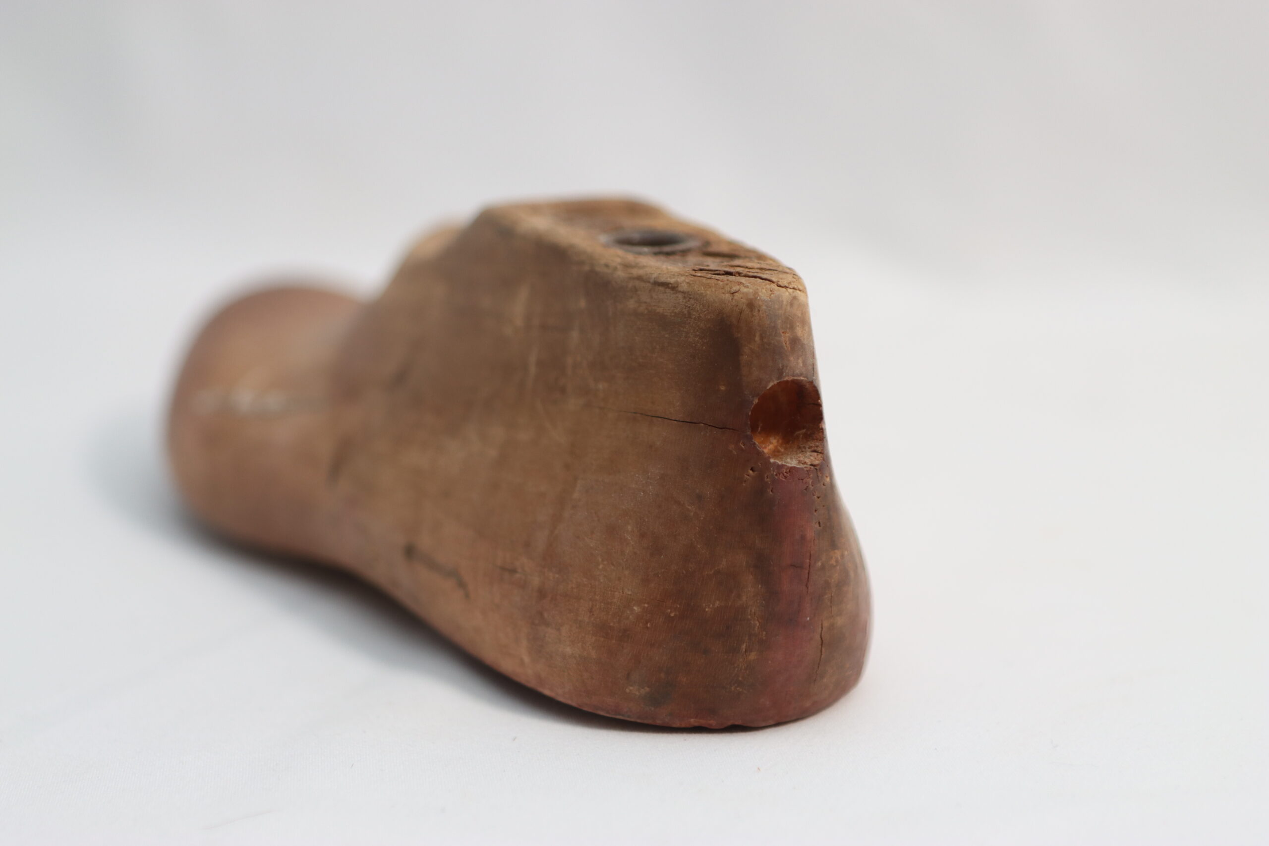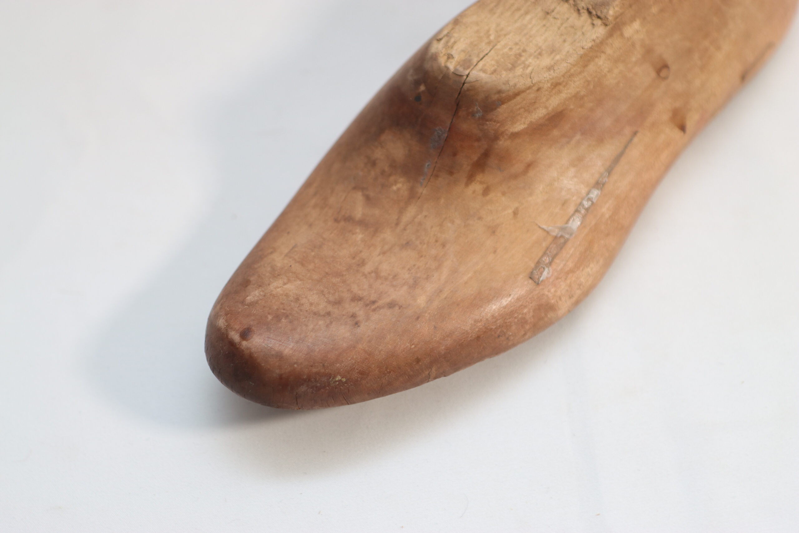 ヴィンテージ・ウッドシューラスト(片足)は、甲の曲線からかかとにかけての美しいフォルムが際立ち、木肌に刻まれた細かな傷やテープ跡が「本物の現場」の臨場感をセットに与えます。
