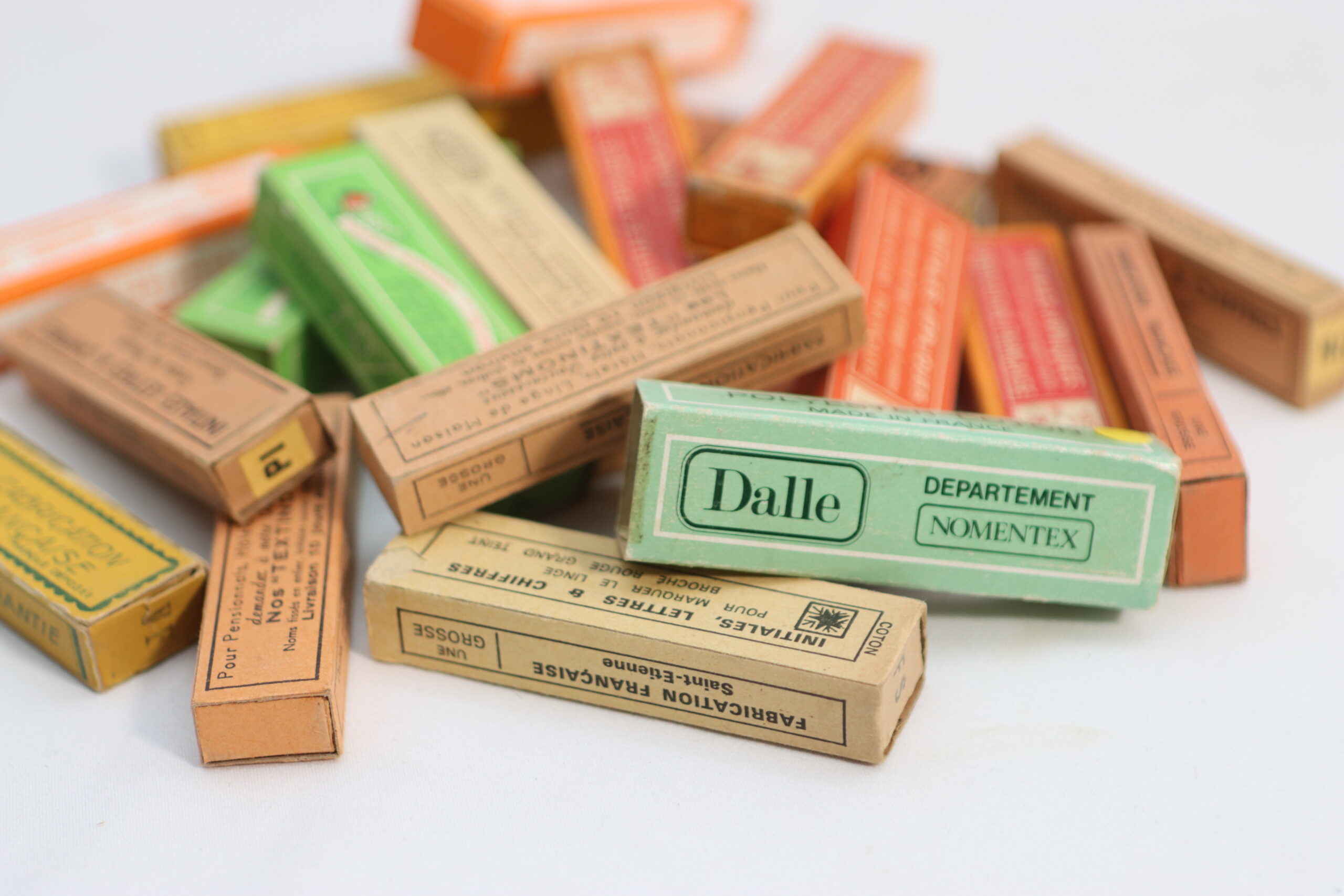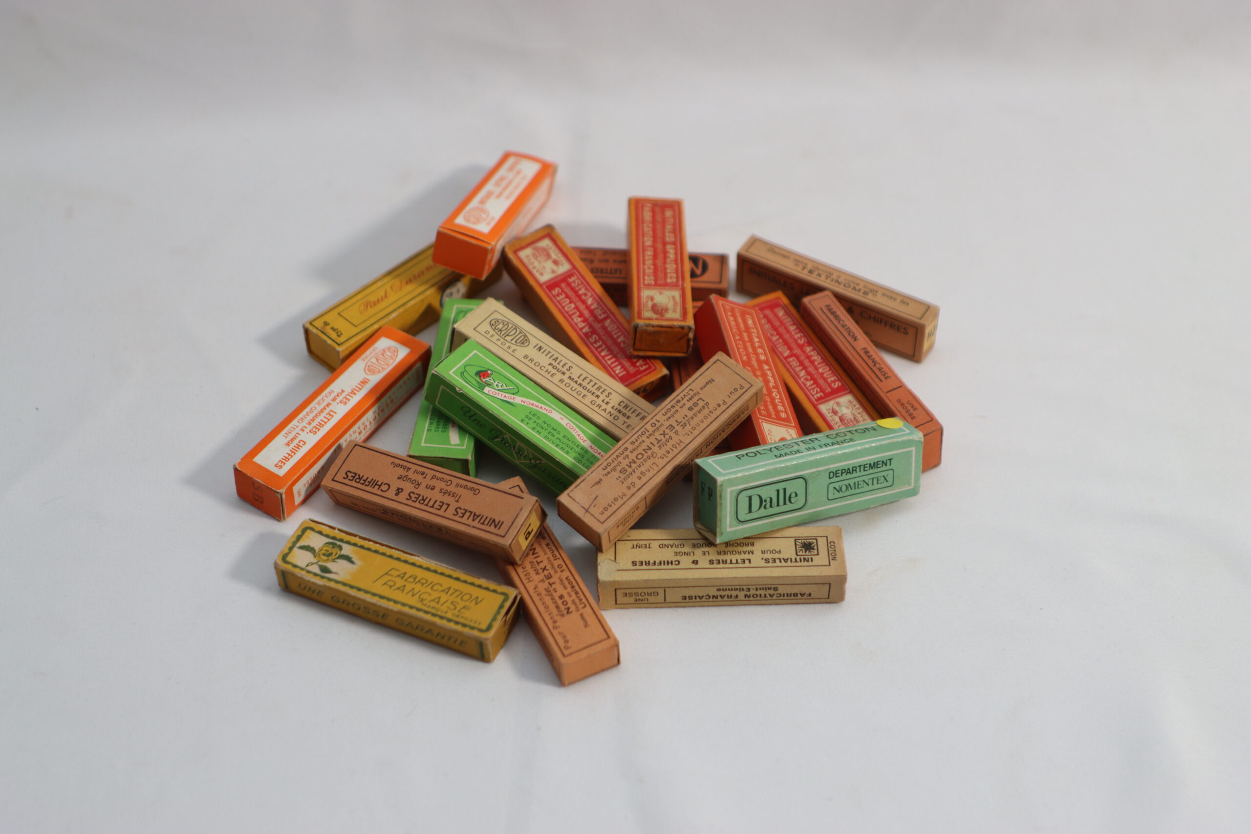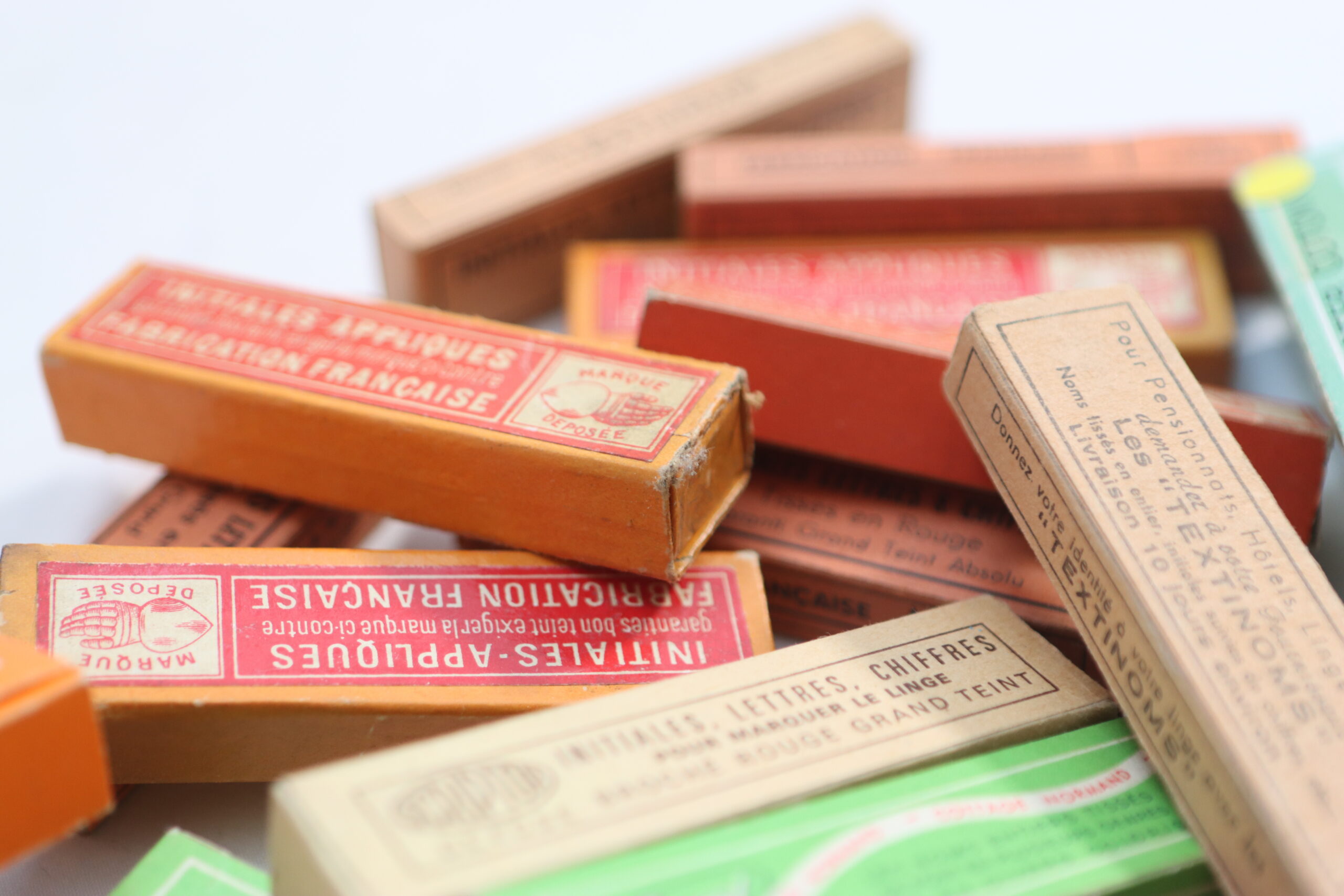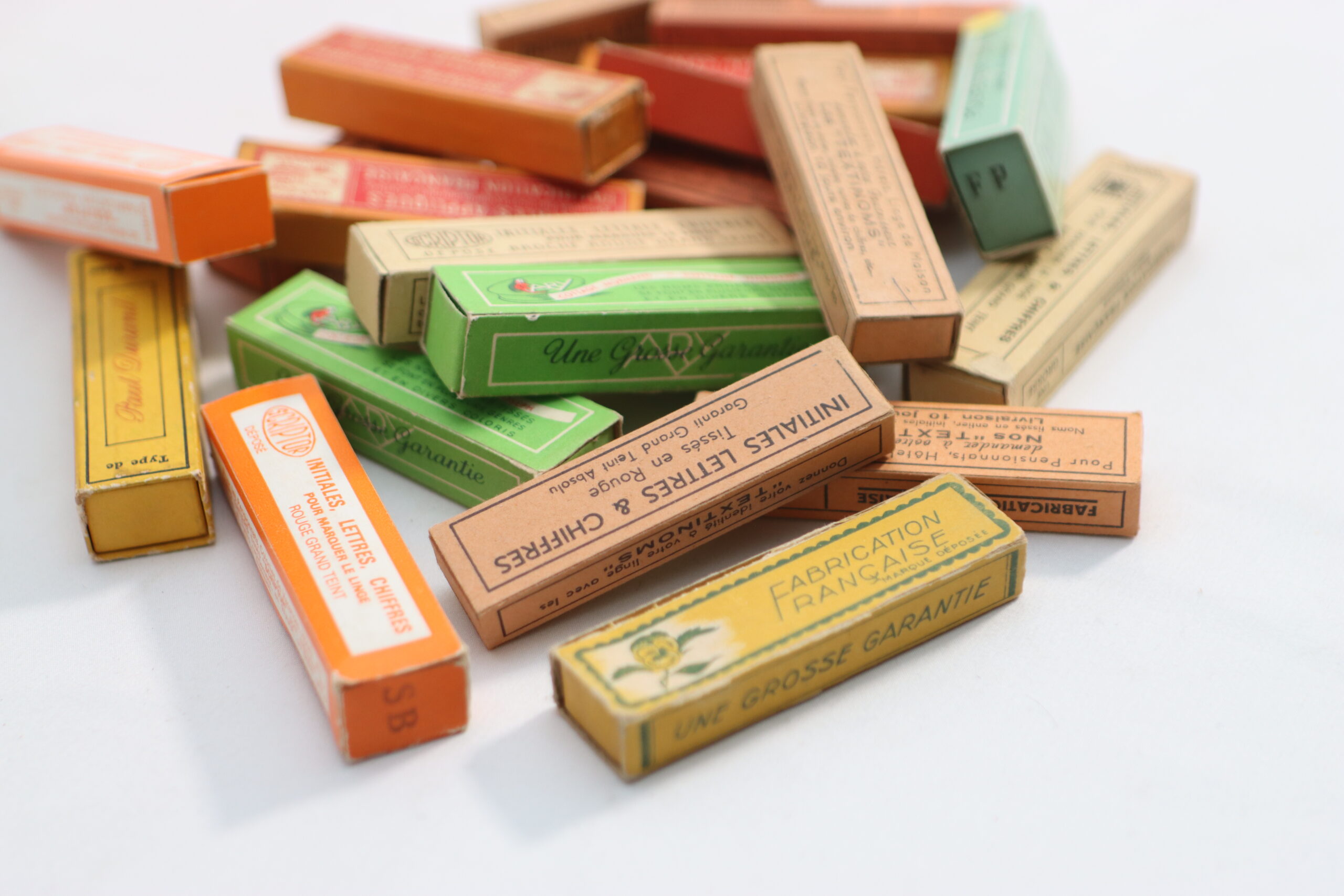 個々のパッケージに記された赤い「SB」や緑の「PT」といった多様なフォントと色彩のヴィンテージ・イニシャルテープは、手仕事のディテールを強調したい撮影において、画面にリズムとグラフィカルな楽しさを提供します。
