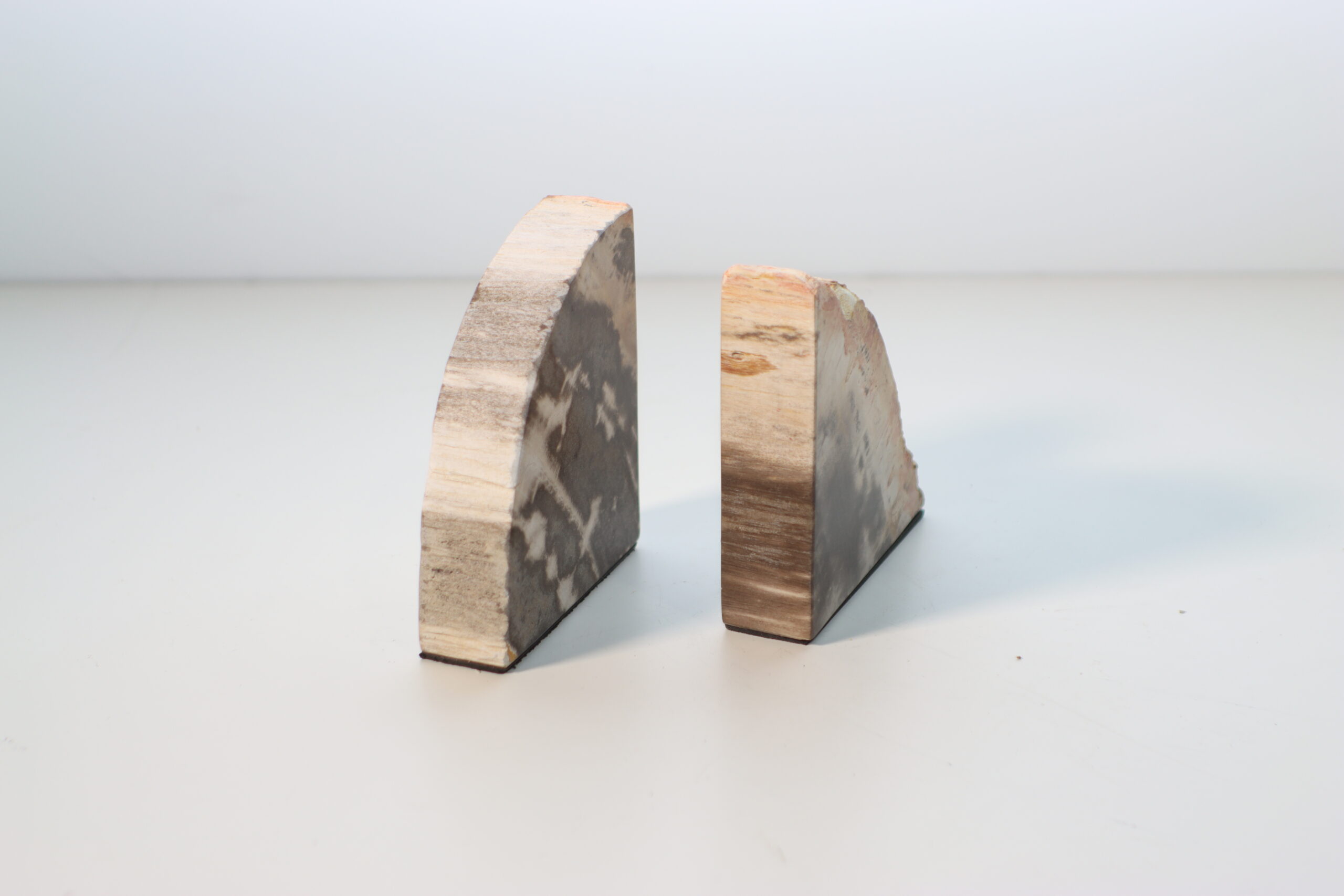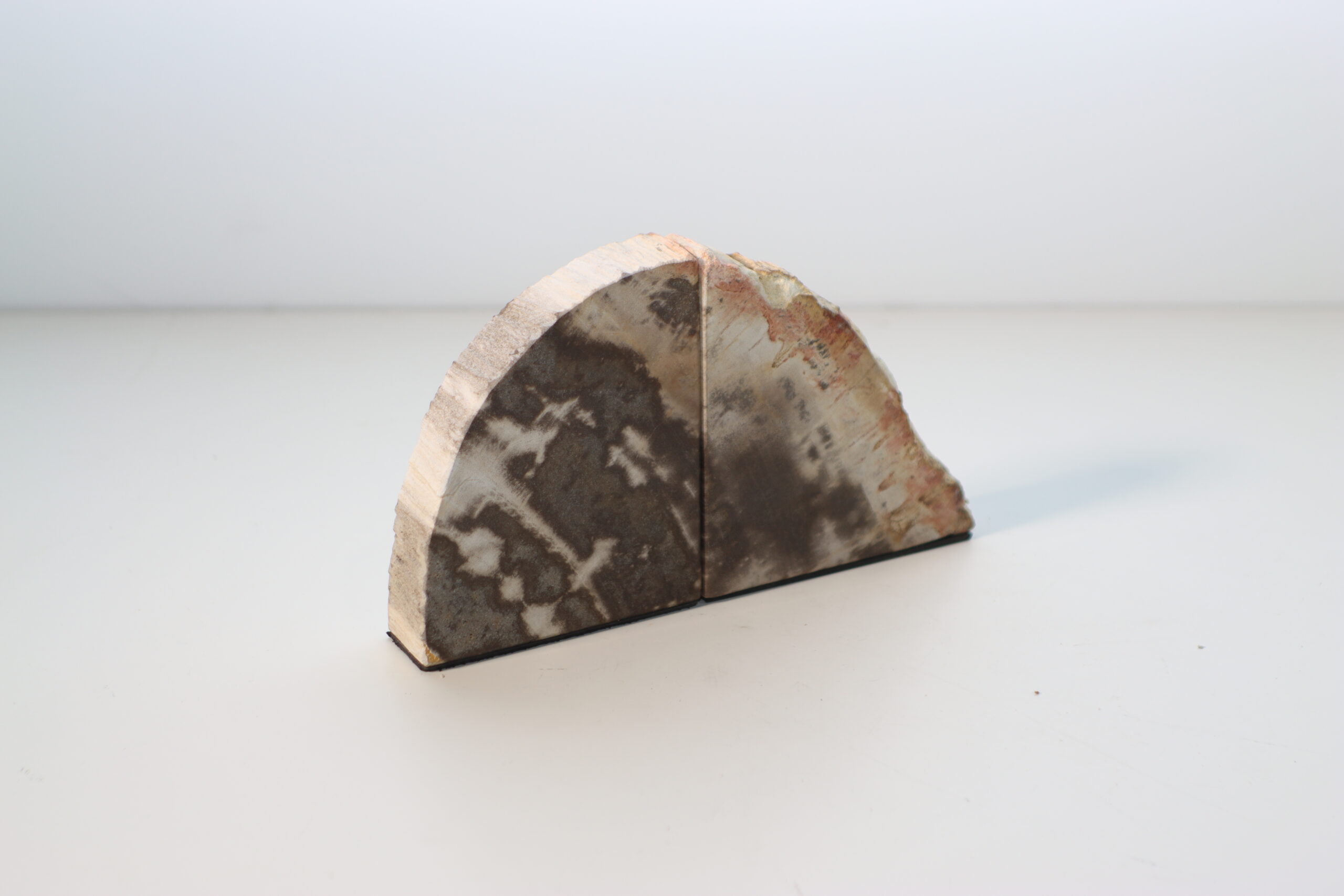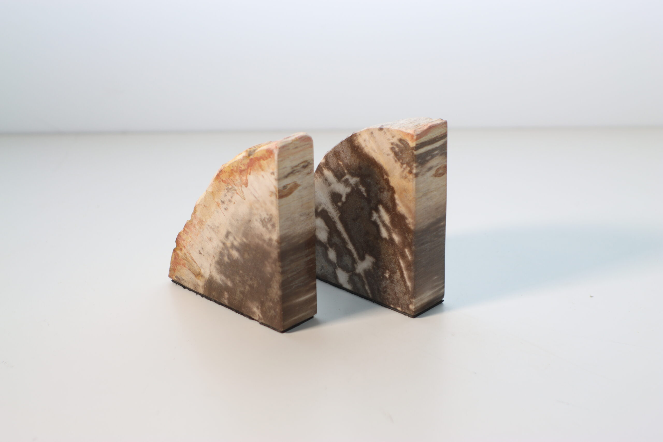 【注意事項】 本製品は、天然の樹木が化石化した非常に希少な素材を使用しているため、一点ごとに異なる複雑な紋様や色彩が最大の魅力です。石材としての重厚感があり、大切な書籍を確実にホールドしますが、接地面を保護するため、移動の際は引きずらずに持ち上げて配置することをお勧めいたします。天然素材ゆえの力強い風合いを、空間のアクセントとして末永くお楽しみください。