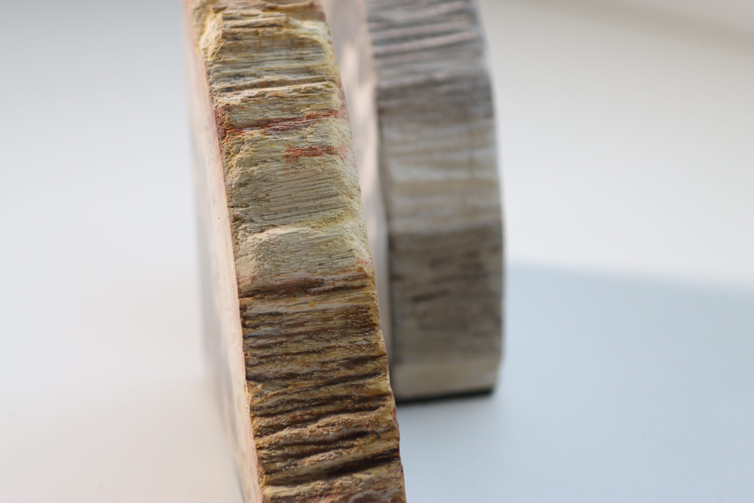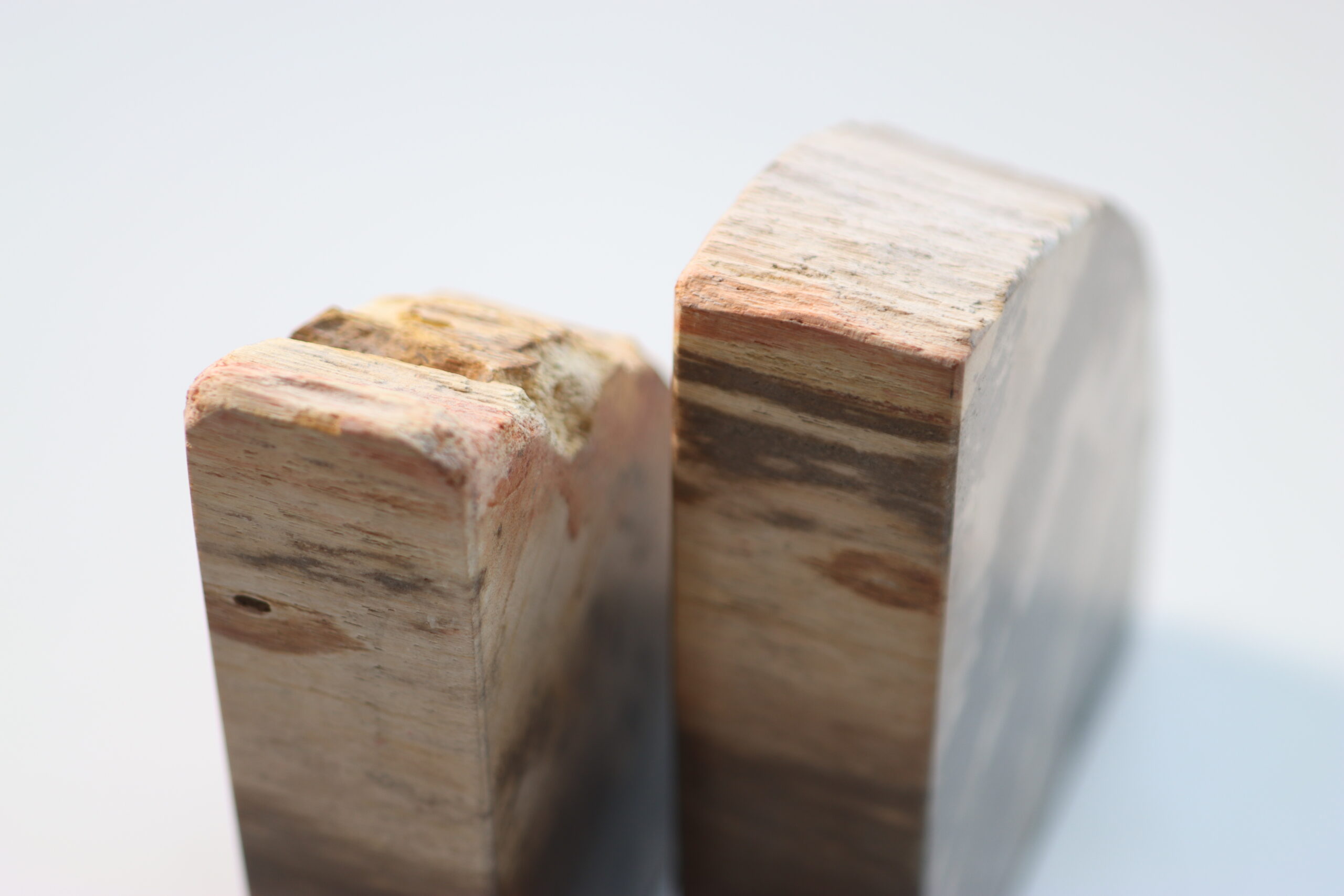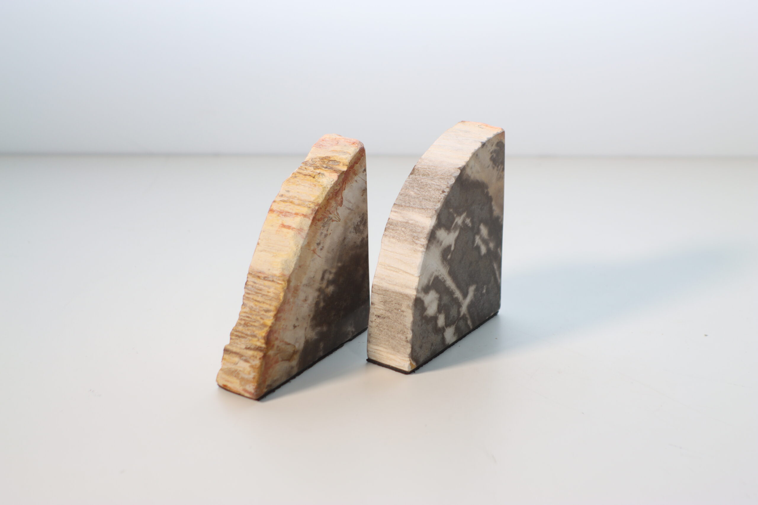 【注意事項】 本製品は、天然の樹木が化石化した非常に希少な素材を使用しているため、一点ごとに異なる複雑な紋様や色彩が最大の魅力です。石材としての重厚感があり、大切な書籍を確実にホールドしますが、接地面を保護するため、移動の際は引きずらずに持ち上げて配置することをお勧めいたします。天然素材ゆえの力強い風合いを、空間のアクセントとして末永くお楽しみください。