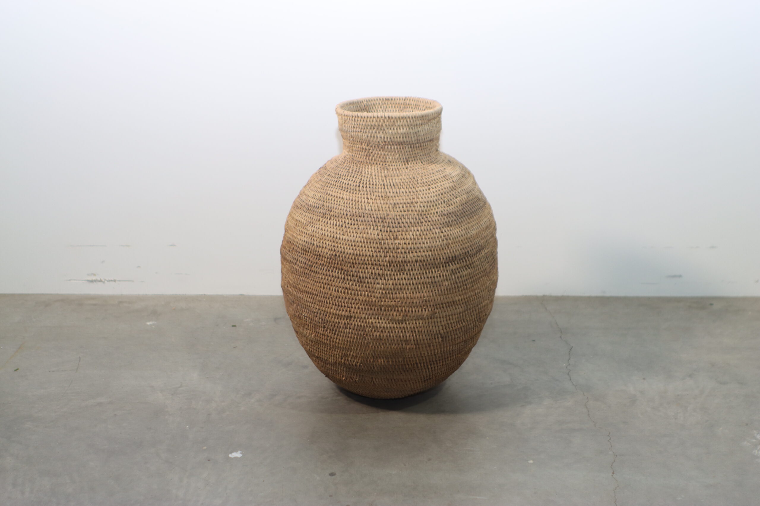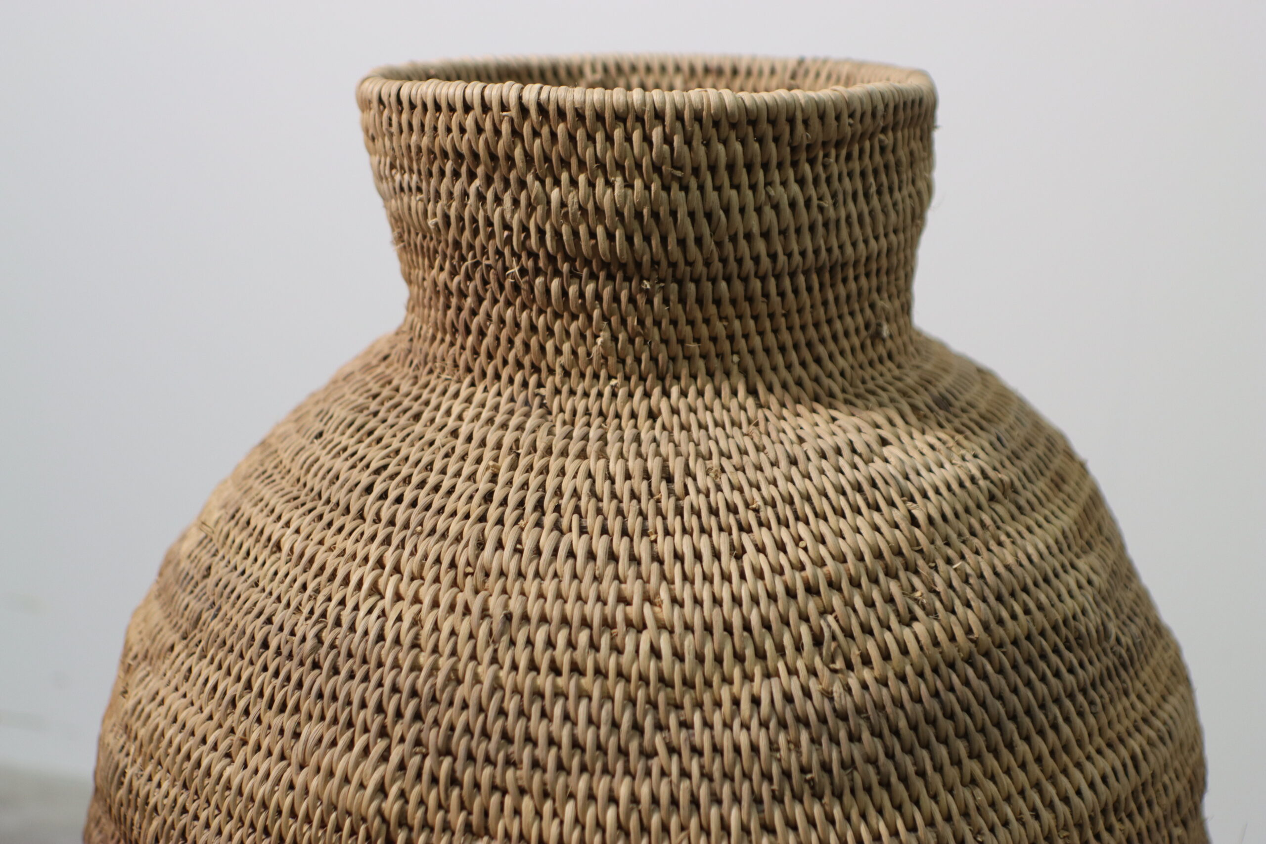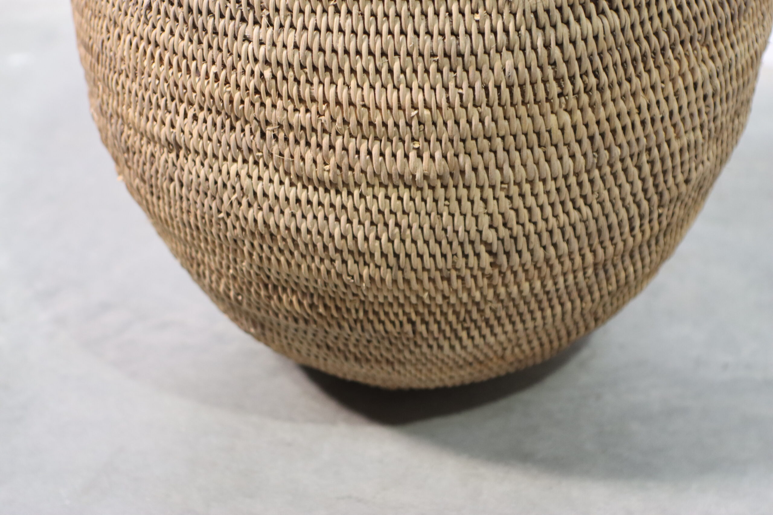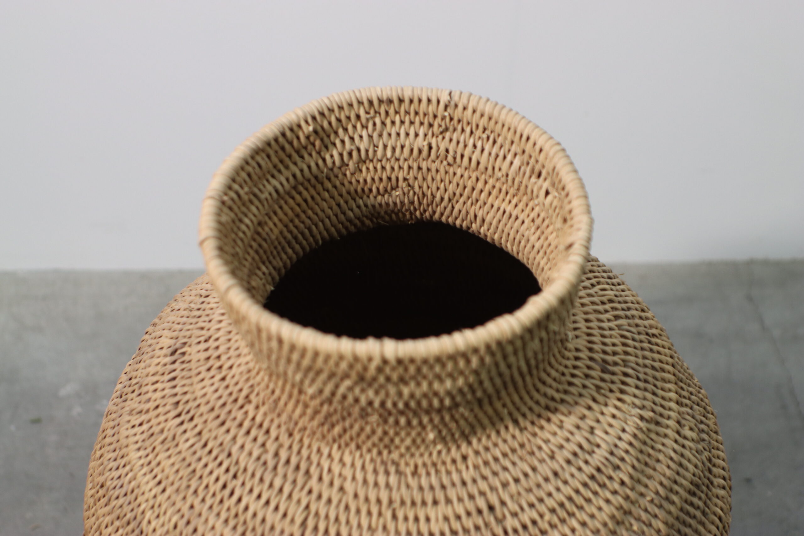 熟練の職人技で編み上げられた繊細なテクスチャーと、温かみのあるラタン素材が、空間にボタニカルでオーガニックな空気を運ぶ大型ベースです。