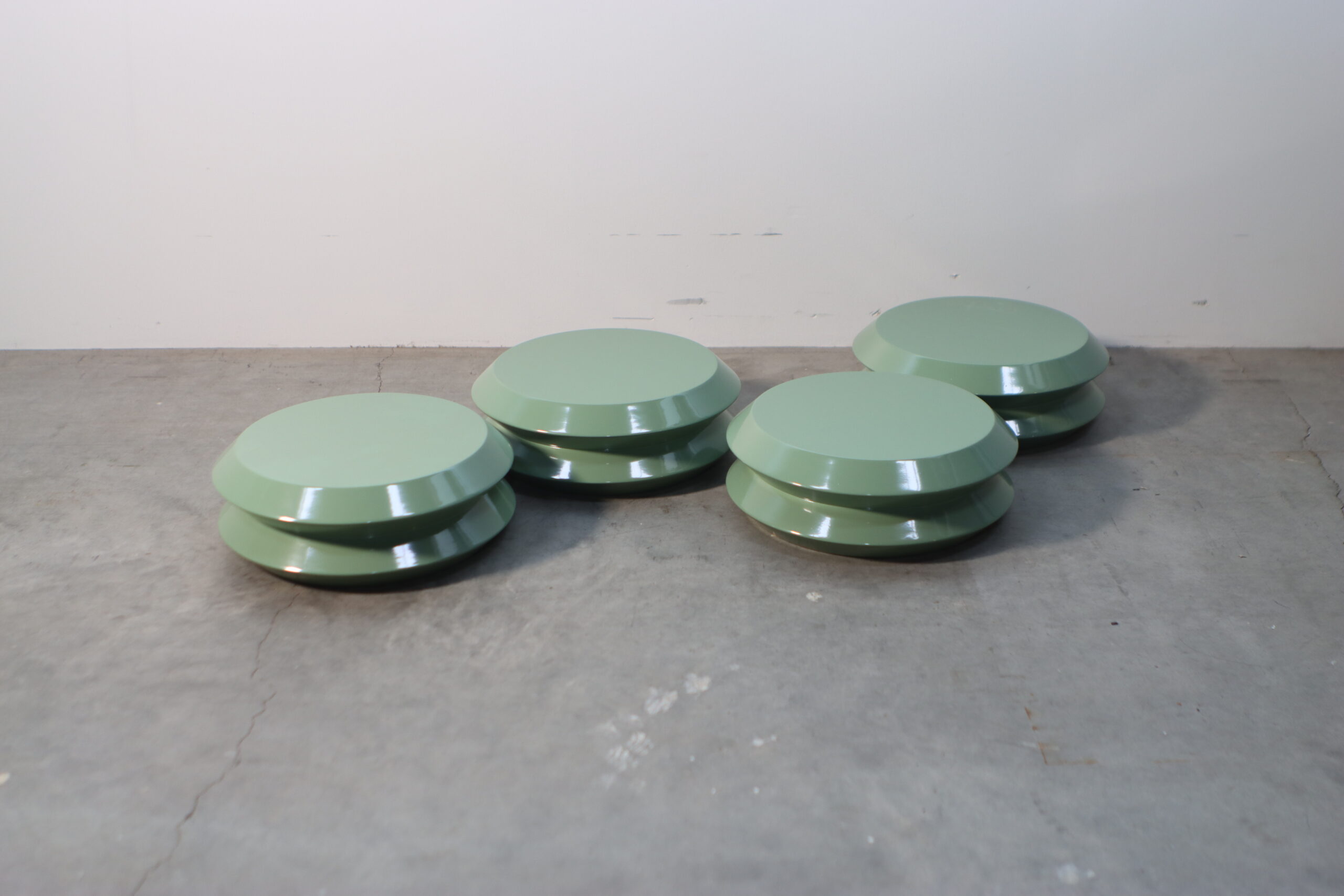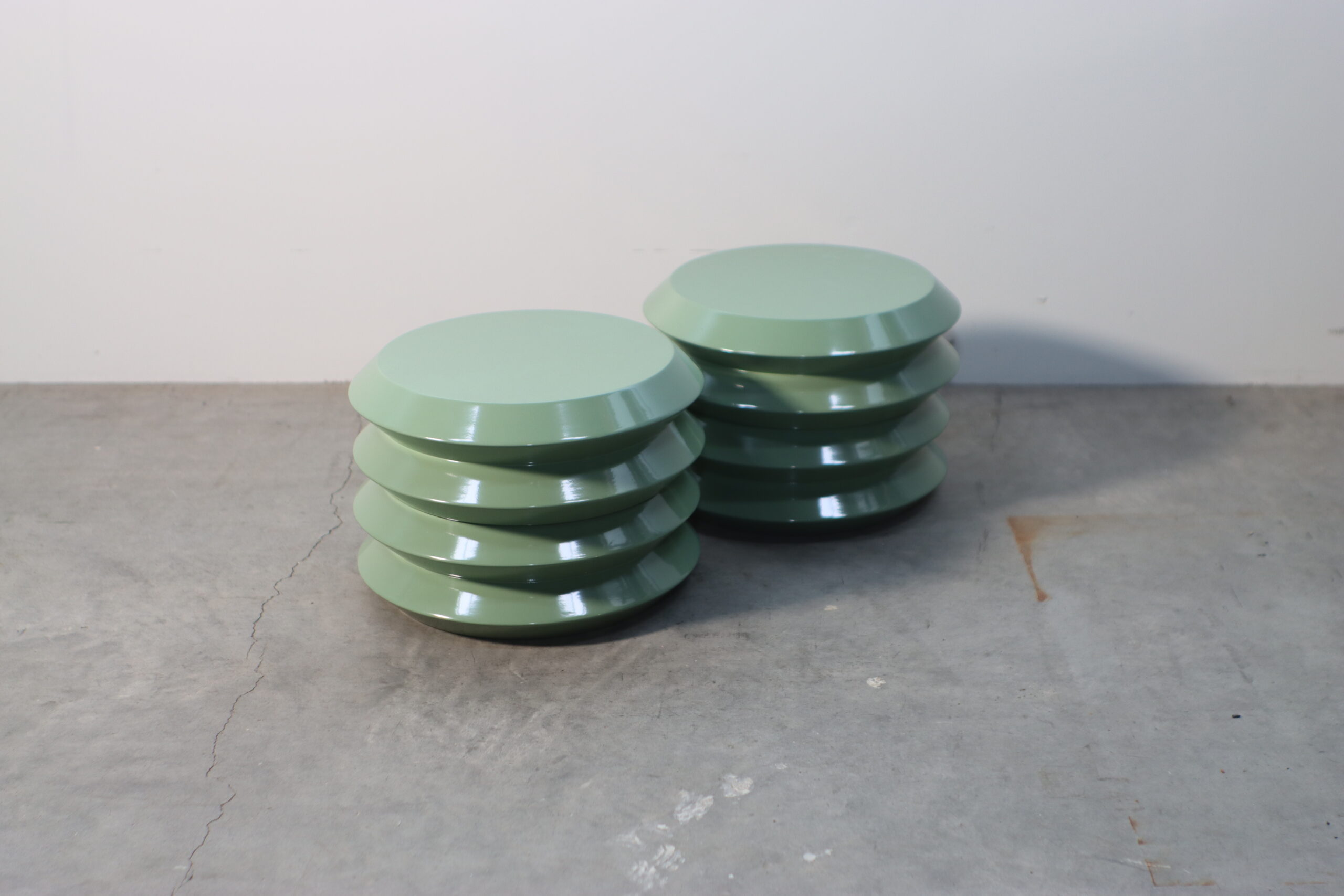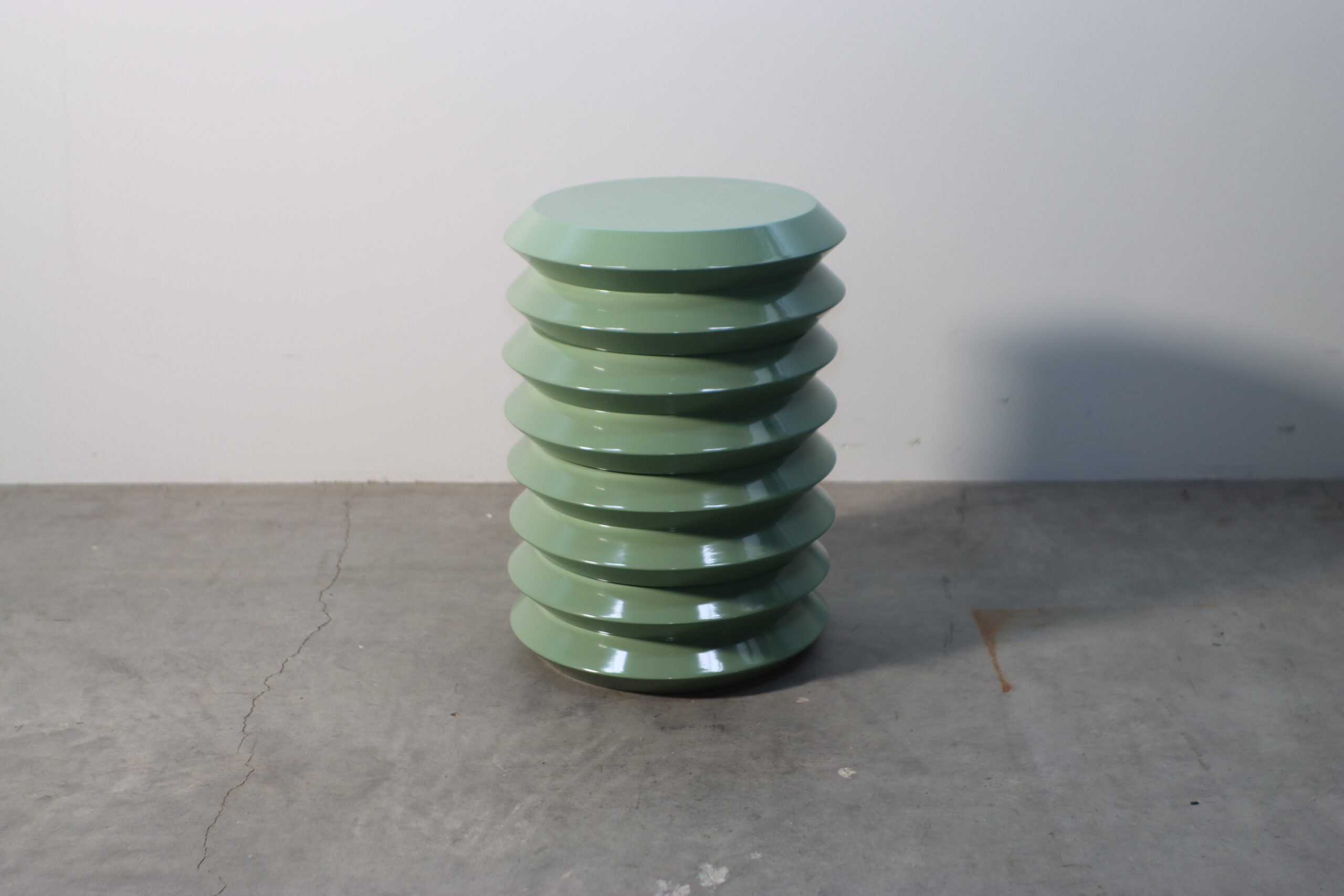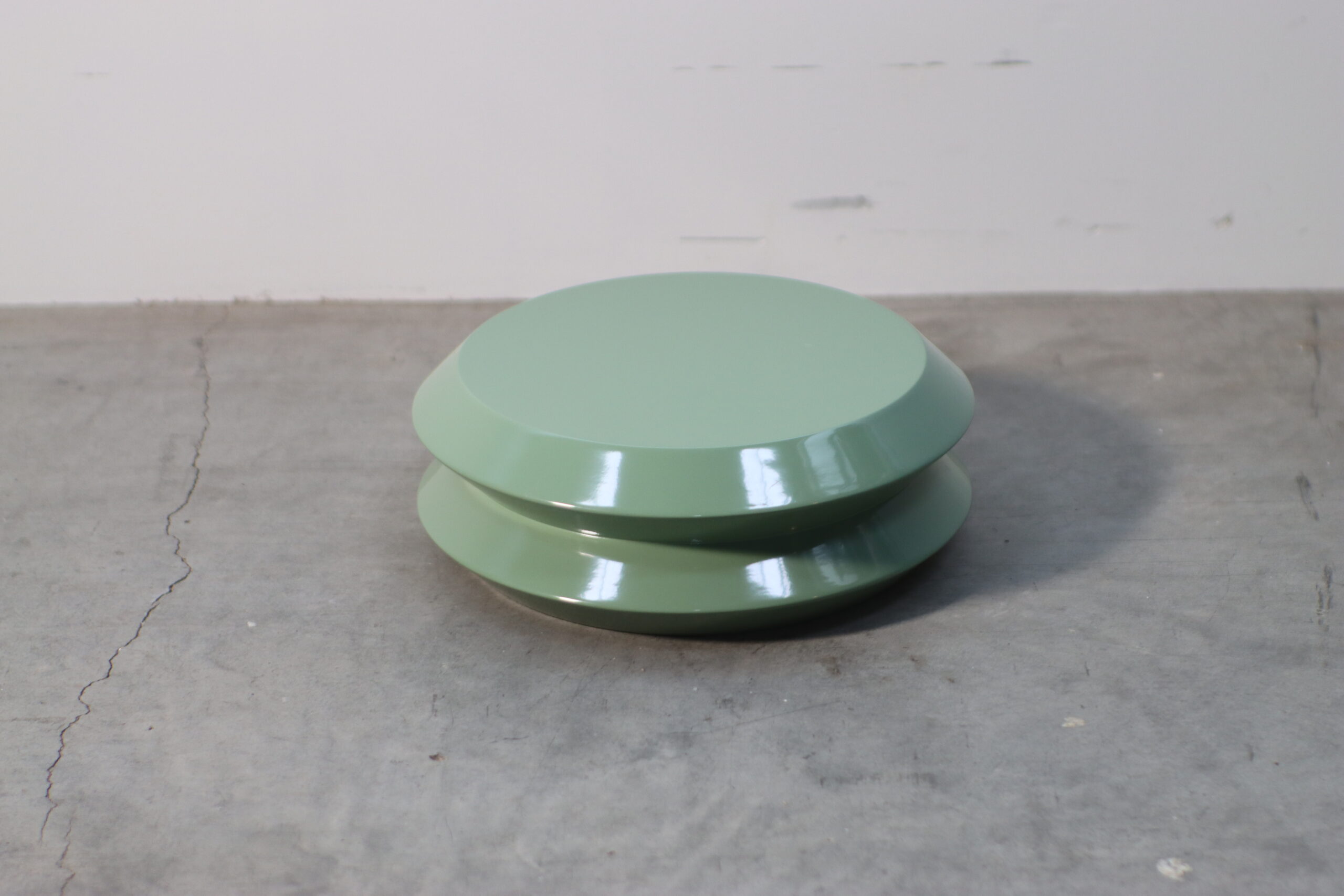上下の円盤を繋いだような幾何学的なシルエットと、滑らかなセージグリーンの光沢が、空間に知的なリズムと圧倒的な存在感をもたらします。