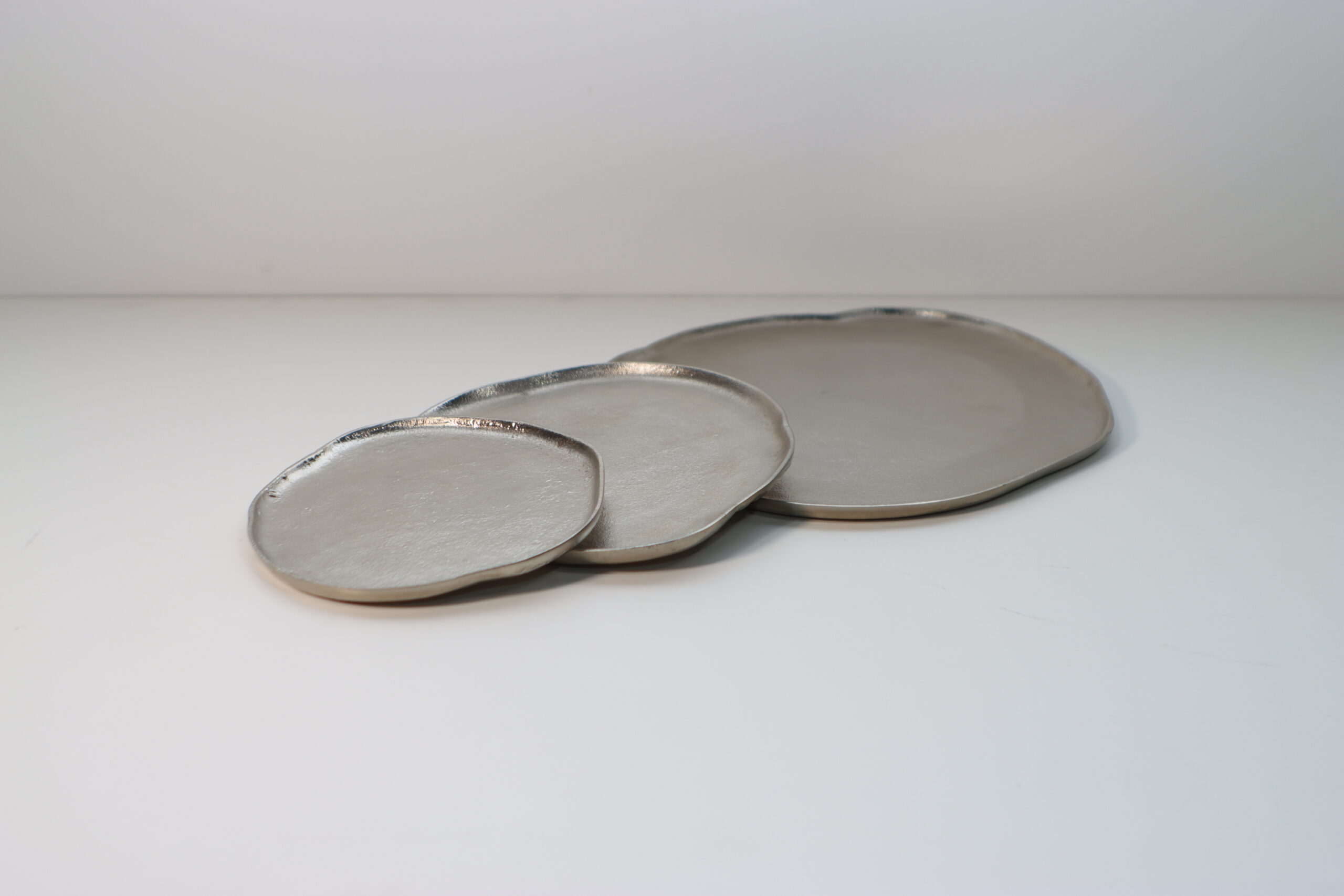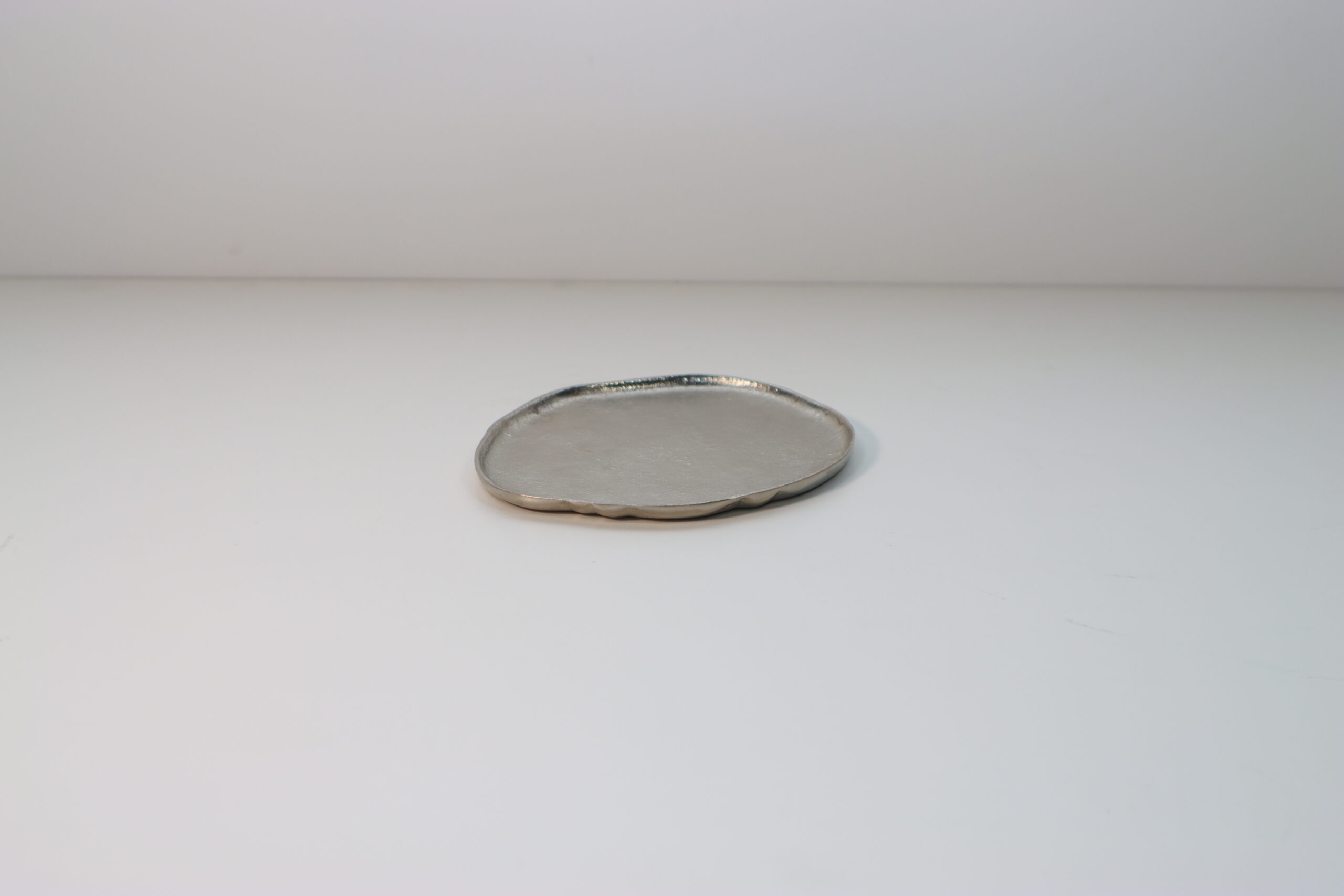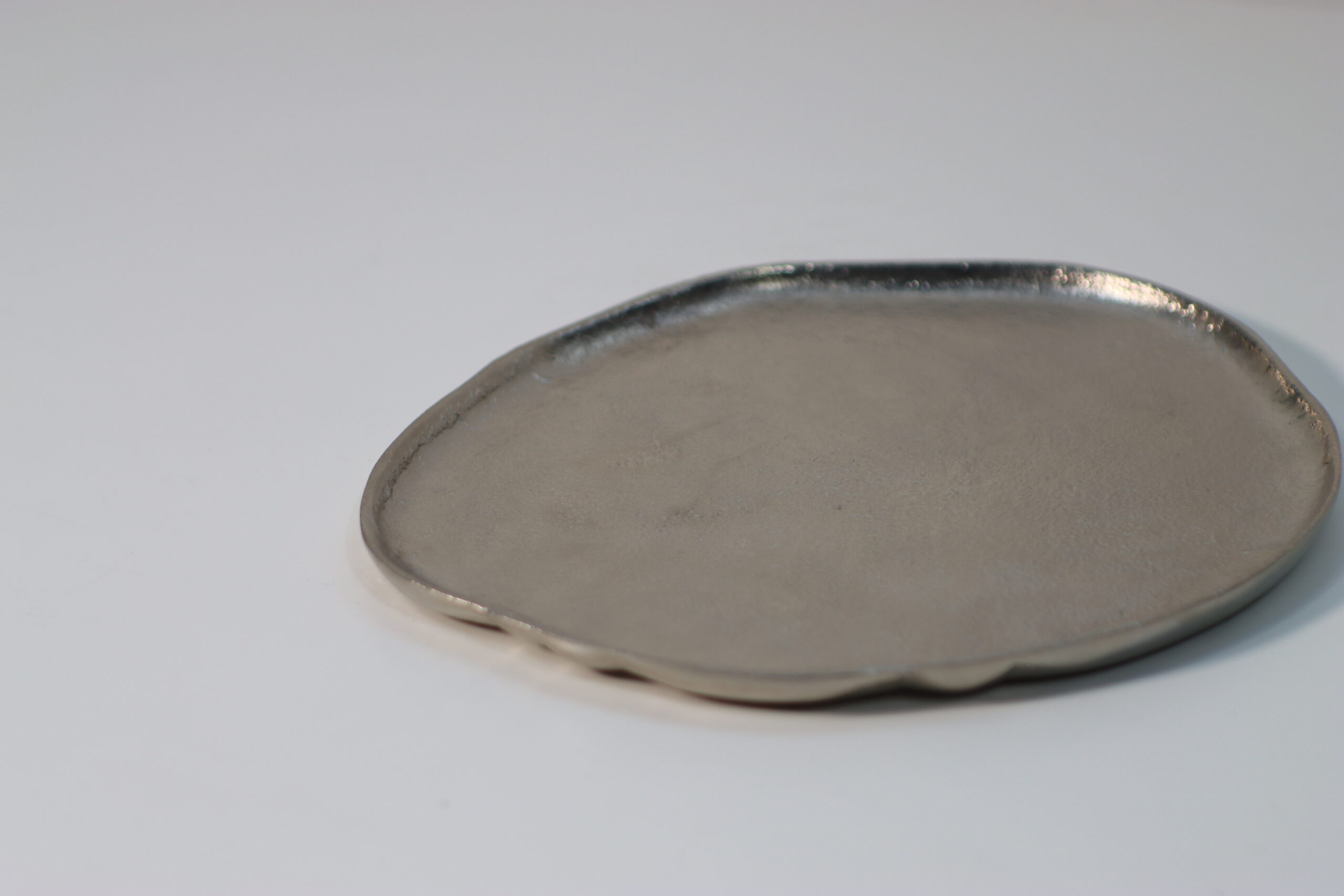不規則な曲線と、金属の鋳肌によるマットな質感が、置いたものを美しく引き立てるアートピースのようなトレイです。