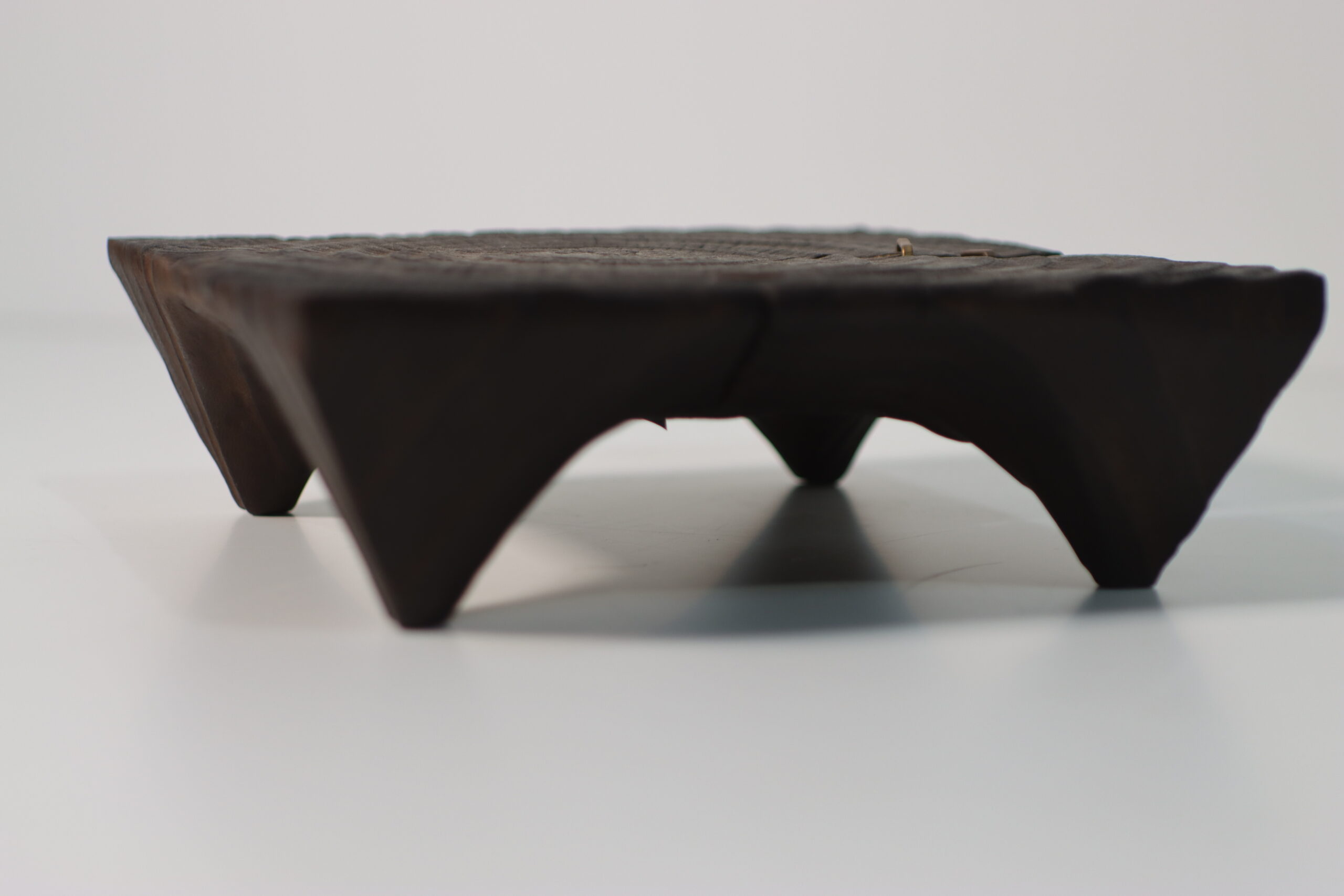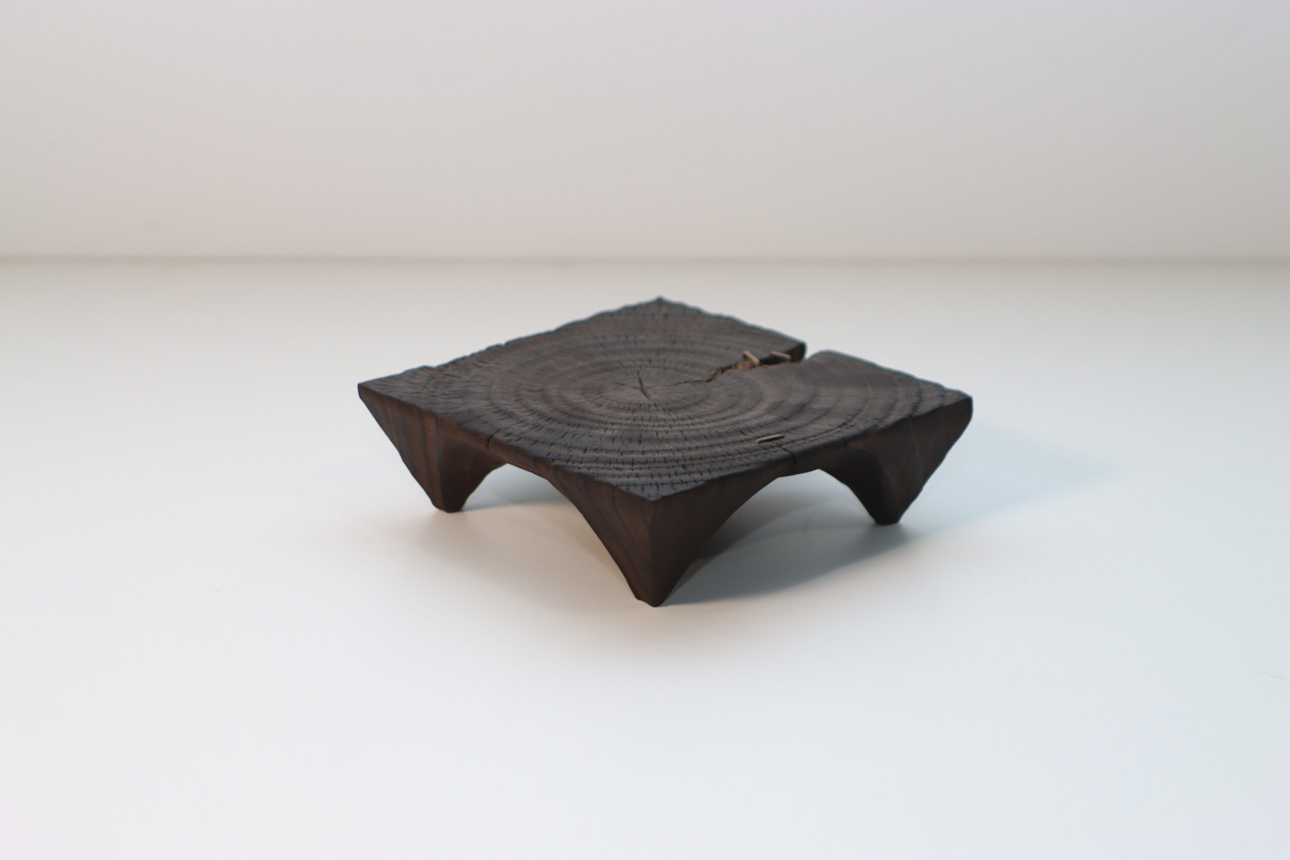 表面には焼き加工が施されており、強い摩擦や衝撃によって炭化した層が剥がれたり、周囲を汚したりする可能性があるため、取り扱いには細心の注意が必要です。また、木材の乾燥による自然な割れや歪みもデザインの一部としてお楽しみください。