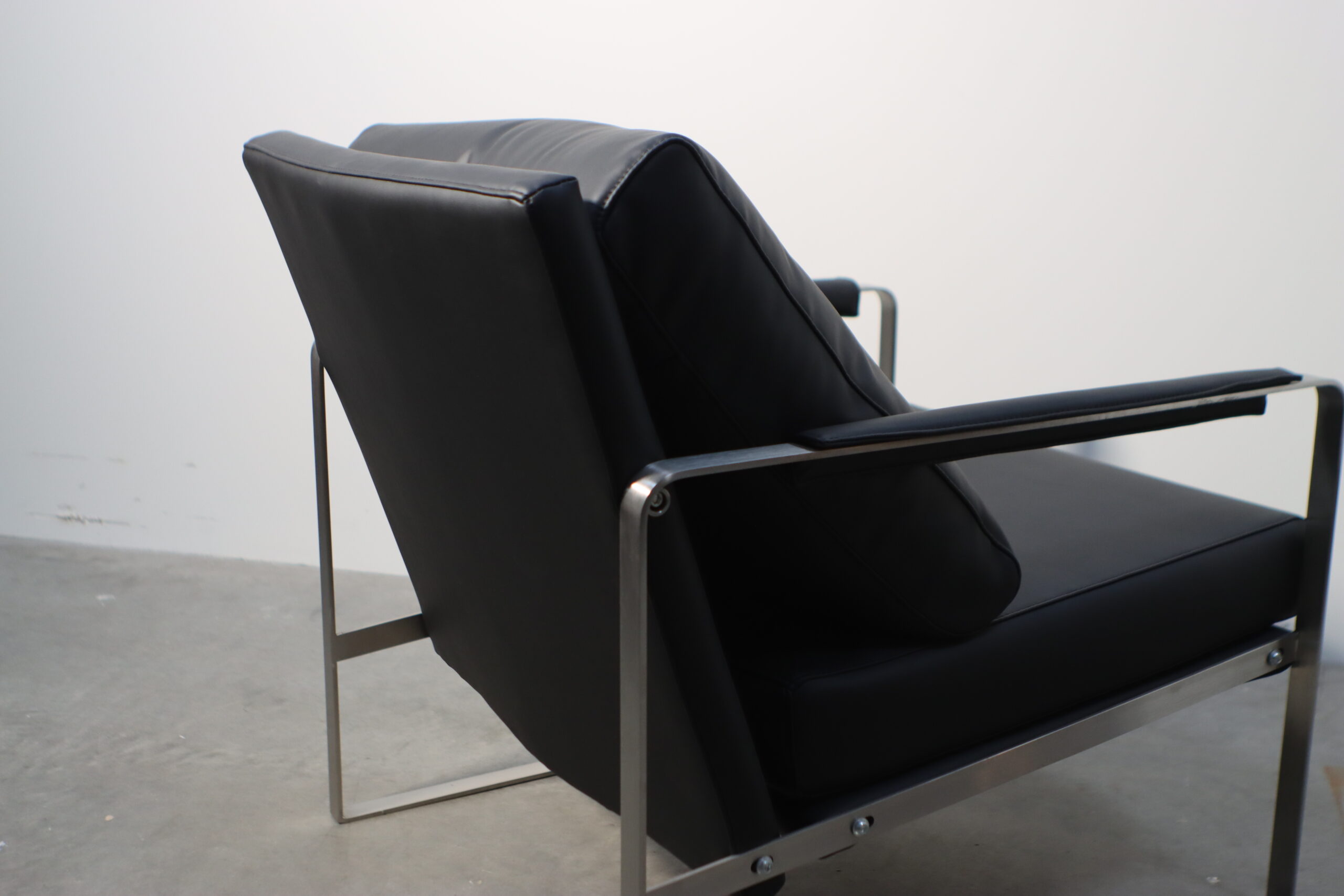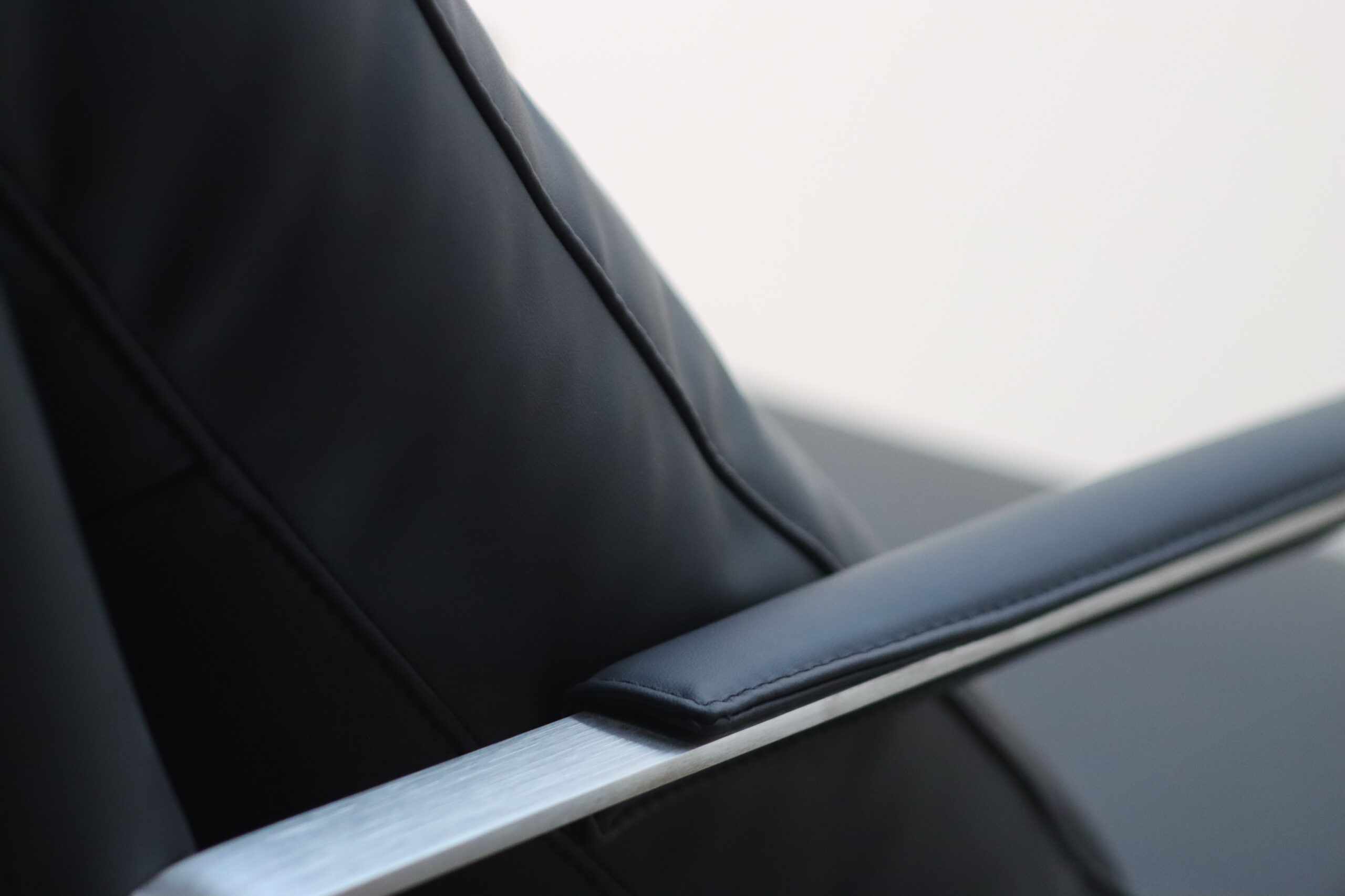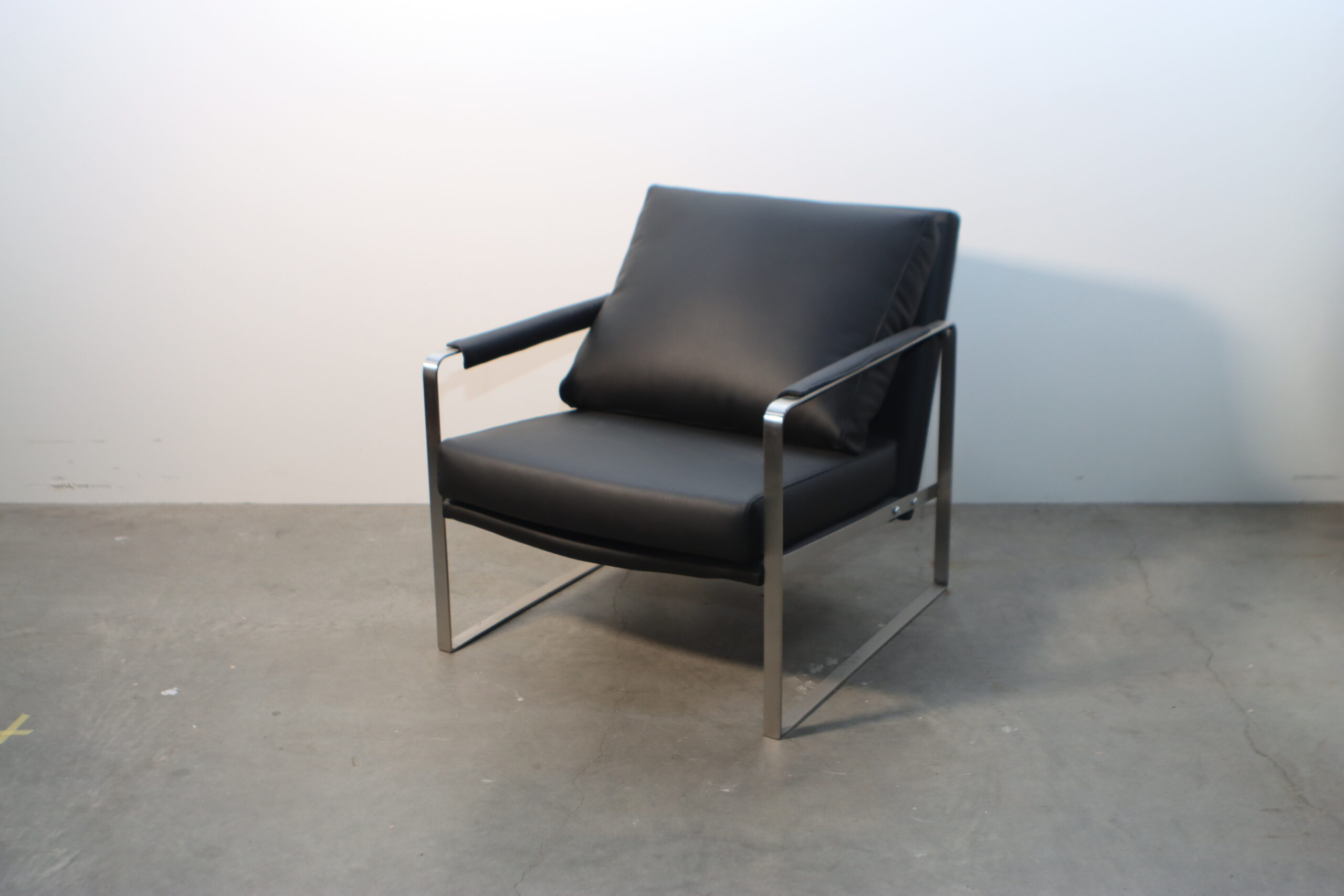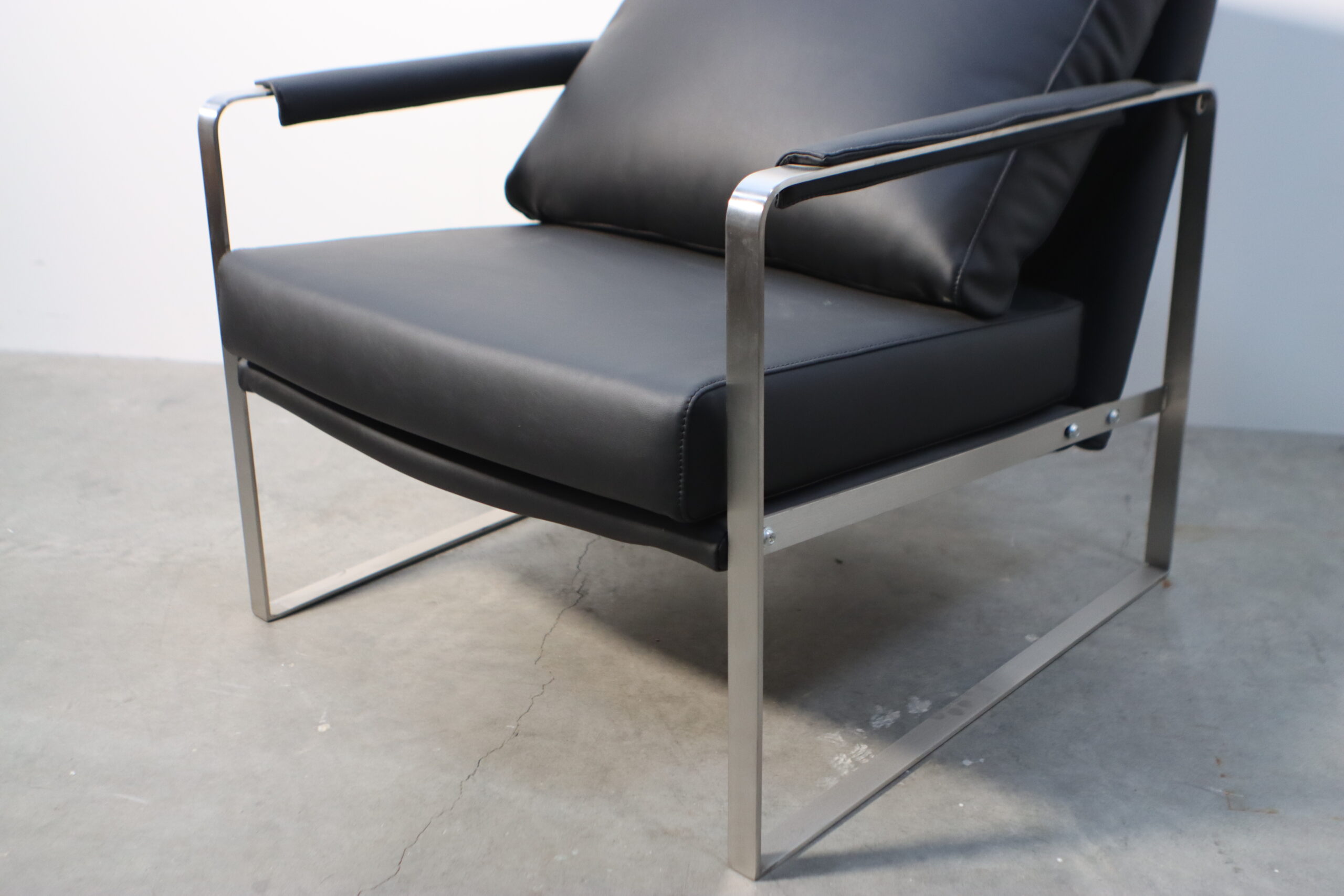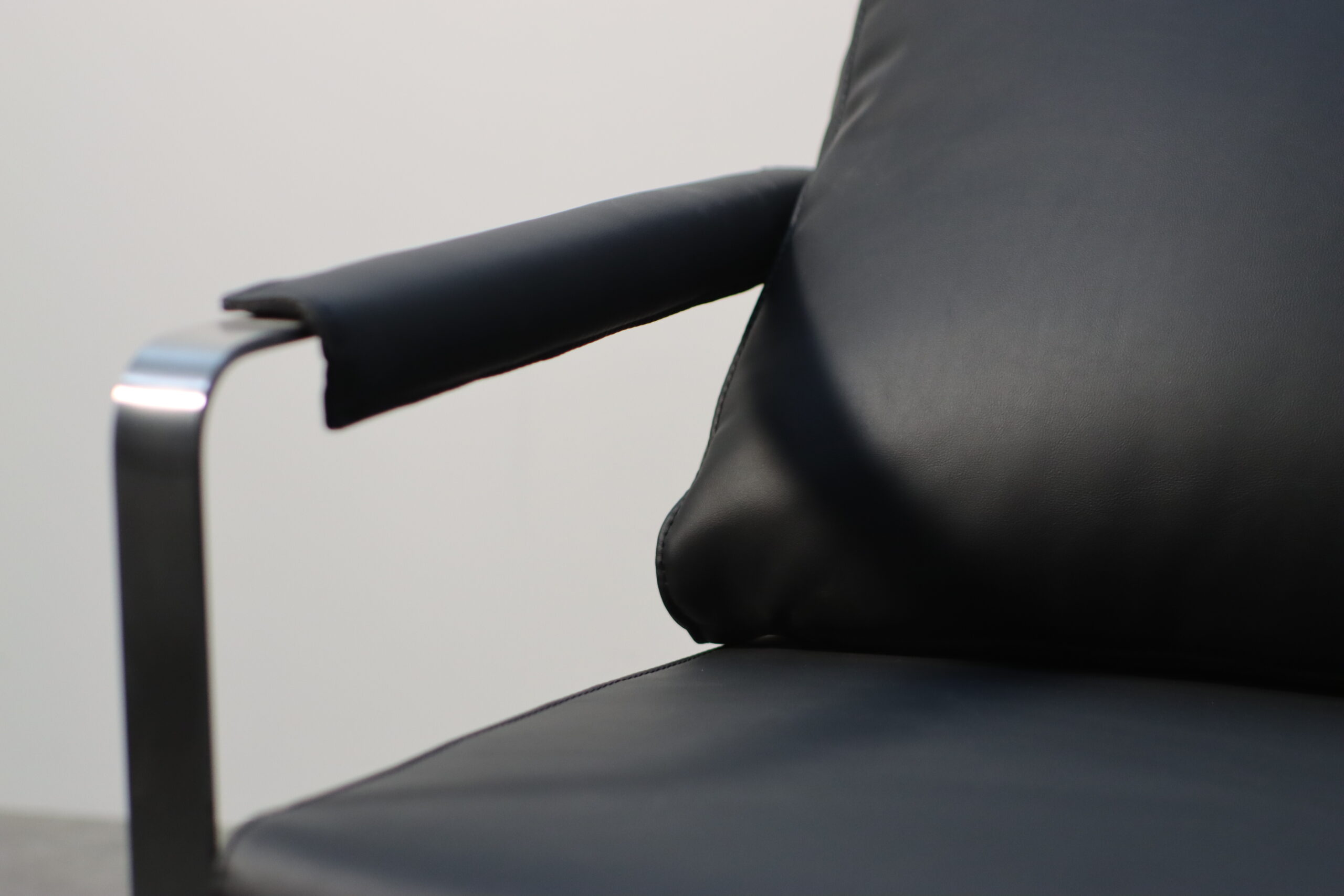モダン・メタルフレーム・アームチェアは、無機質でシャープなステンレスフレームと、重厚なブラックレザーのクッションが融合し、空間に「揺るぎない知性」と「現代的なエグゼクティブ感」を付与します。