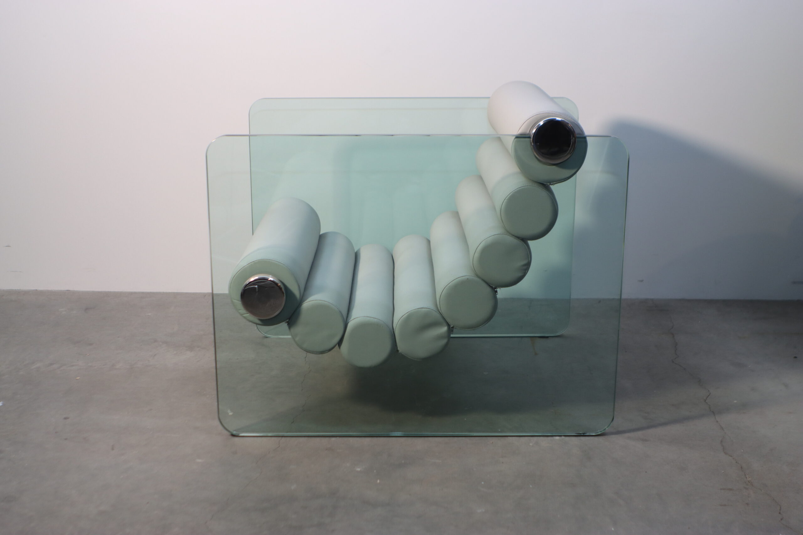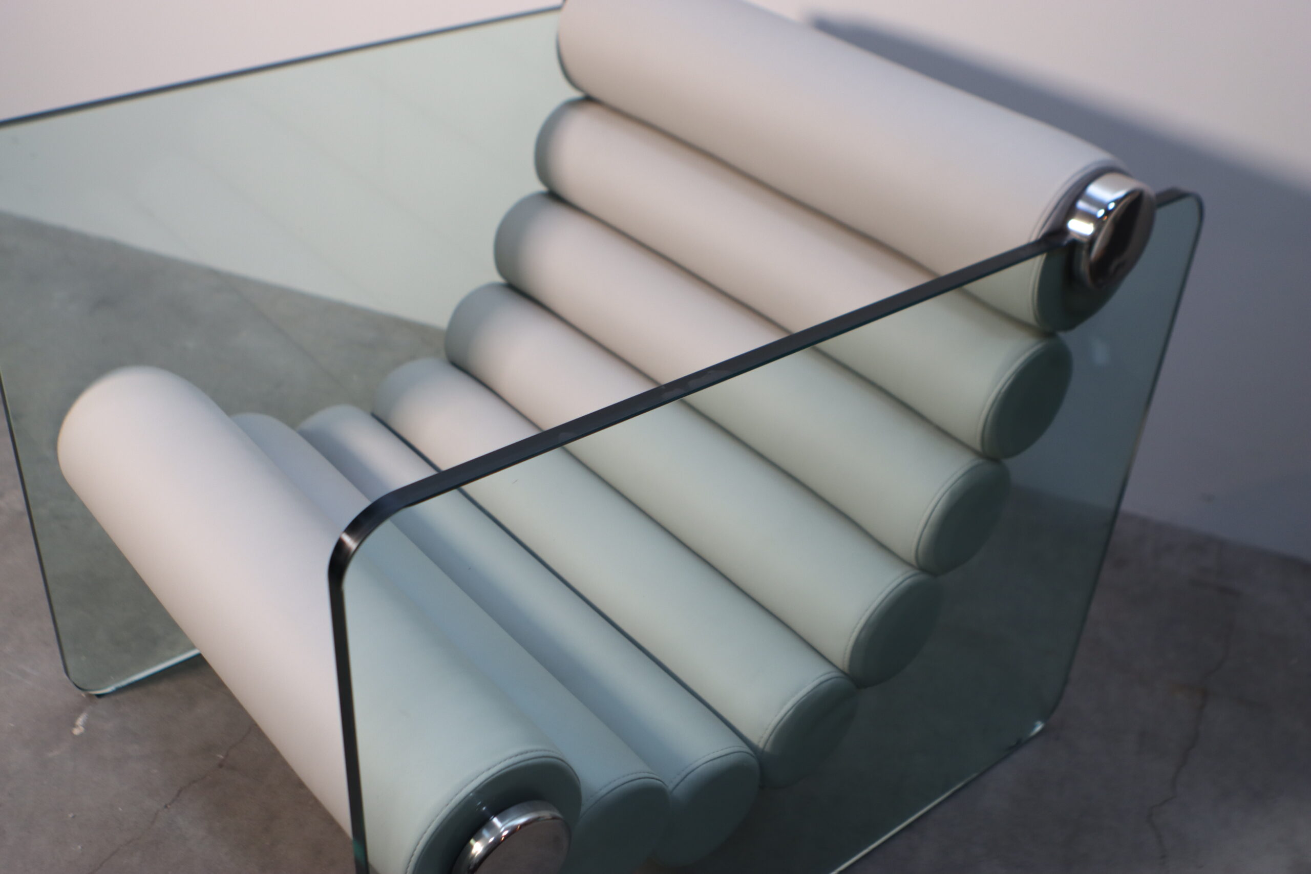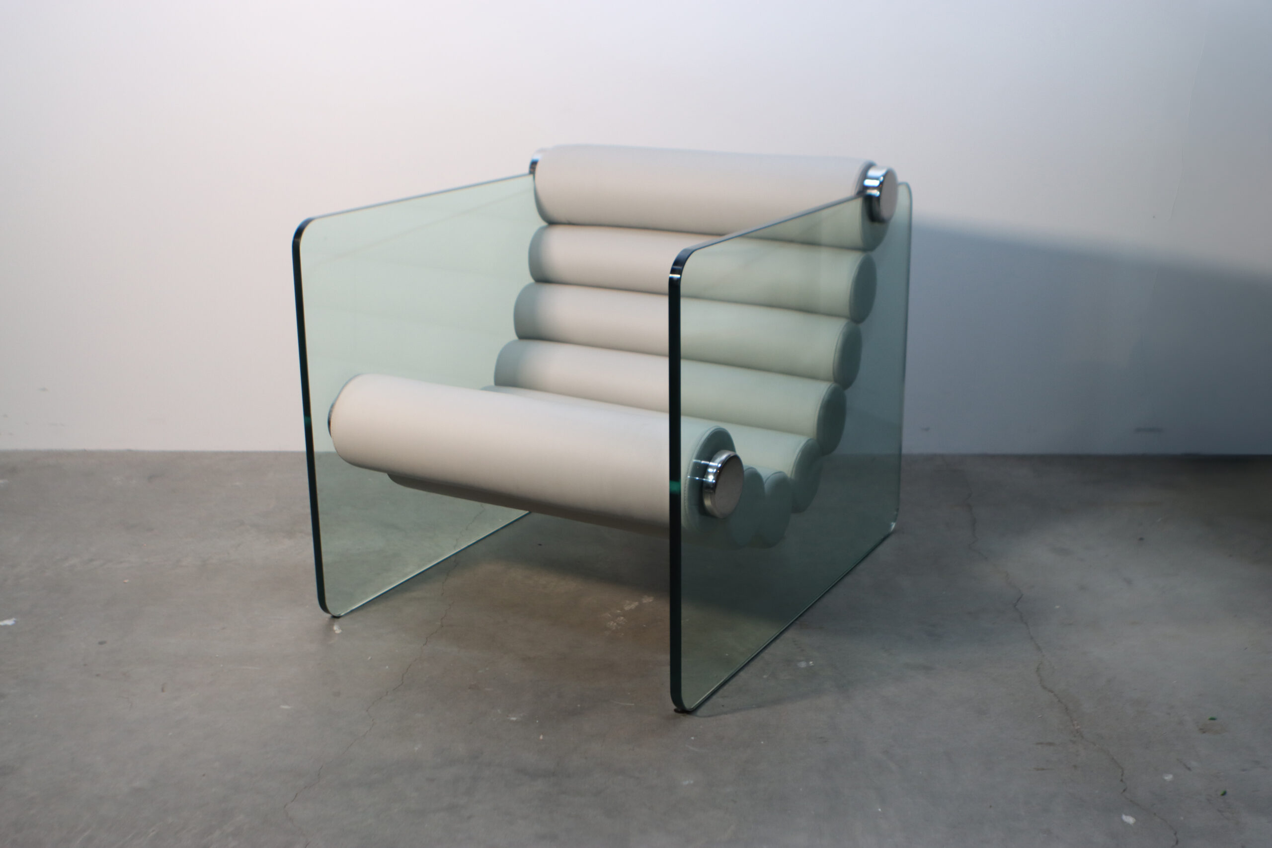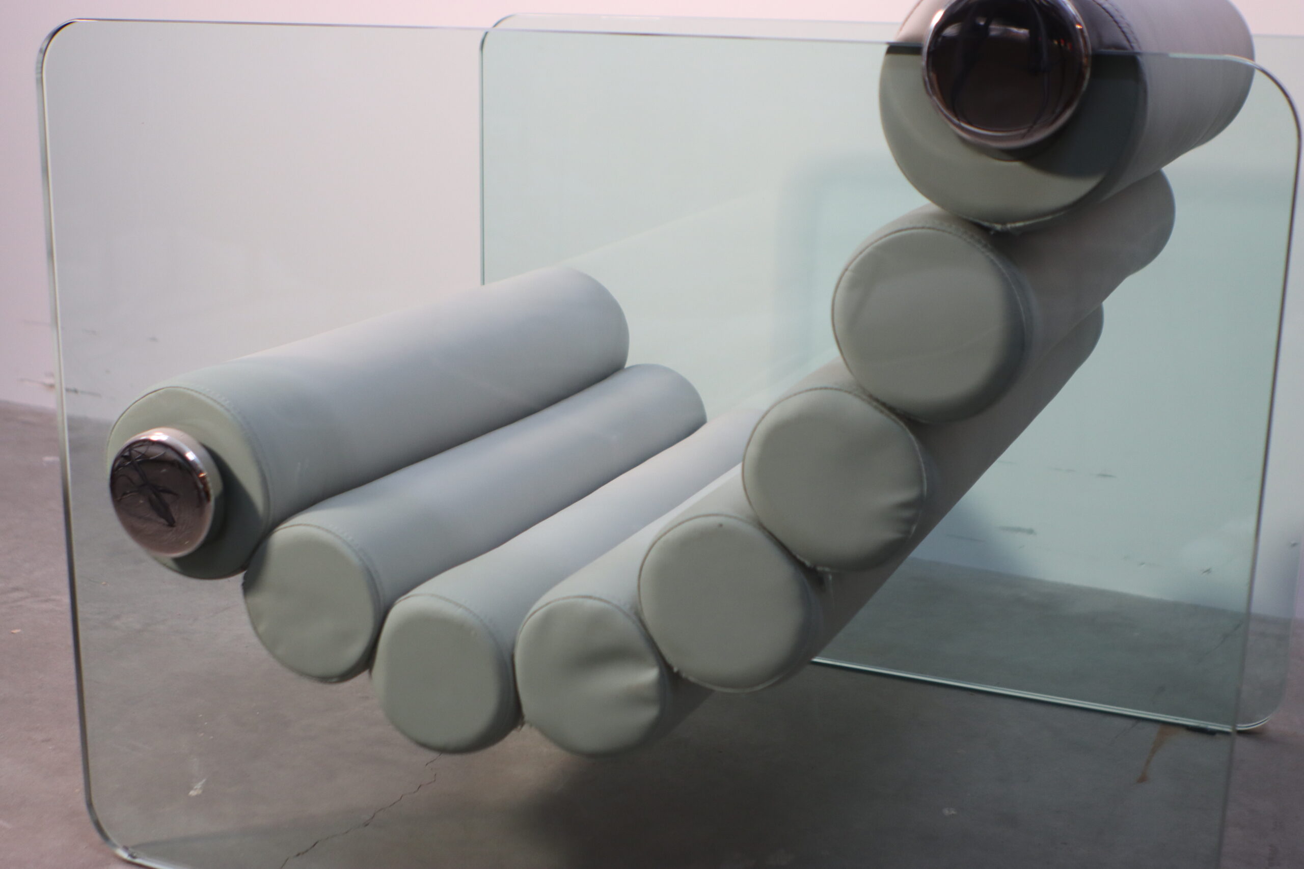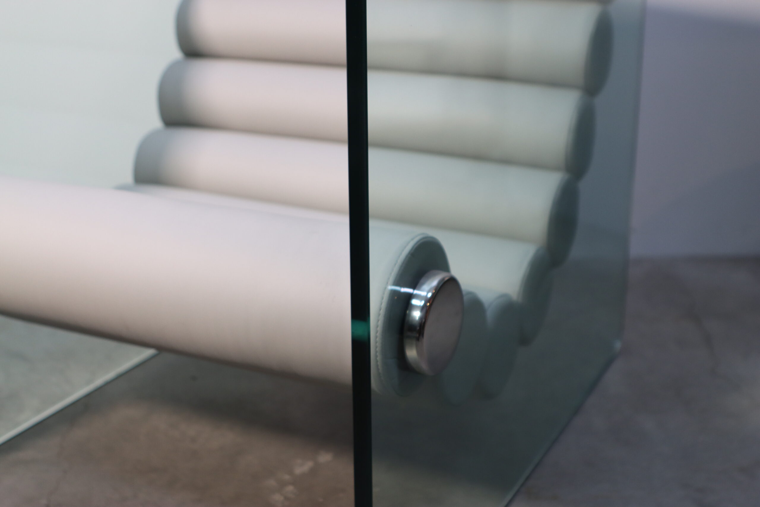 モダン・ガラスサイド・ラウンジチェアは、透明なガラスのサイドパネルが構造体となることで、クッションが空中に浮遊しているかのような「超現実的な視覚効果」を空間に付与します。
