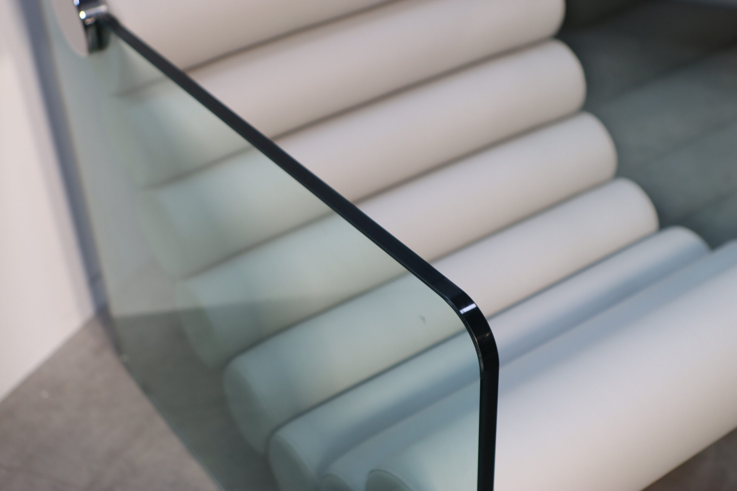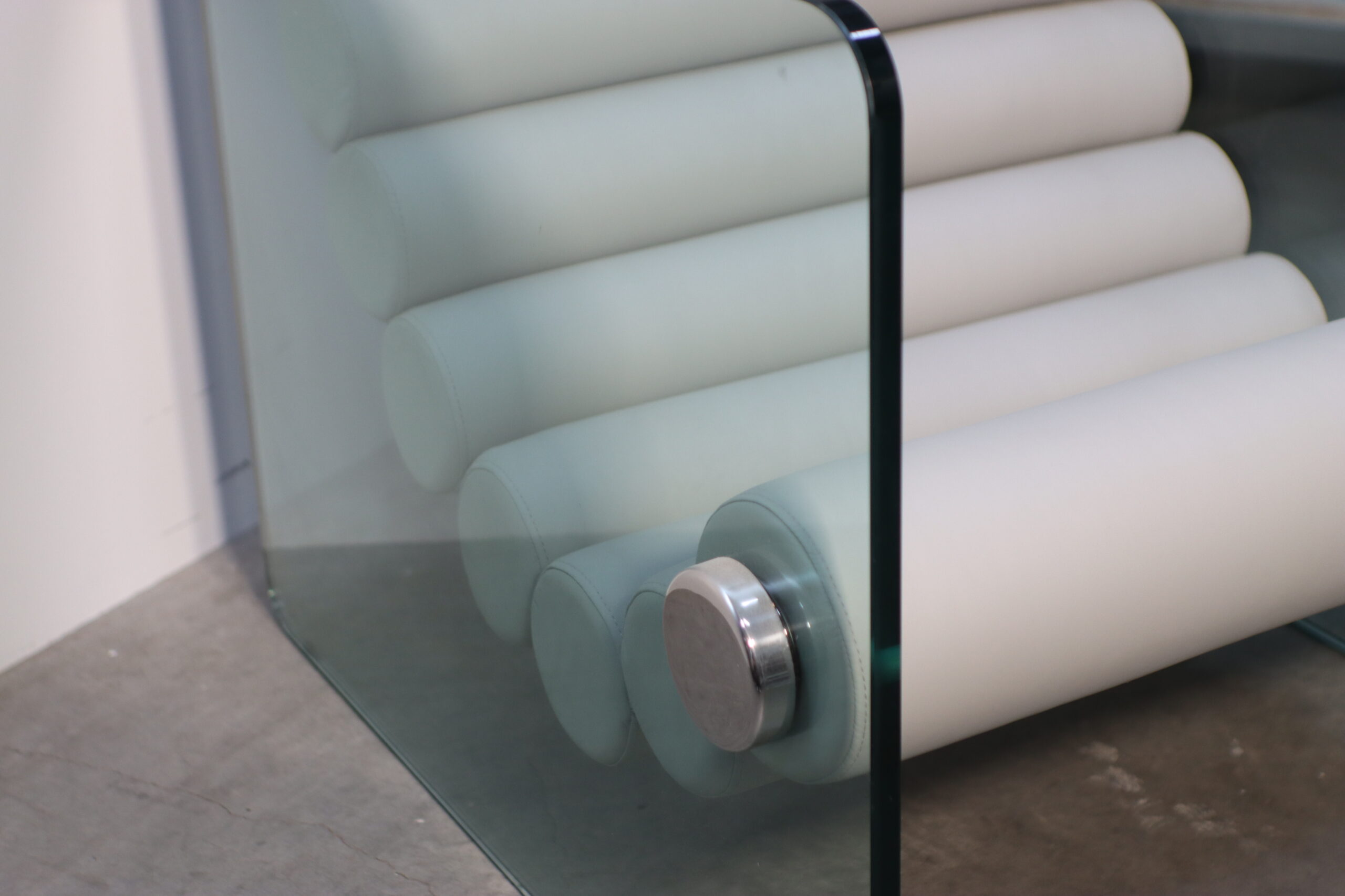 連続する円筒形のクッションが描く柔らかな曲線と、エッジの効いたガラスパネルの対比は、家具の概念を超えた「実用的なアートピース」として、空間のクリエイティビティを飛躍的に高めます。