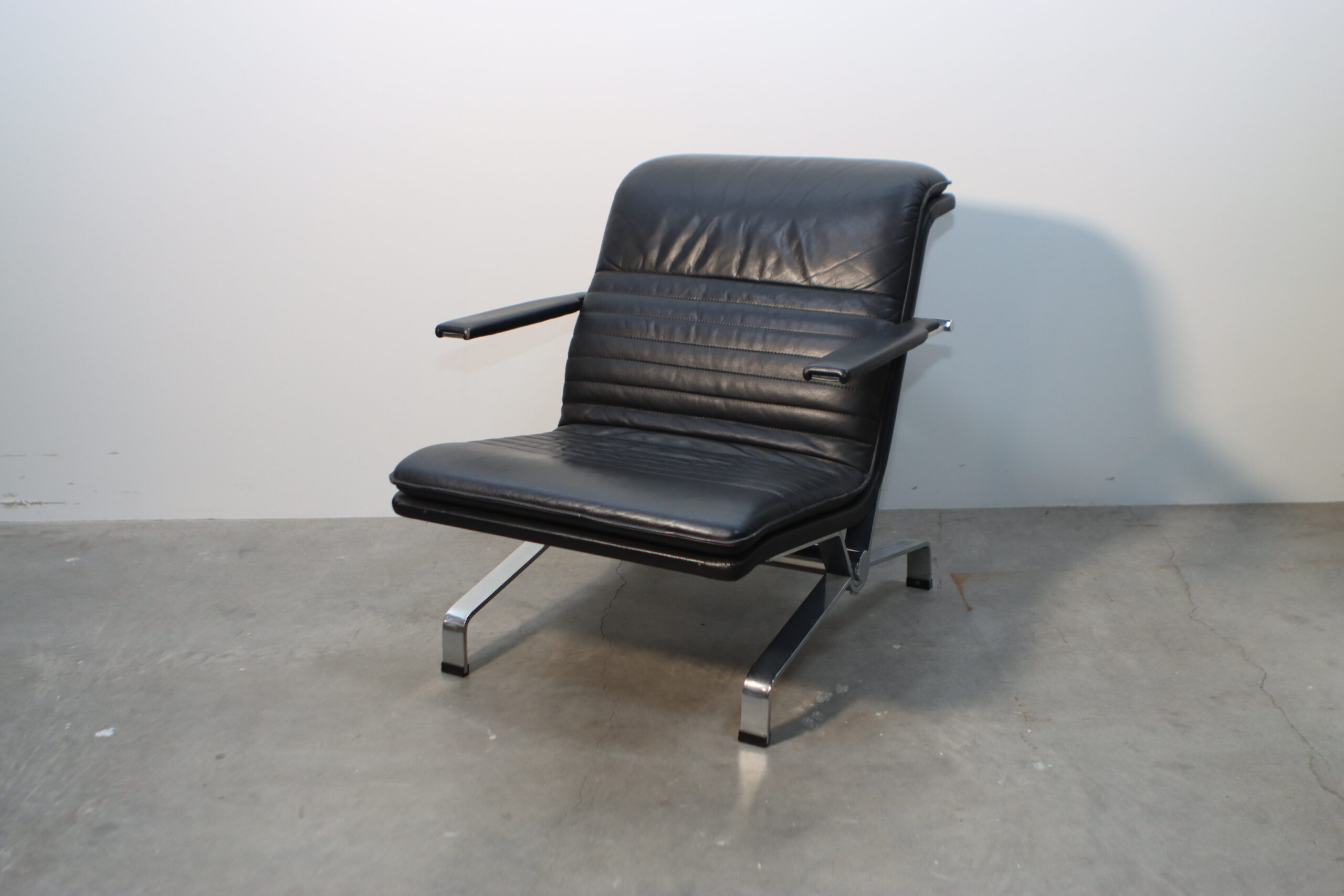 モダンなメカニカル・ベース:低重心で安定感のあるステンレス製の脚部が、クラシックなレザーの質感に都会的なエッジを加え、時代に流されない普遍的な美しさを放ちます。