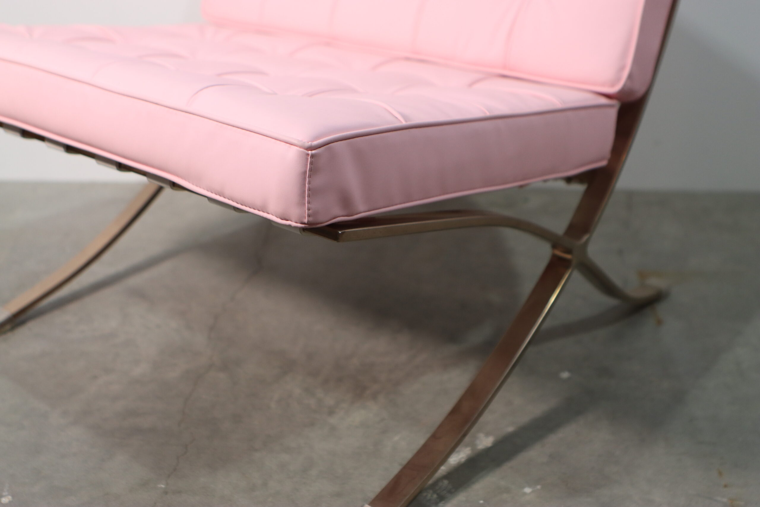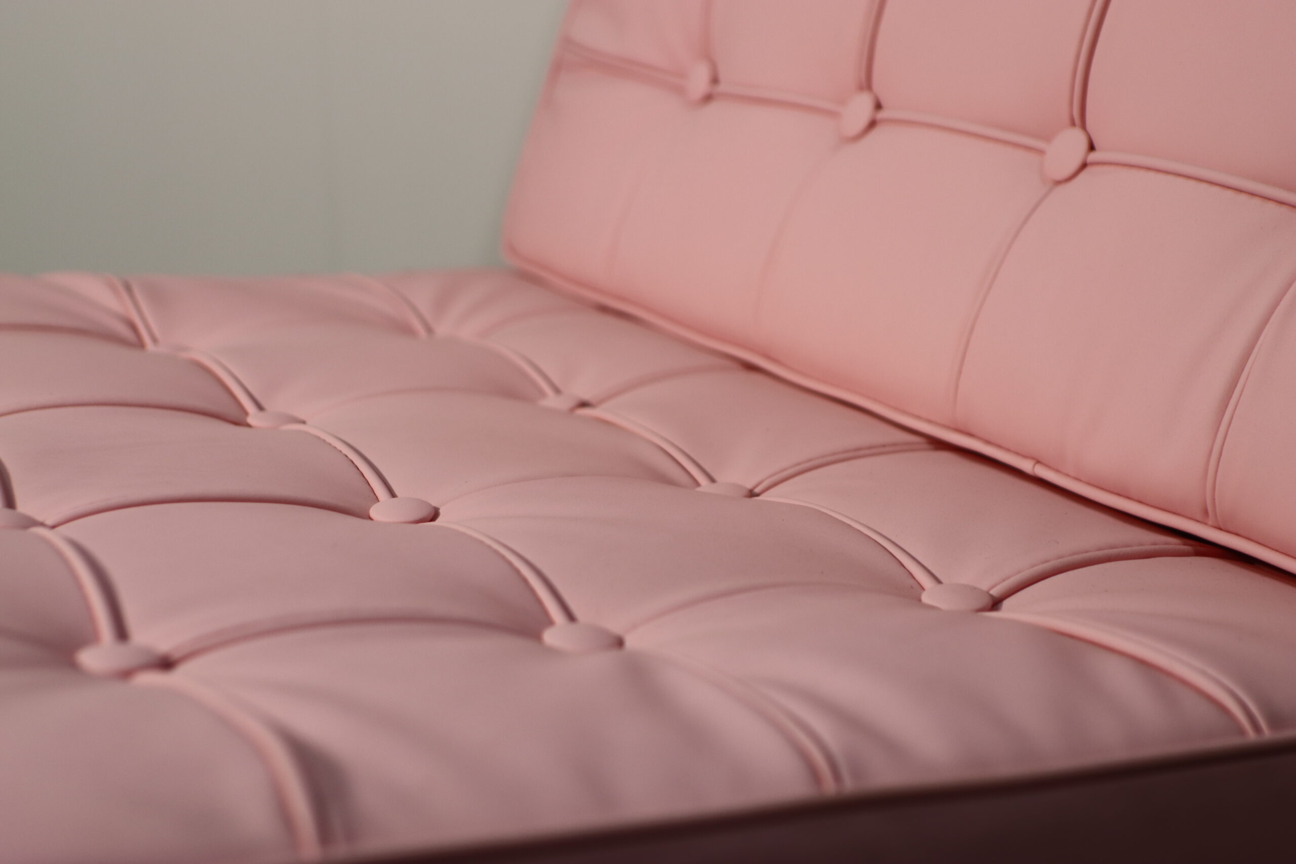 洗練されたステッチワーク: 精緻なボタン留めのキルティング加工と、シャープなX字型のクローム脚が、ポップな色調の中にラグジュアリーな高級感を同居させています。